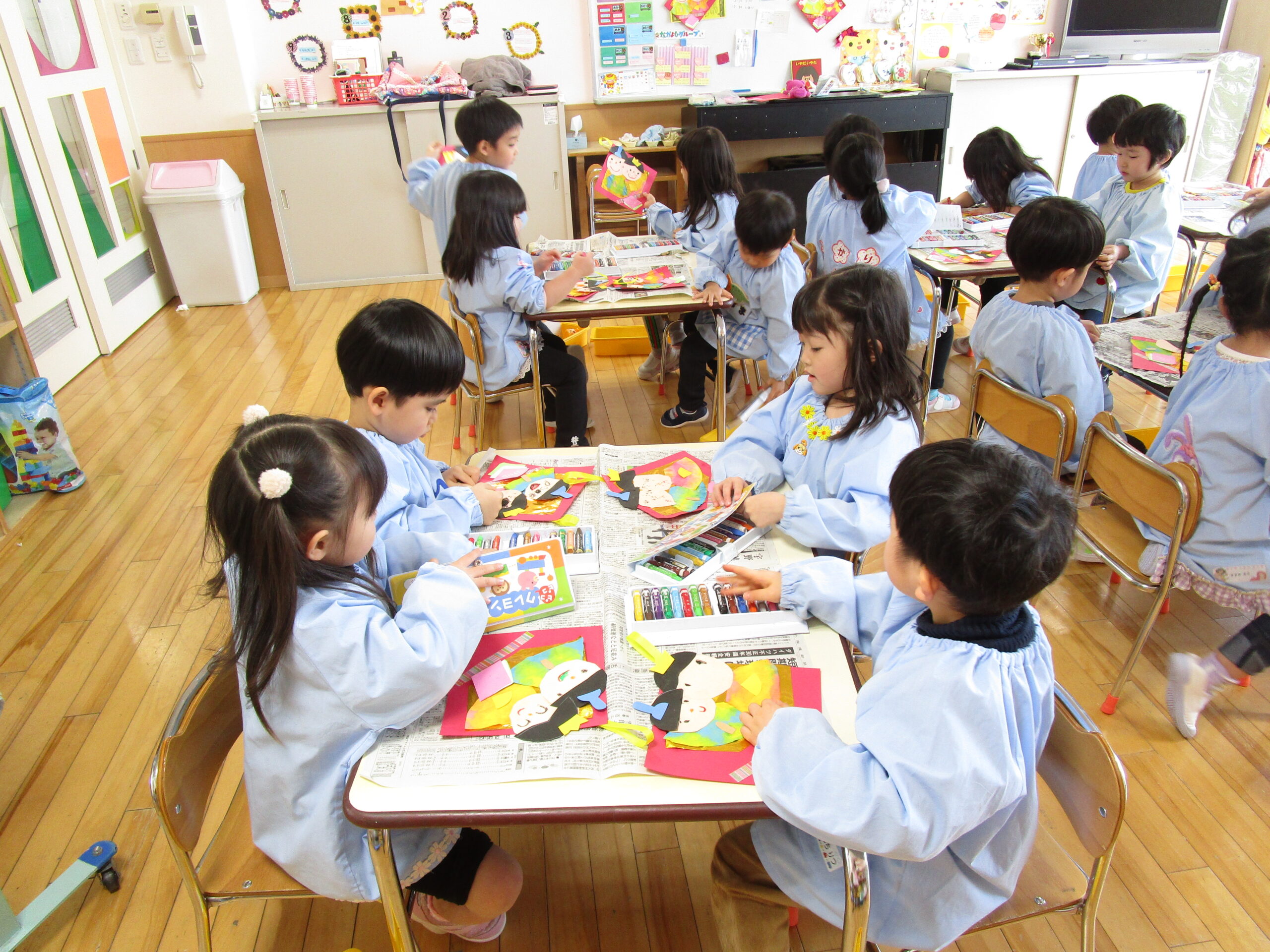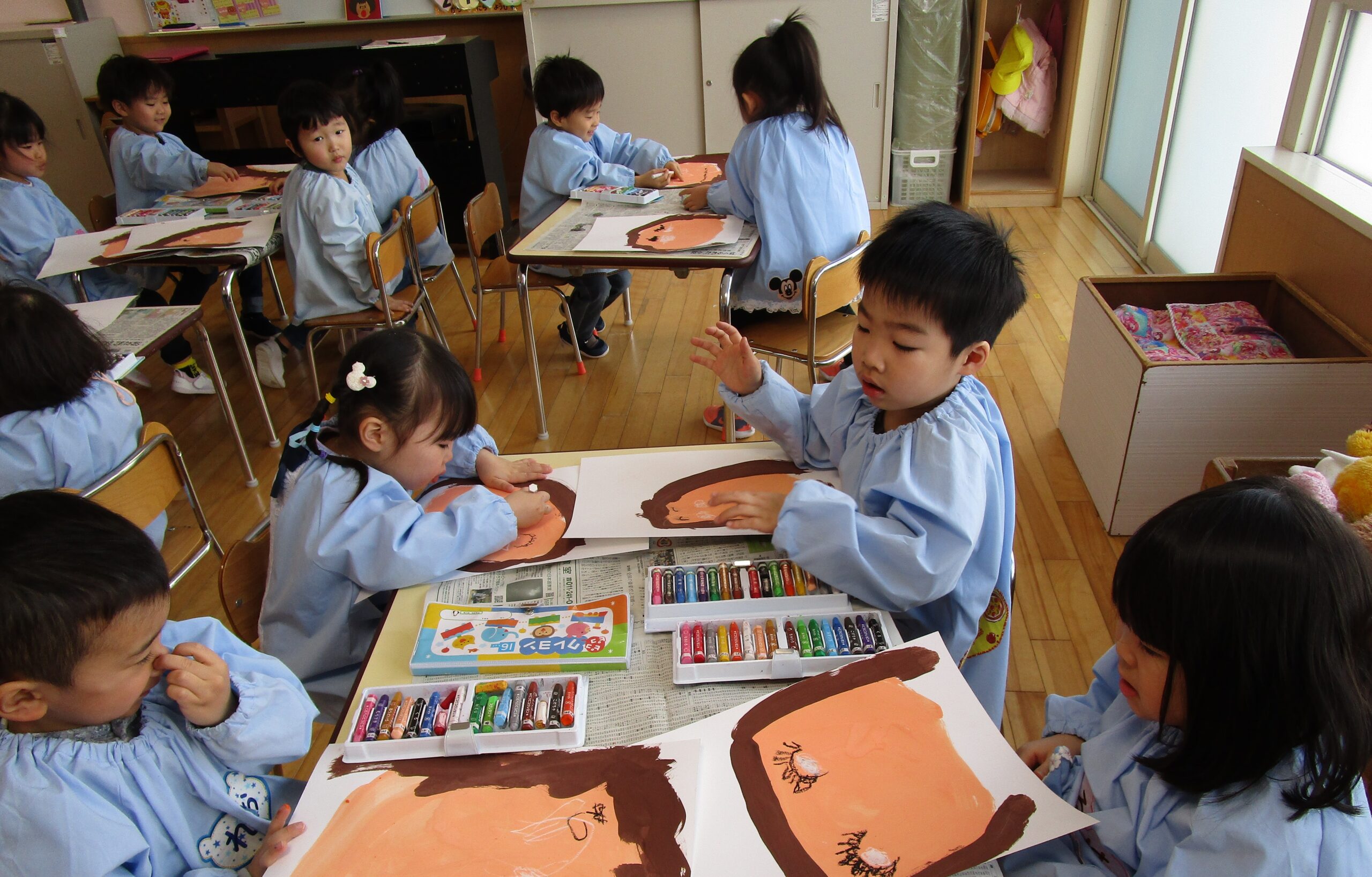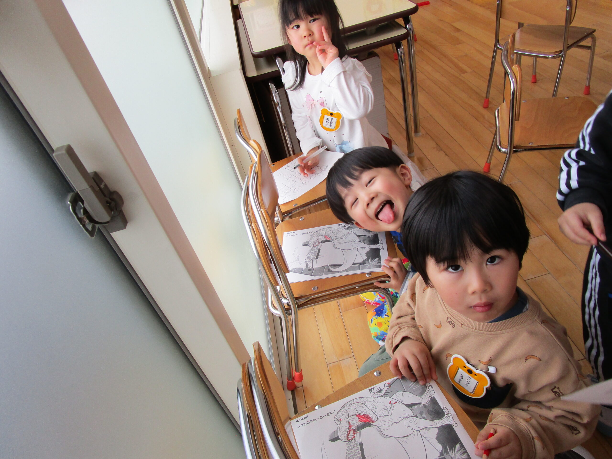 「先生の顔」は顔と髪の毛に絵の具を使い、顔のパーツはクレヨンを使ってちょっとリアルに描いてみました。「まゆげもちょっと茶色い」と先生の顔を観察しながら、個性溢れるいろんなお顔が仕上がりました♪