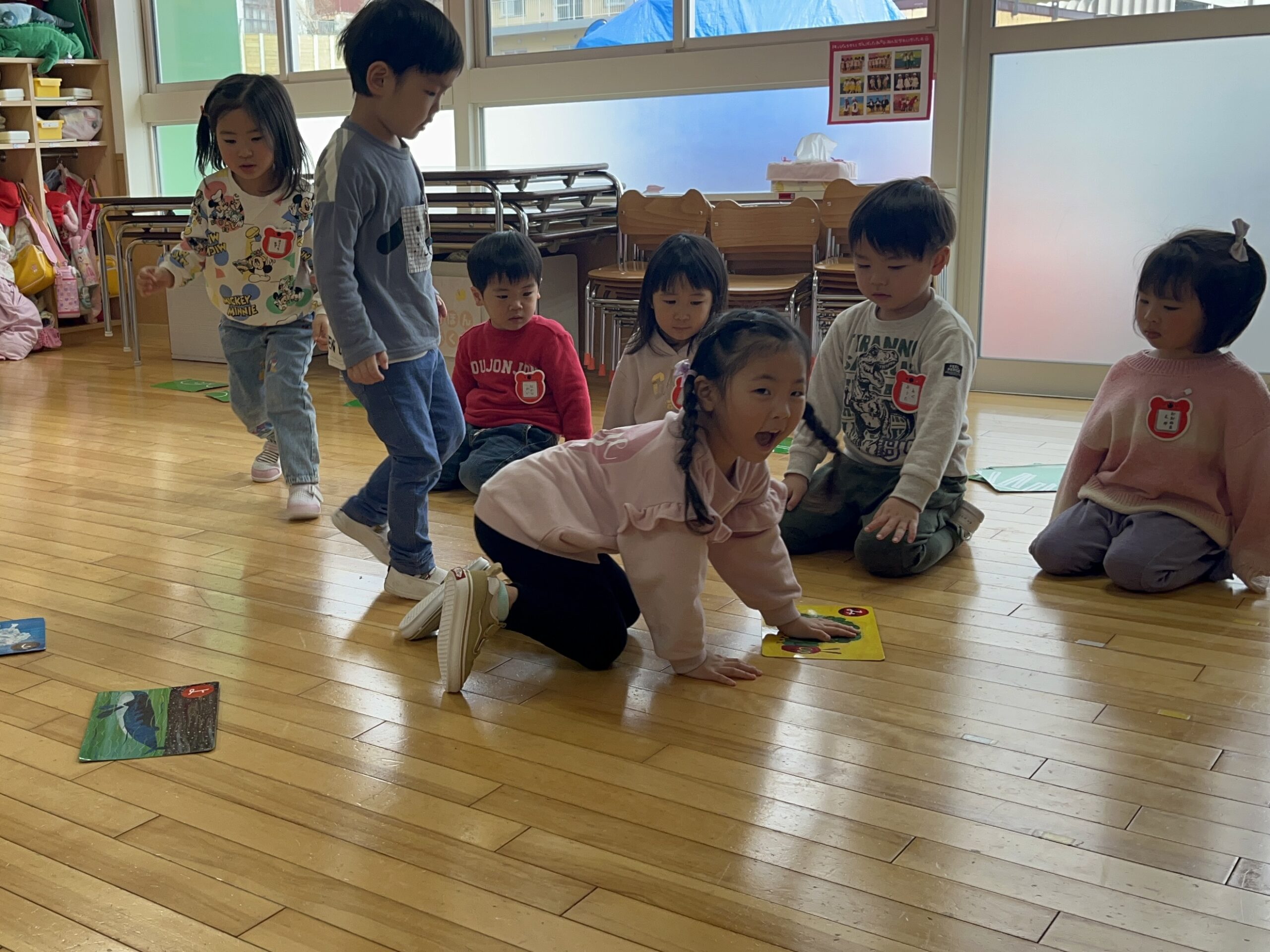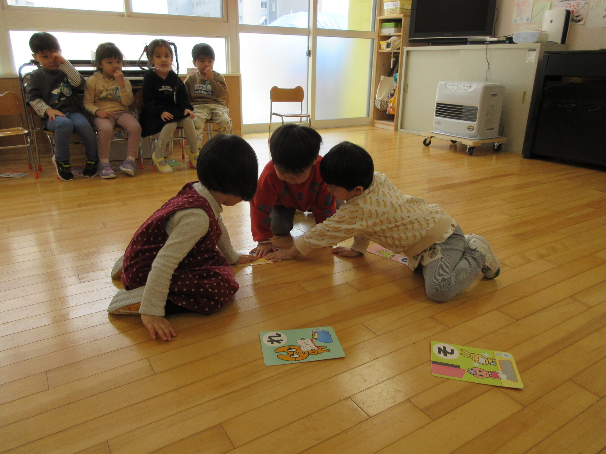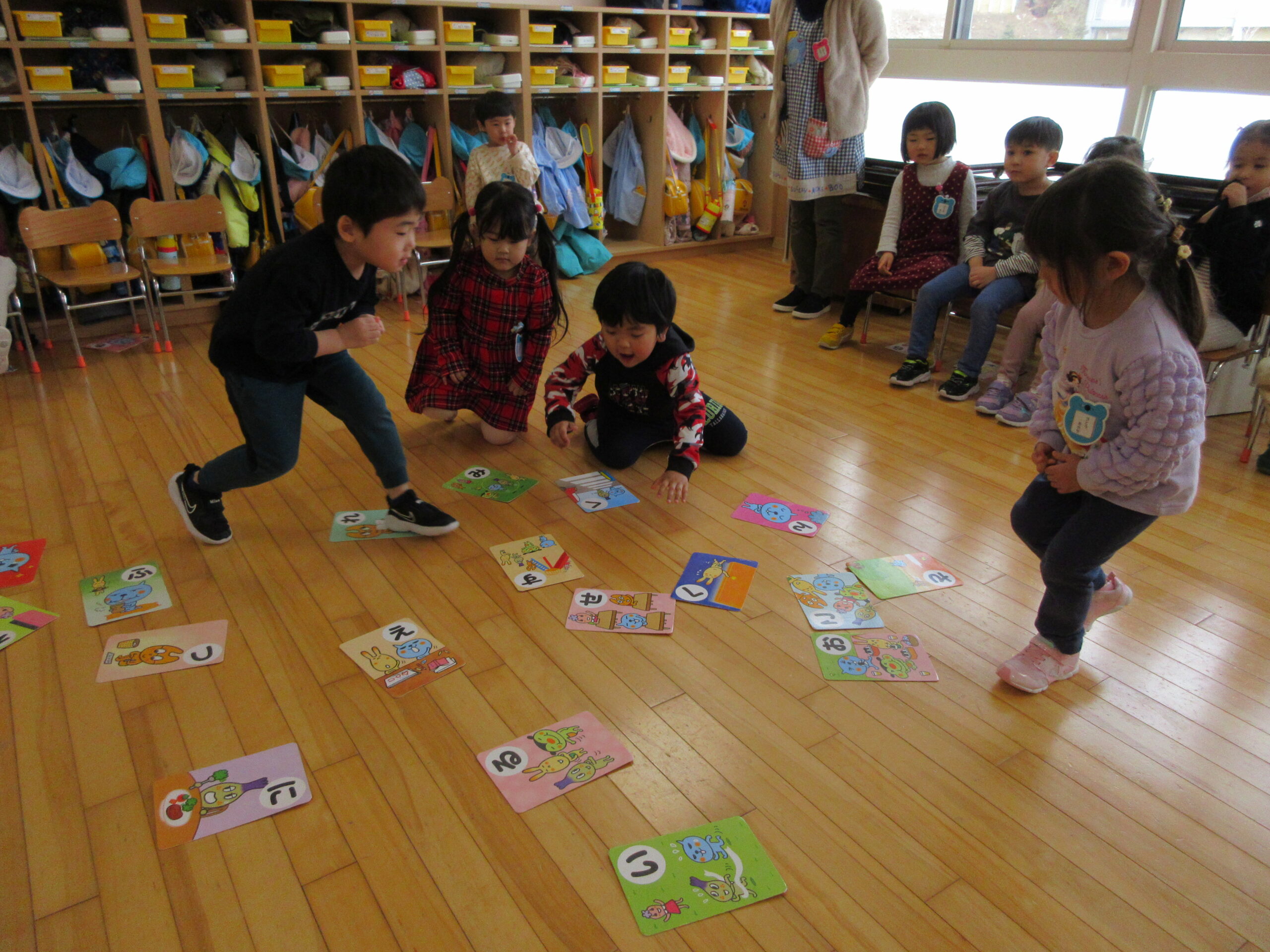 2月13日のかるたあそびでは、各クラス様々なグループに分かれて少人数で取り組み、取れた枚数が書かれたカードを初めて持ち帰りました。文字が読める子はまだ少ないので、ほとんどの子が絵を見て探しているようでした。繰り返し遊んでいるうちに取れる枚数も増えてきたので、これからもみんなでたくさん遊びたいと思います♪