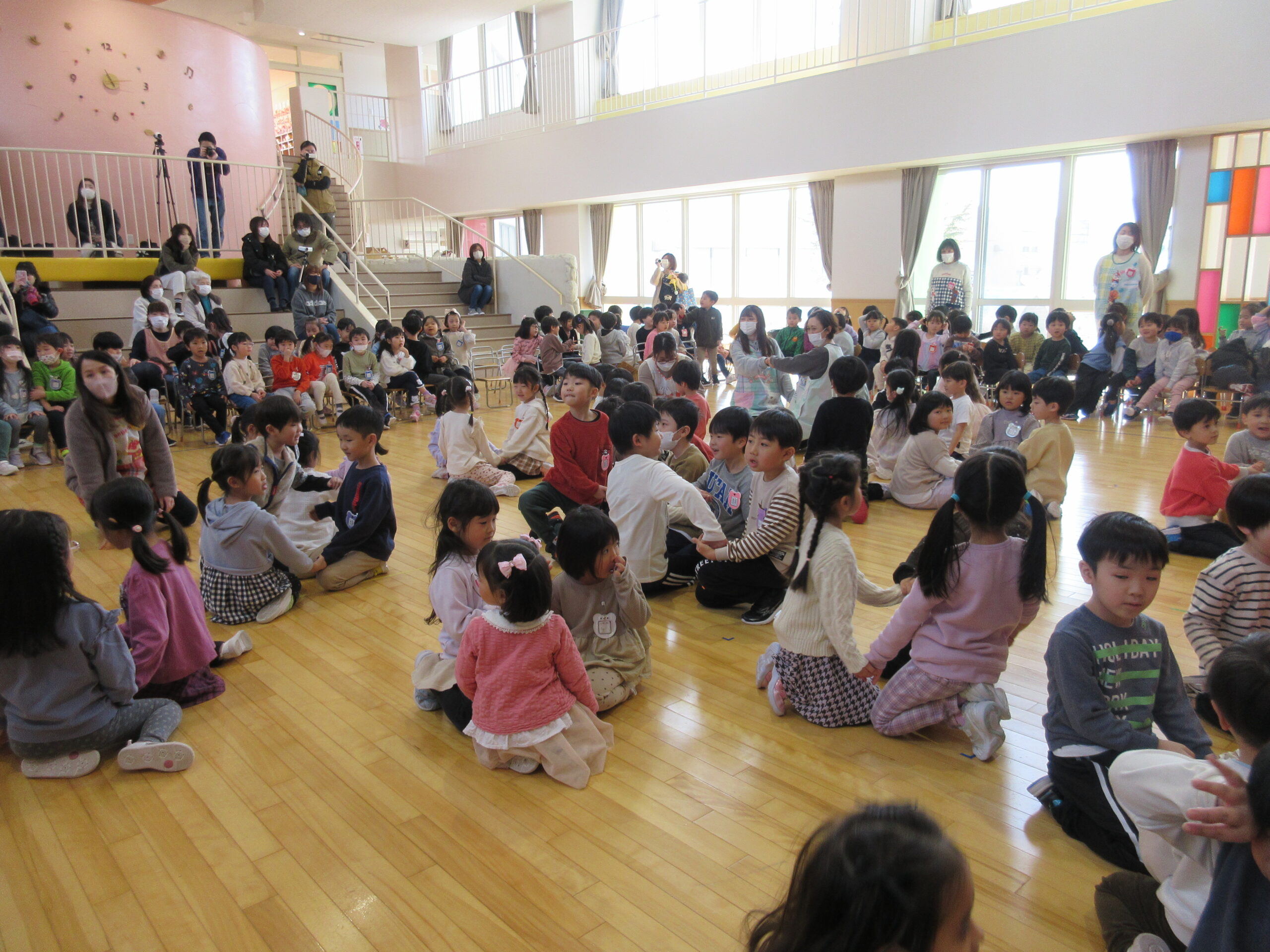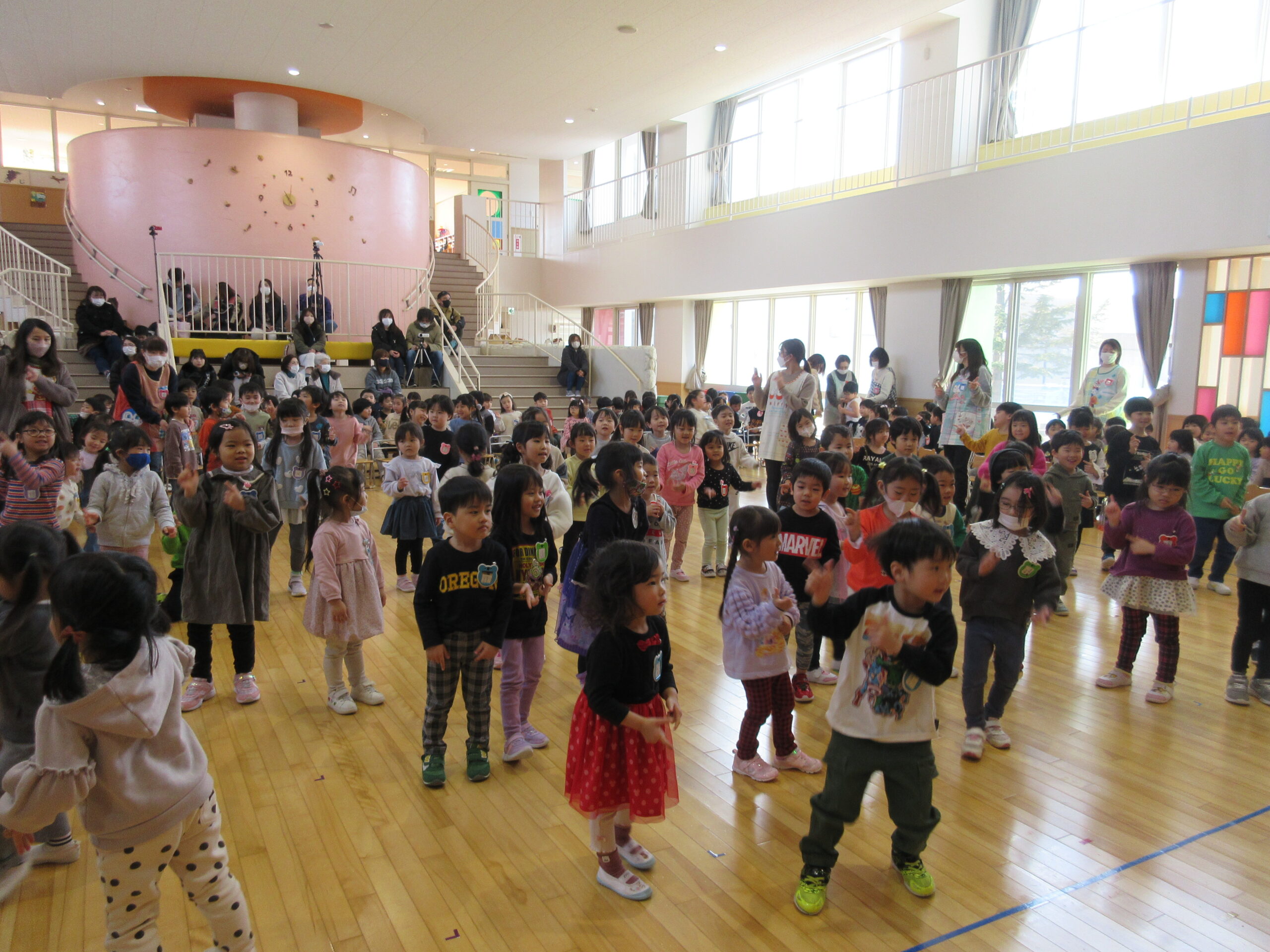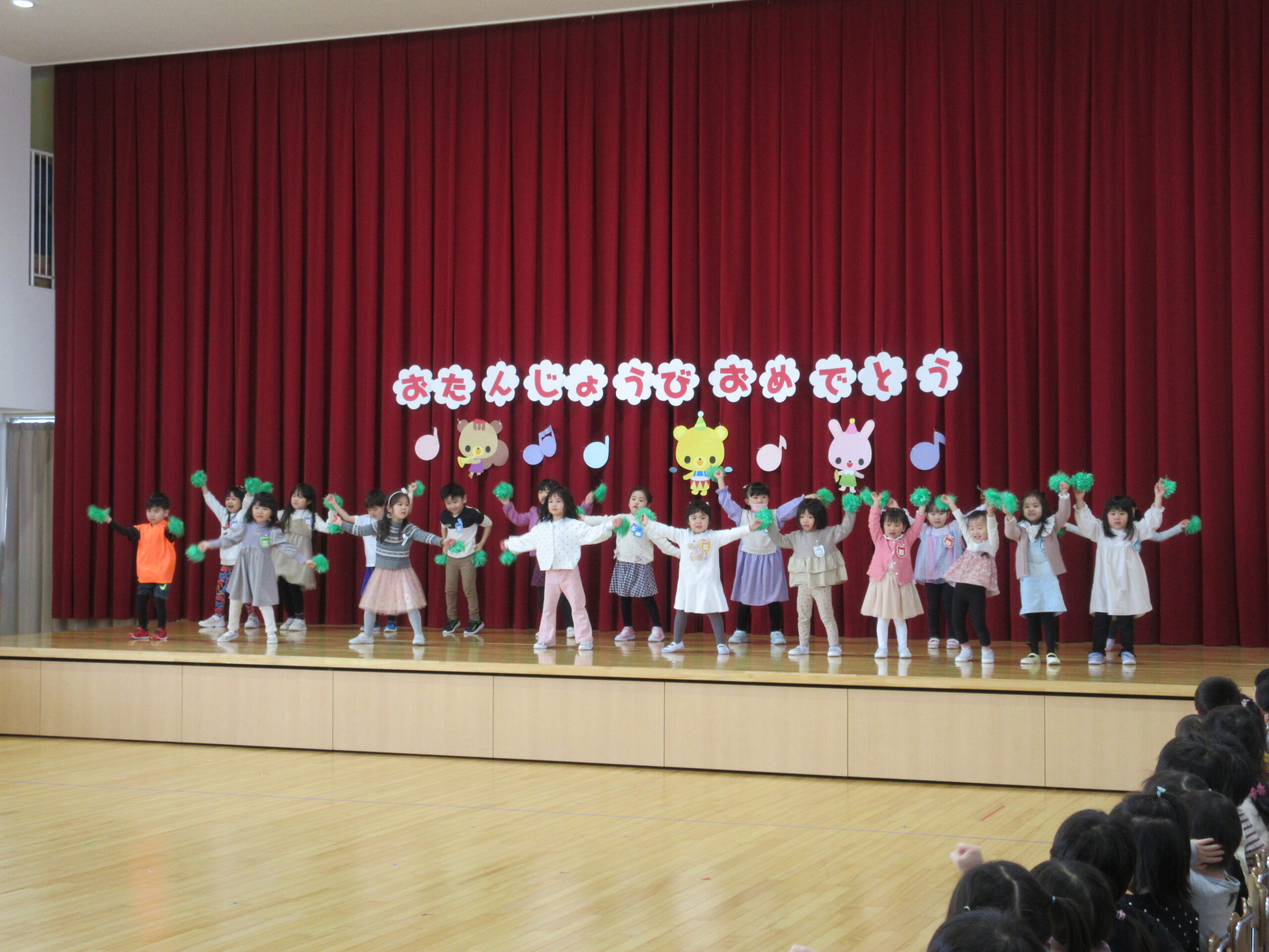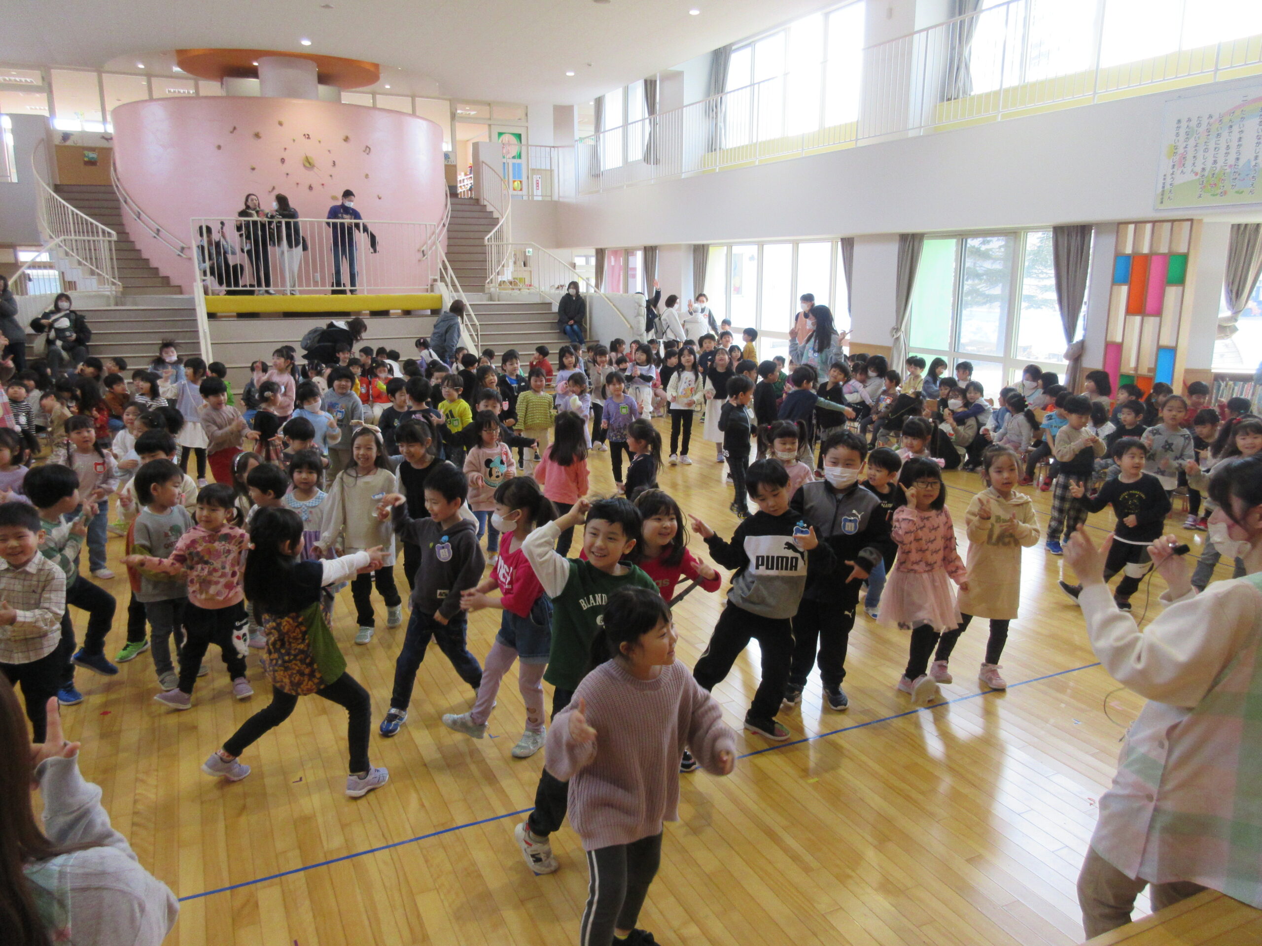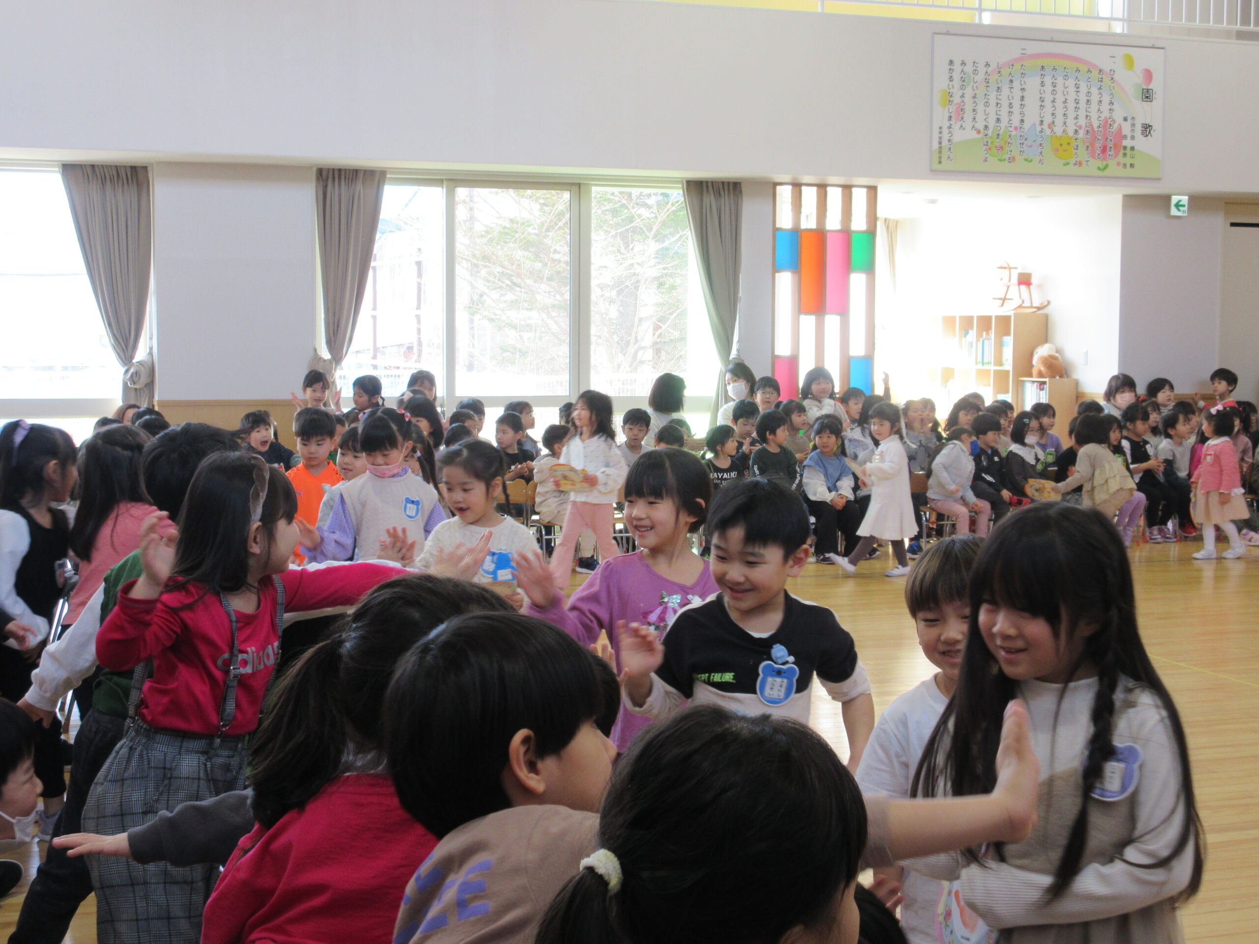 今日で2月が終わりです。今年はうるう年で1日多くお得な気持ちになりました。そして2月は「逃げる」と言いますが、走って逃げるかのように早く過ぎました。今日は2月生まれのお誕生会でした。19名の誕生児で女の子が多かったですね。自己紹介やポンポンを持っての踊りアラレちゃんの「ワイワイワールド」を披露しました。誕生会後は全園児で猛獣狩りゲームで楽しみました。色々なたくさんの動物がでてきて人数を数えるのに夢中になっていましたね!
