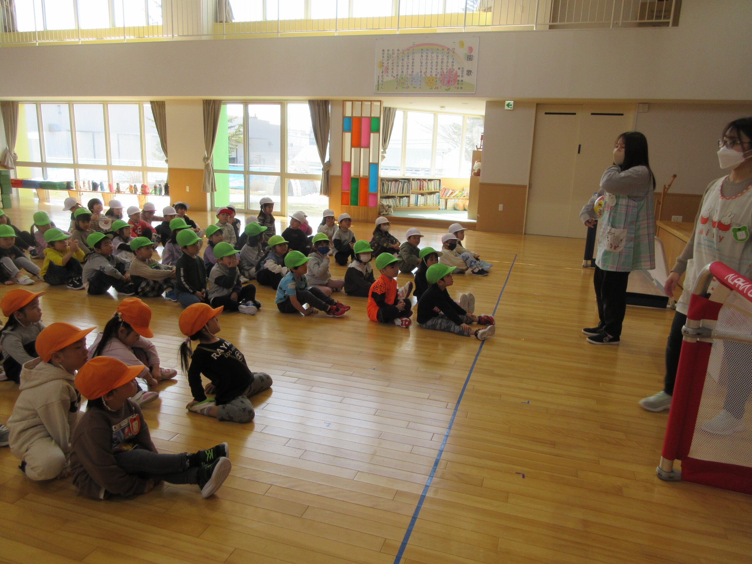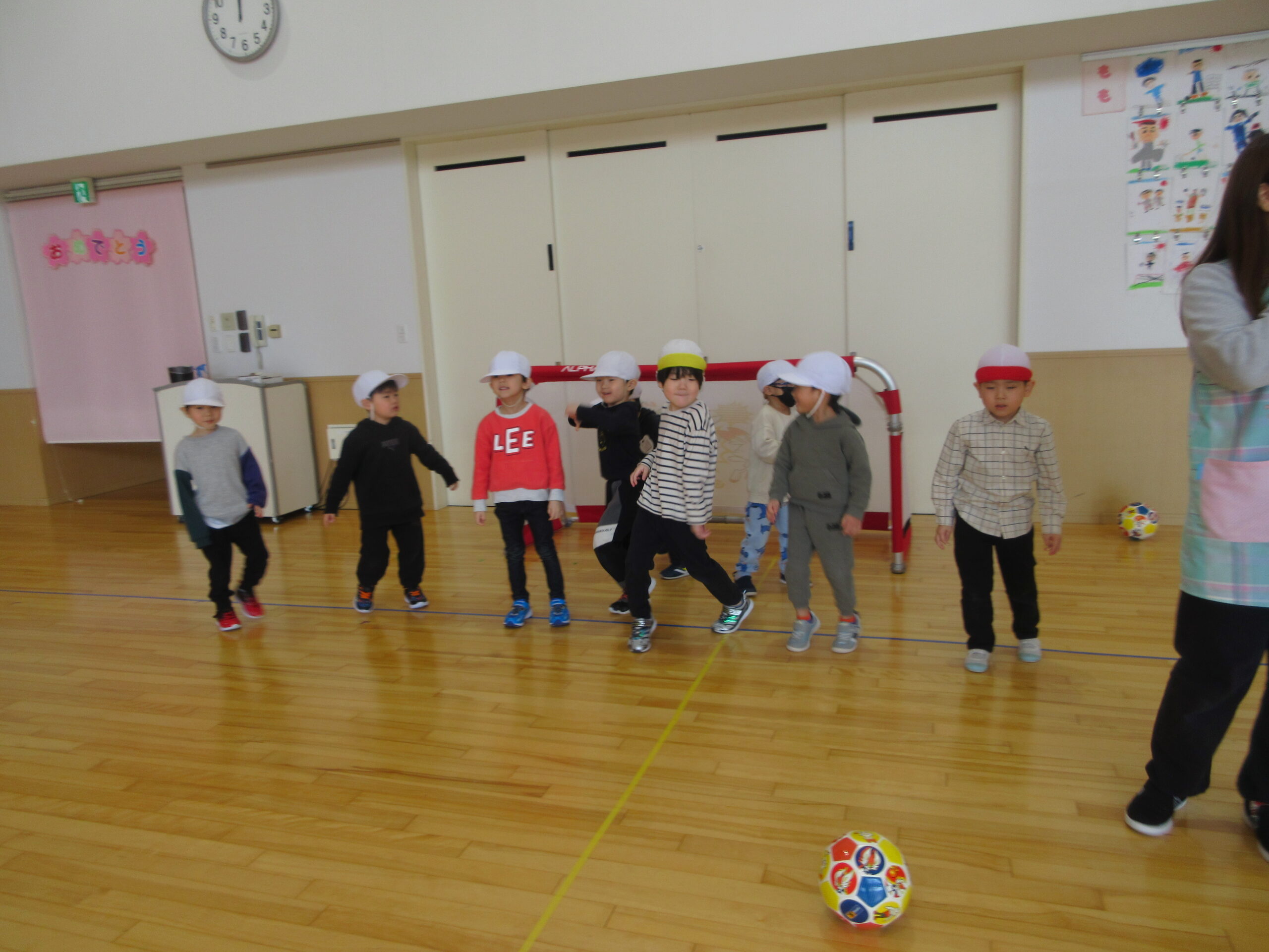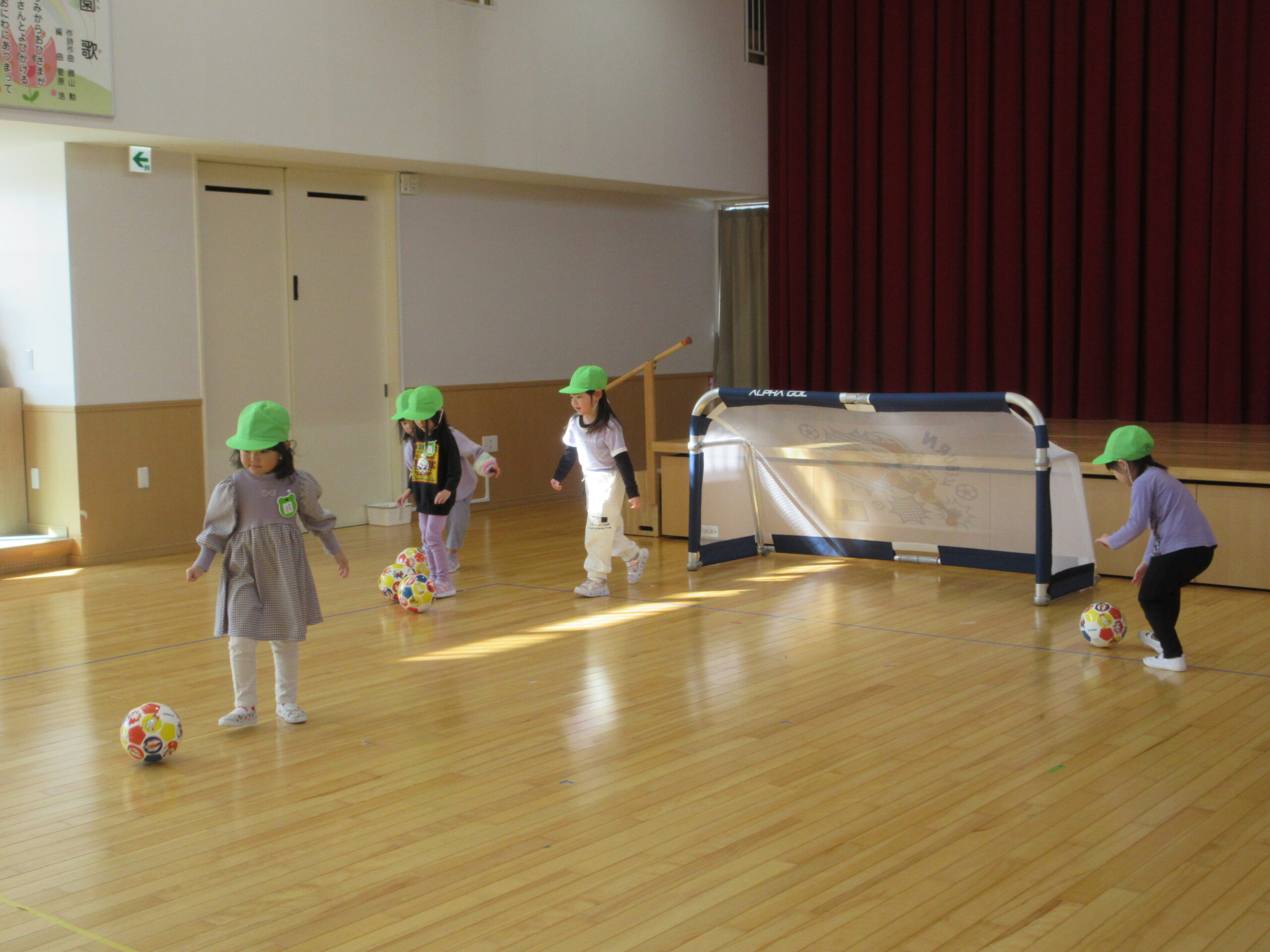 (135)令和5年度「年中学年 様子」 2024年2月29日 園内ブログ 本日2月29日(木)カリキュラムを変更し『日本サッカー協会』から寄贈していただいた、ボールとゴールを使って誕生会後にサッカー遊びを行いました。7月のサッカー教室では、手や足を使って、ボールに触れることを中心に行っていましたが、今日のサッカーあそびではドリブルをしたり、試合をしたりと、足と体をたくさん動かして楽しみました。本日は時間が短く、子どもたちから「もっとやりたい」との声がたくさんあがったので、また取り組みたいと思います。