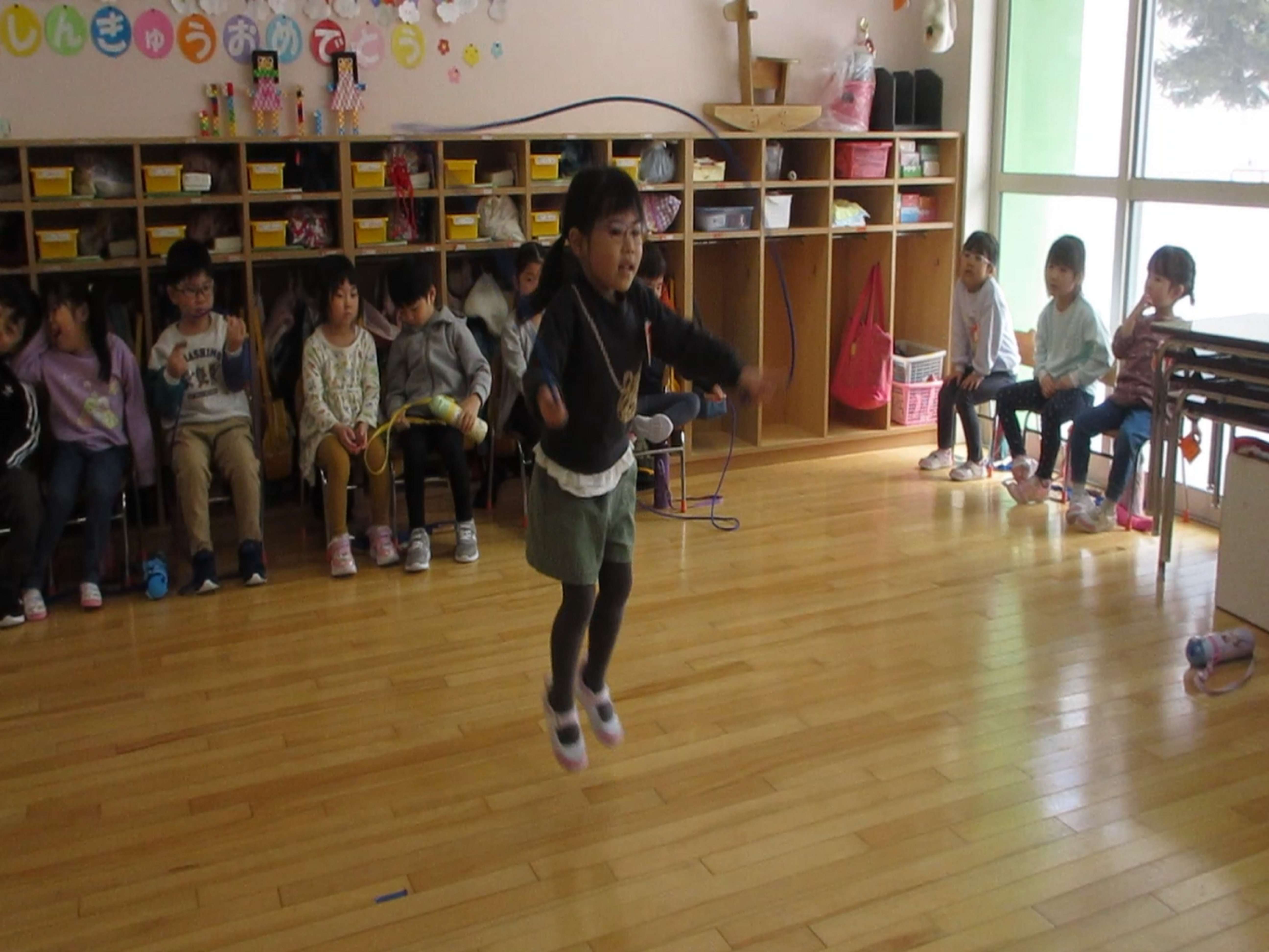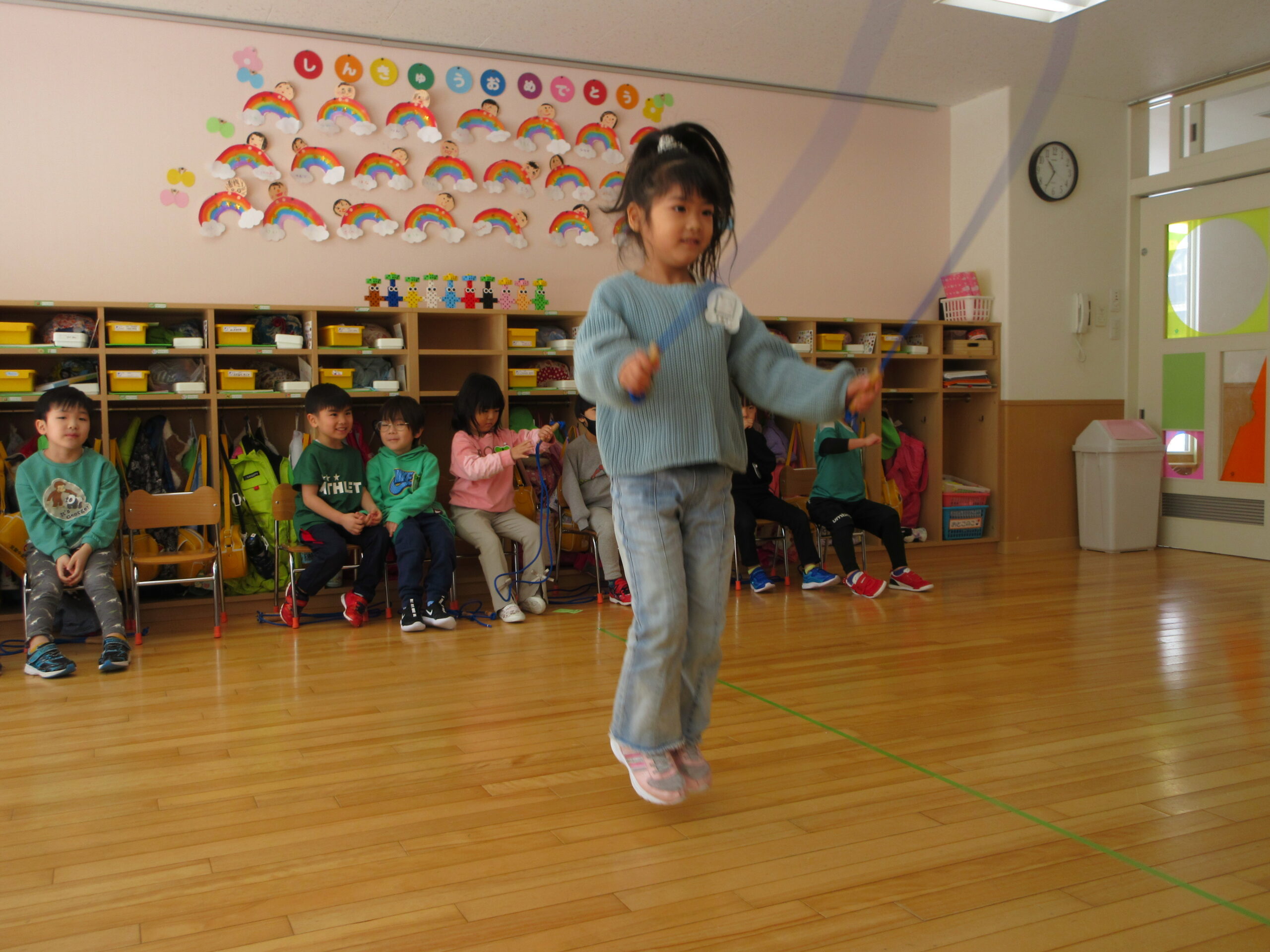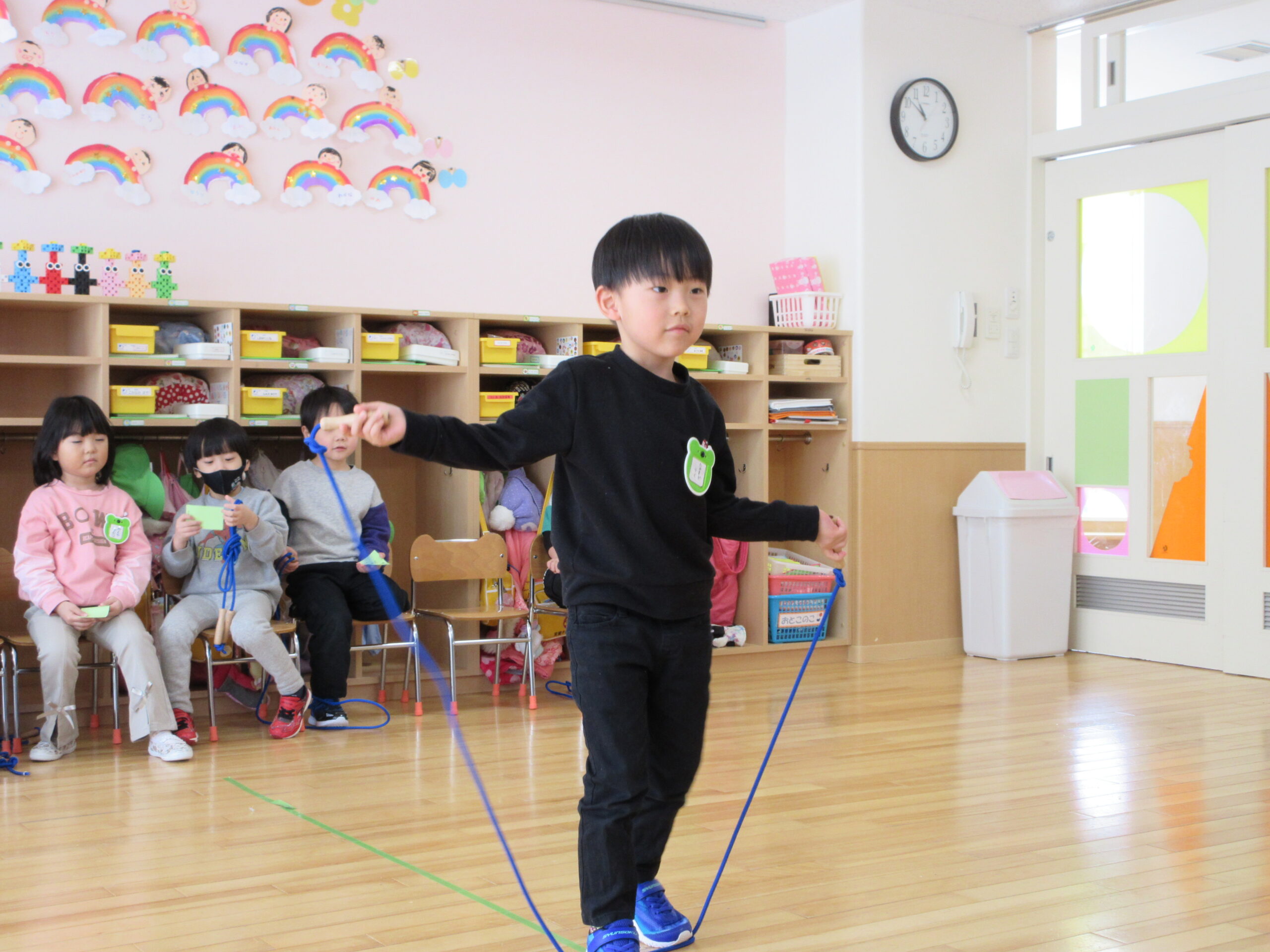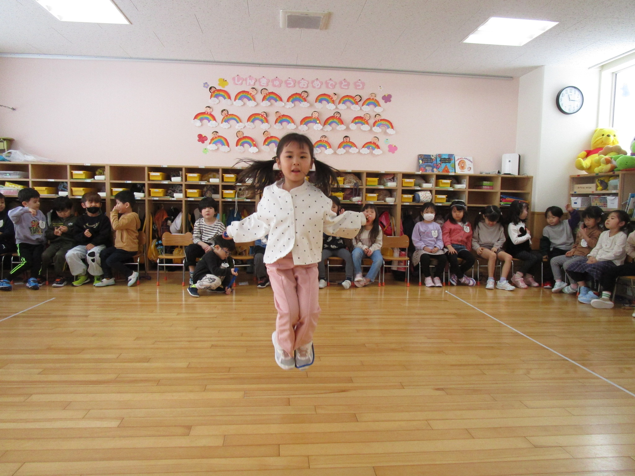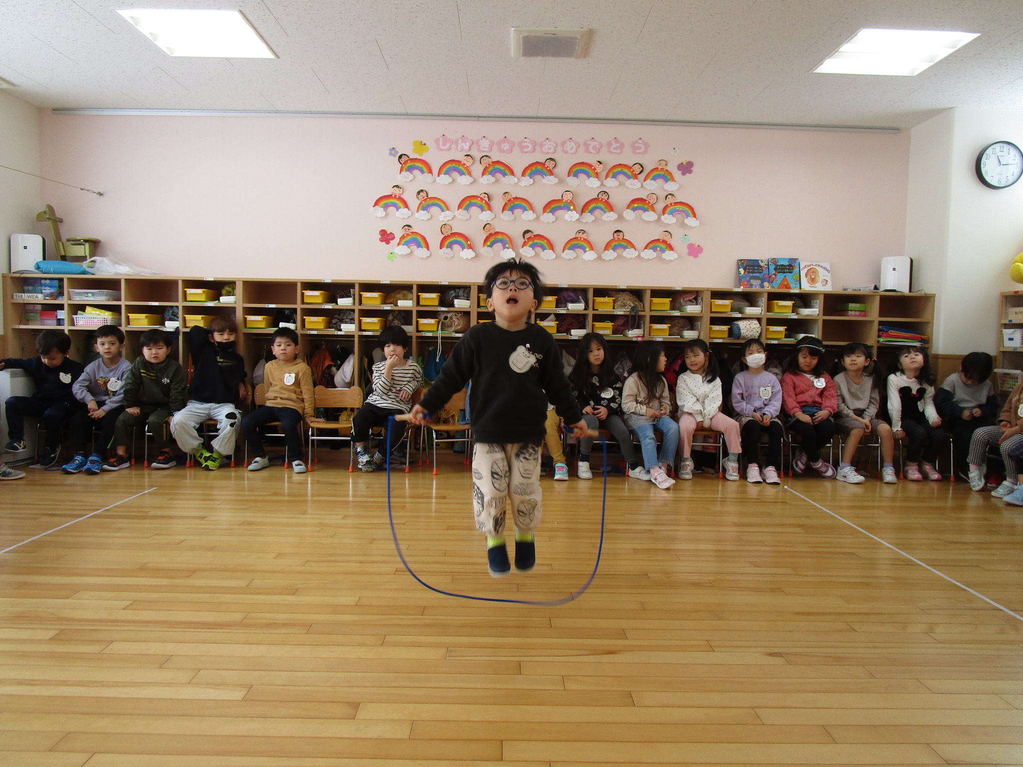 (137)令和5年度「年中学年 縄跳び大会」 2024年3月4日 園内ブログ 年中学年最後のなわとび大会を各お部屋で行いました。2学期から一生懸命、なわとび練習に取り組んできましたが前回の大会よりも跳べるようになり成長を感じました。緊張で思い通りに成果を発揮できず、悔しい思いをしたお友達もいましたが年長さんになってからの大会で、力を発揮できるよう引き続き練習に励んでほしいと思います。 今日の病気欠席者は、発熱3名、嘔吐4名、咳2名、腹痛・下痢2名、体調不良2名、大事をとって4名です。 ✨蒸しパン会食✨