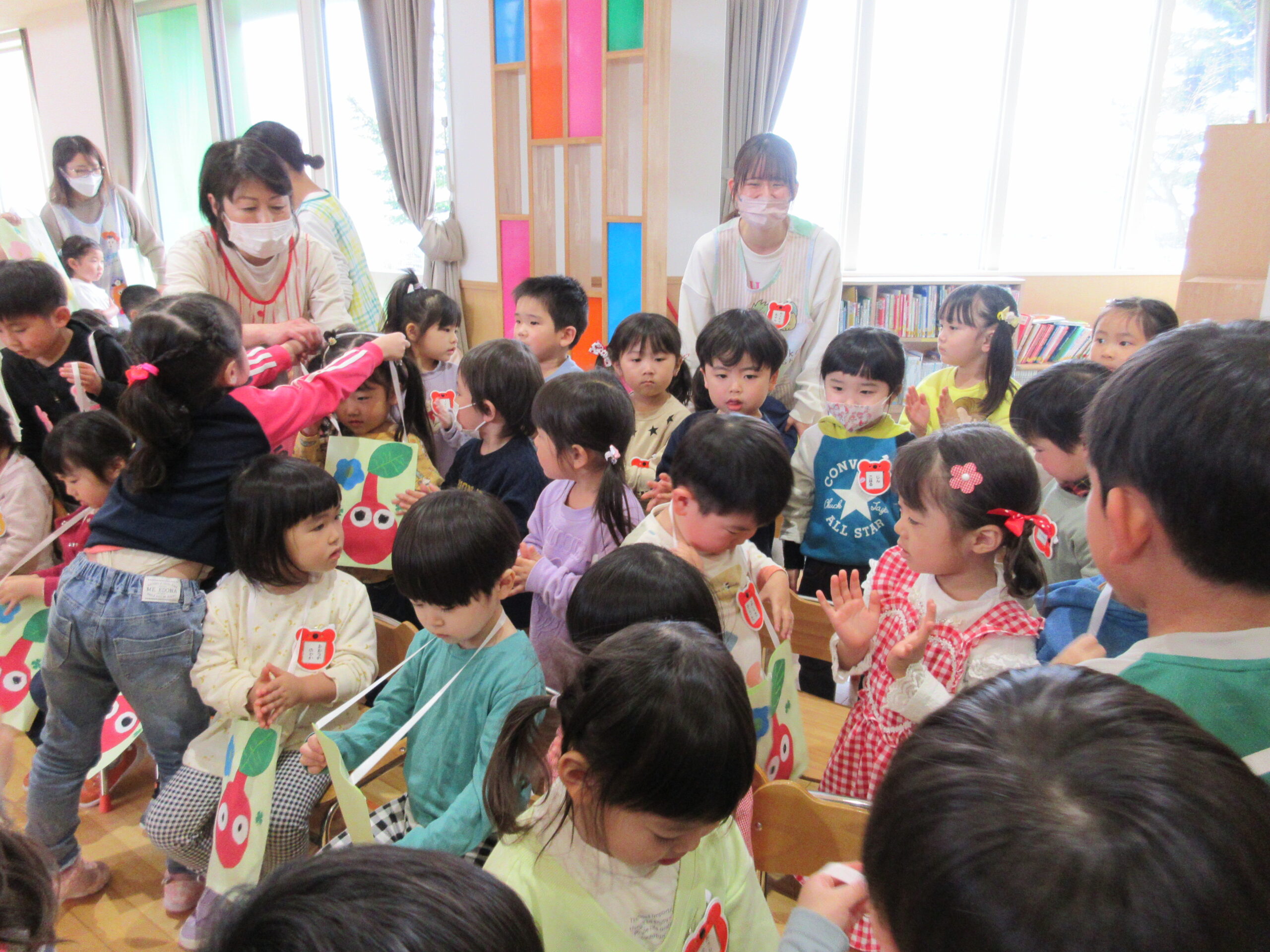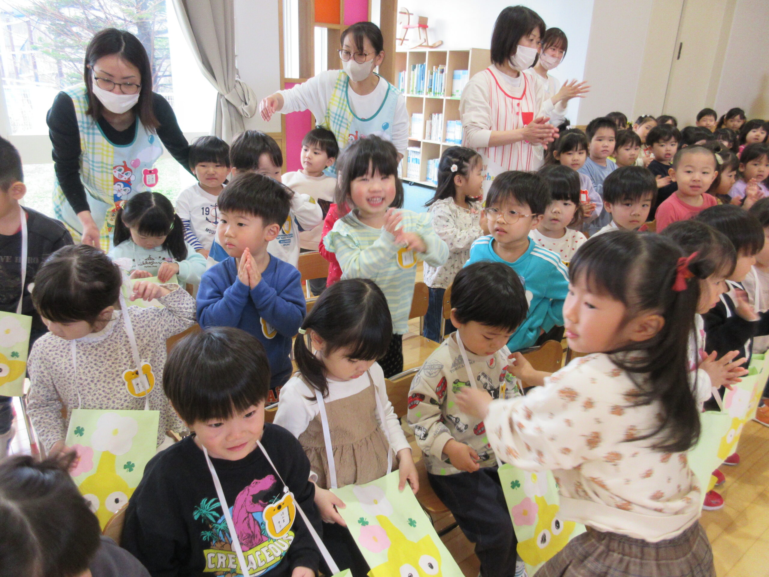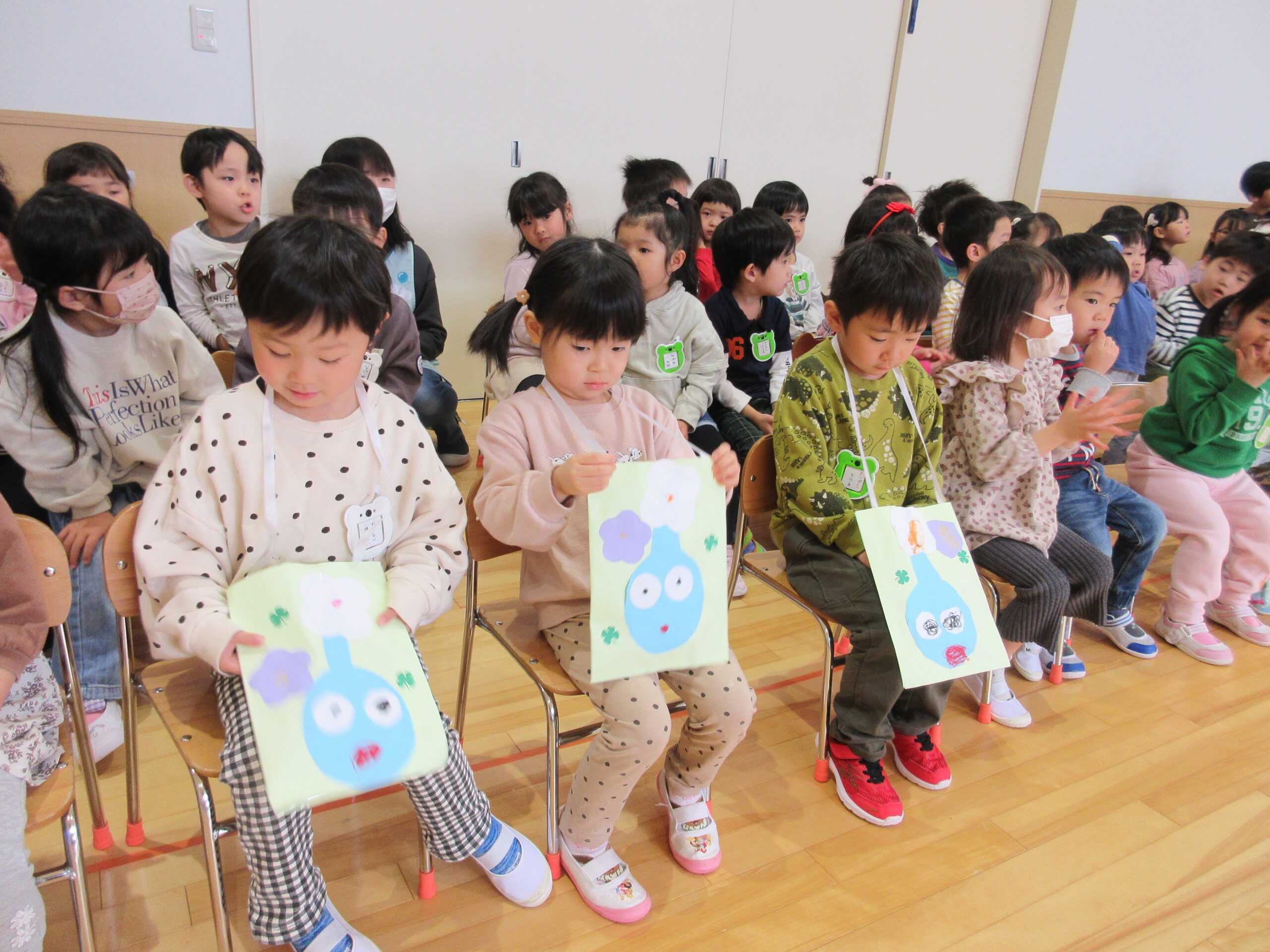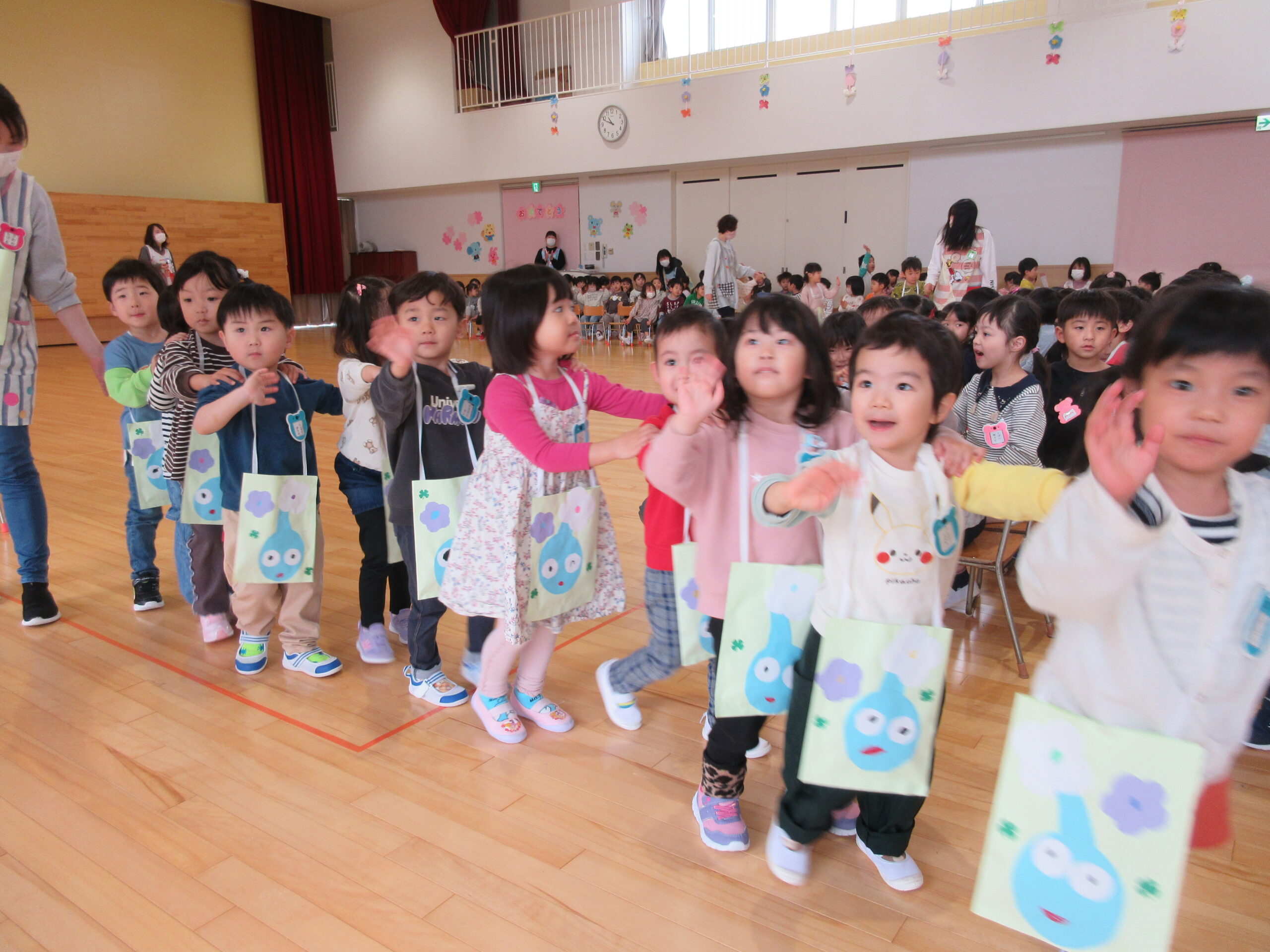 (11)令和6年度「対面式」 2024年4月25日 園内ブログ 今日4月25日(木)は在園児と新入園児との対面式を園ホールにて行いました。手話で挨拶をする在園児は頼もしく活き活きとした表情で新入園児を向かい入れていました。今年度は年長学年による製作「ピクミン」の袋におやつが入っていることに喜ぶ姿が見られました。プレゼントを首から掛けて満面の笑みの子ども達でした。 今日の病気欠席者は、風邪3名、発熱4名、咳4名、体調不良2名、大事をとって4名です。 🍙今日の給食🍙