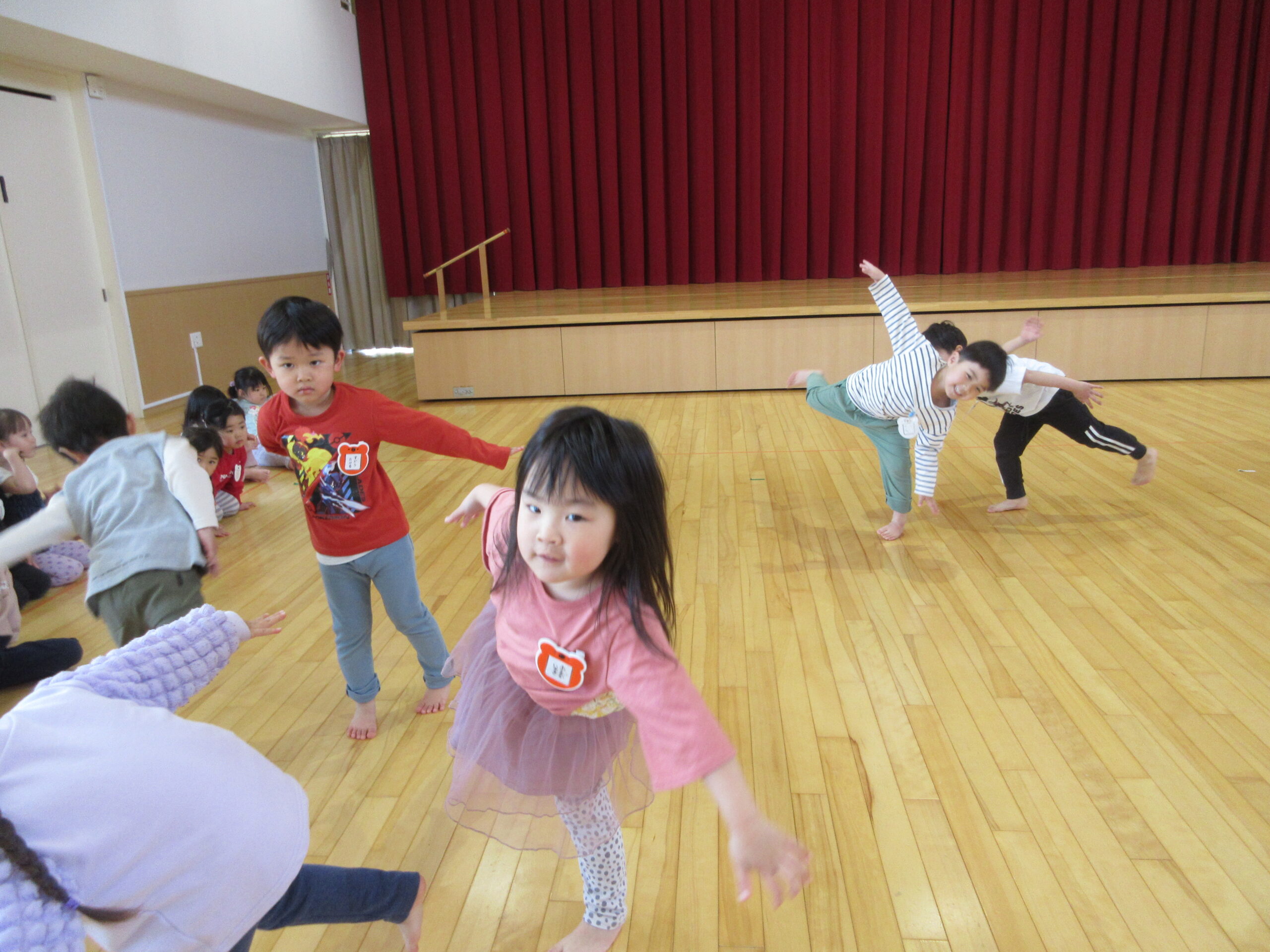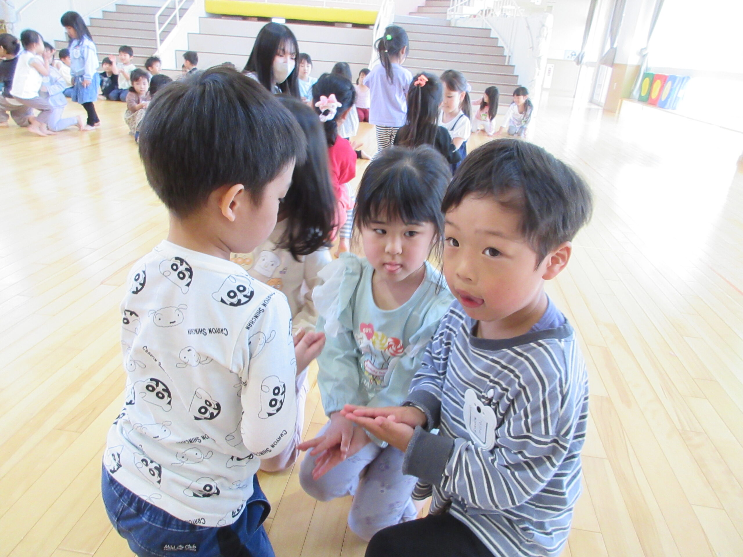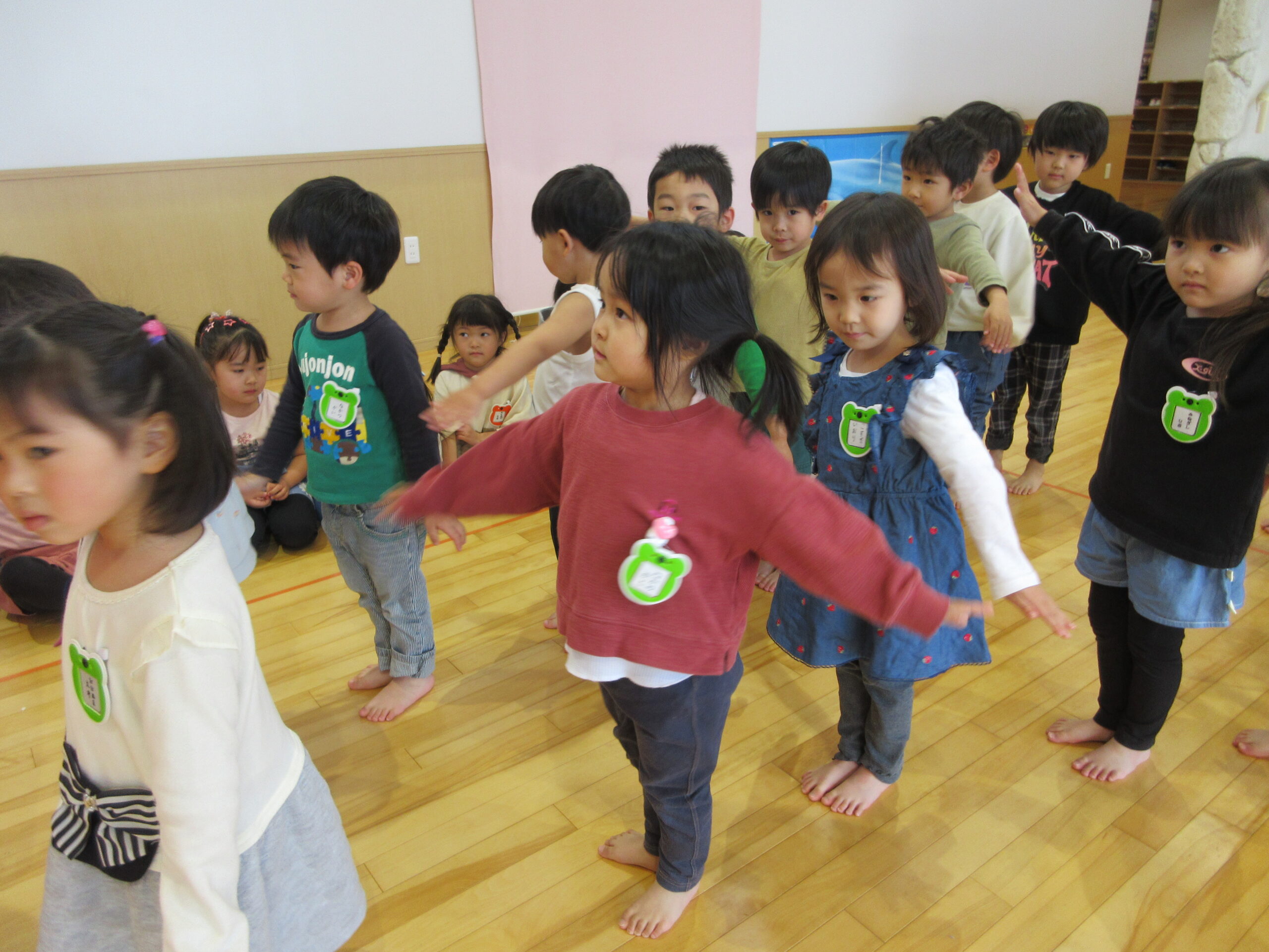 新年度になり昨日、初めてのリズム体操を年中学年で行いました。先日、年長学年のリズム体操を見学したことで、お兄さん・お姉さんのように頑張ることができました。