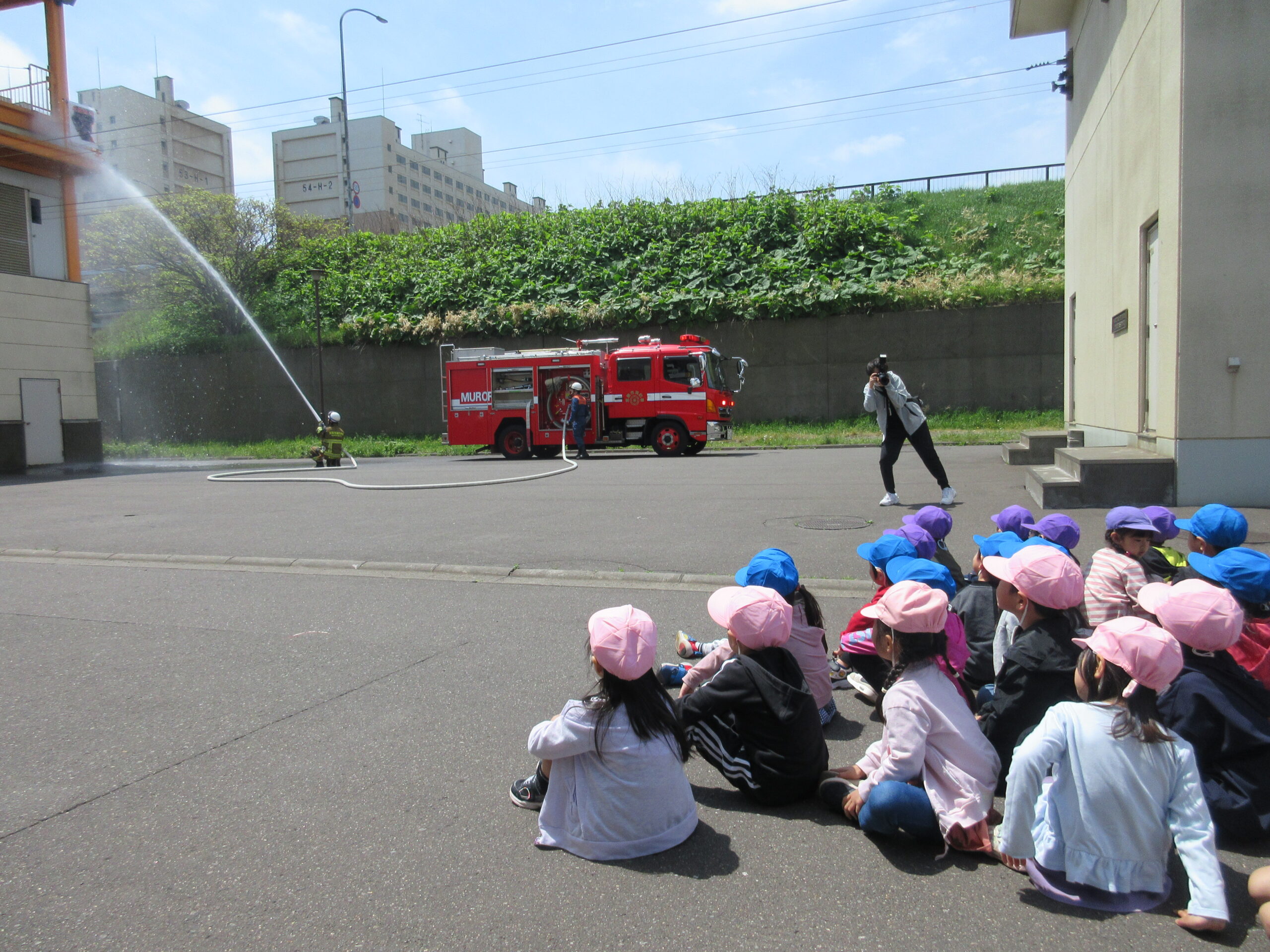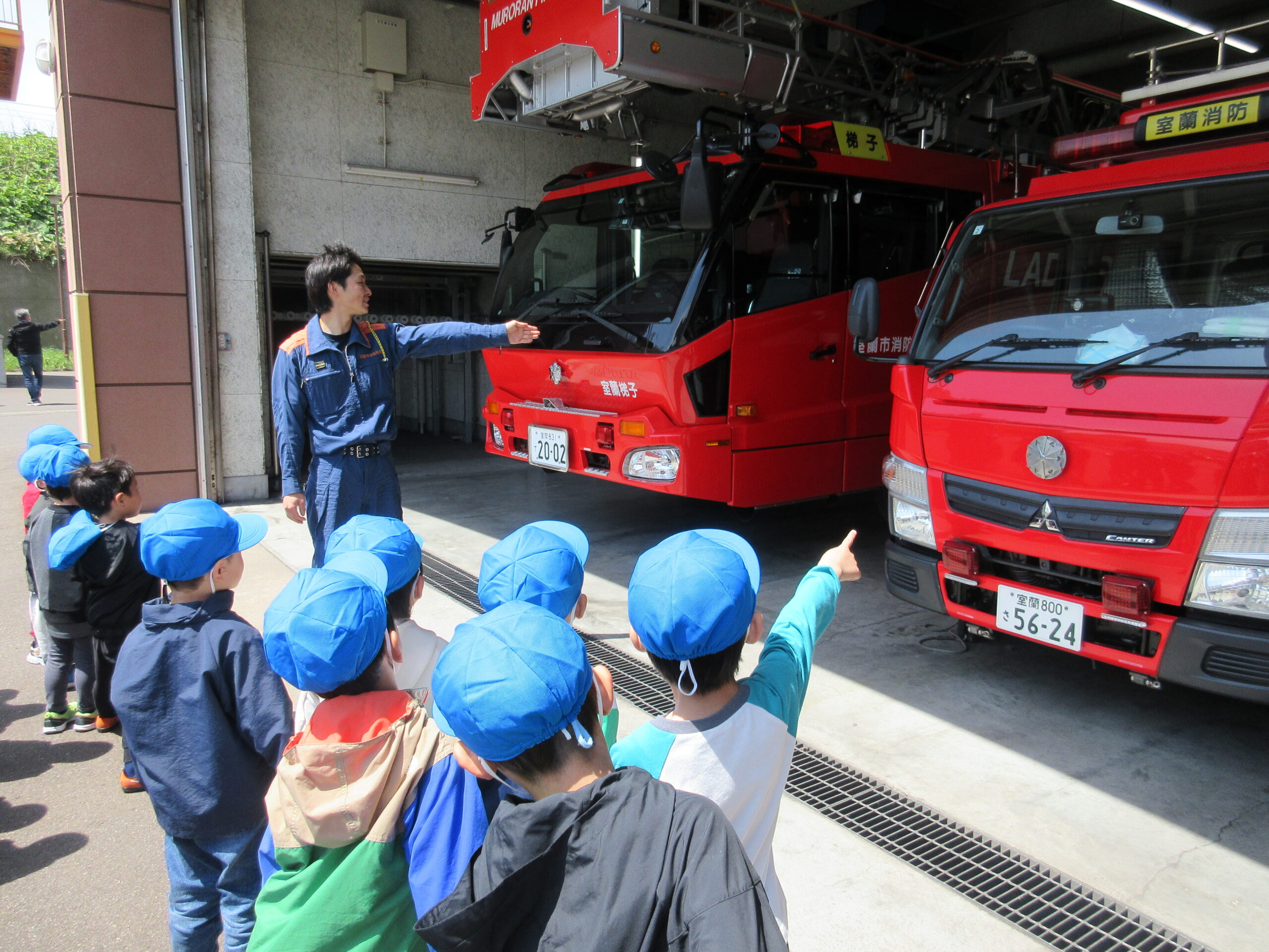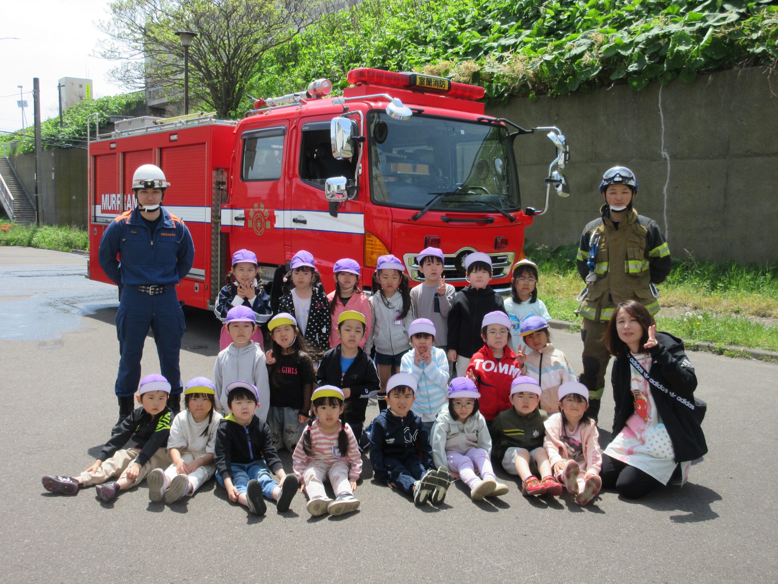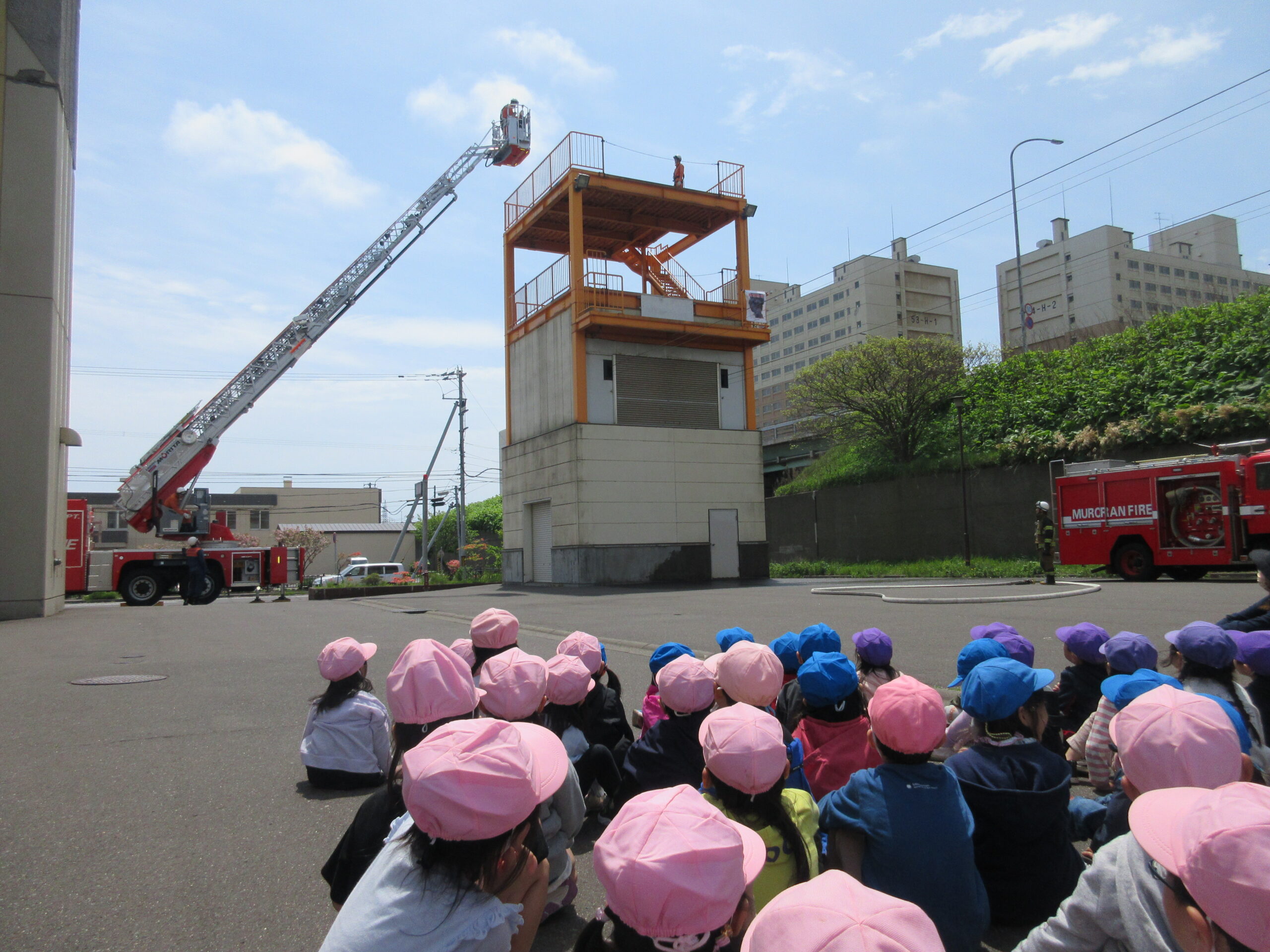 本日5月20日(月)年長学年67名が消防署へ見学に行きました。消防署では担当の方々から説明を受けながら2つのグループに分かれて署内を見学しました。指令室から隊ごとでの仕事場、食堂や仮眠室など、消防車の中もご丁寧にお話していただきました。また梯子車で救助する所や放水訓練等を見学して、少々緊張感が漂う表情でもありましたが、子ども達は真剣にお話を聞く姿勢が見られました。貴重な体験が出来て良かったですね!室蘭消防署の方々ありがとうございました。