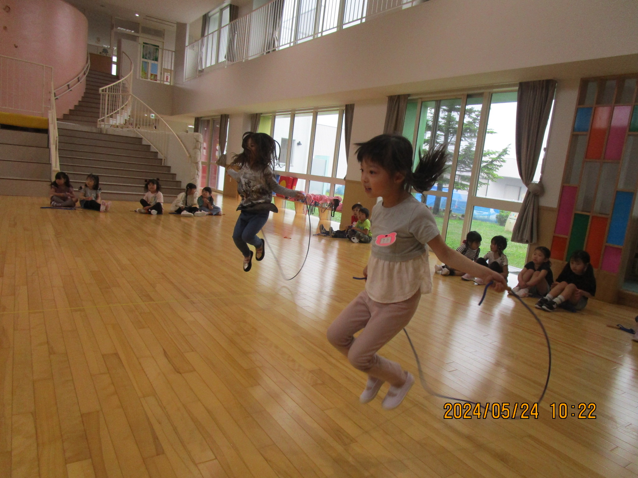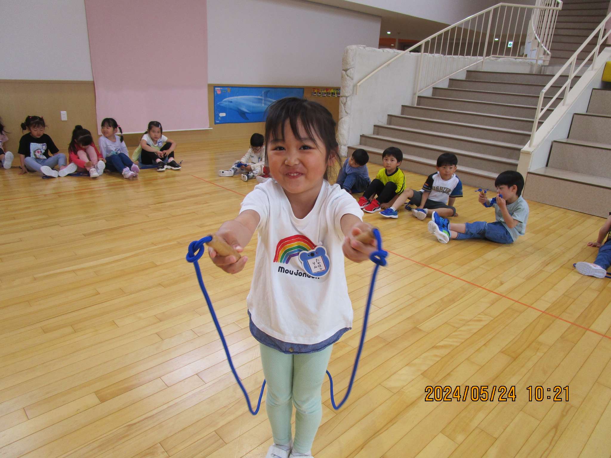 本日5月24日(金)進級して初めてのなわとび大会をホールで行いました。各クラス2、3名ずつ持久戦で戦いました。1組1組すごい盛り上がりで応援する声がとても元気いっぱいでした。初めて賞状を貰ったお友達や昨年より順位が上がったお友達もいて練習の成果が発揮しているのを感じられました✨お部屋のなわとび大会や、おすもう大会などチャンスは沢山ありますので、頑張ってほしいです😊!