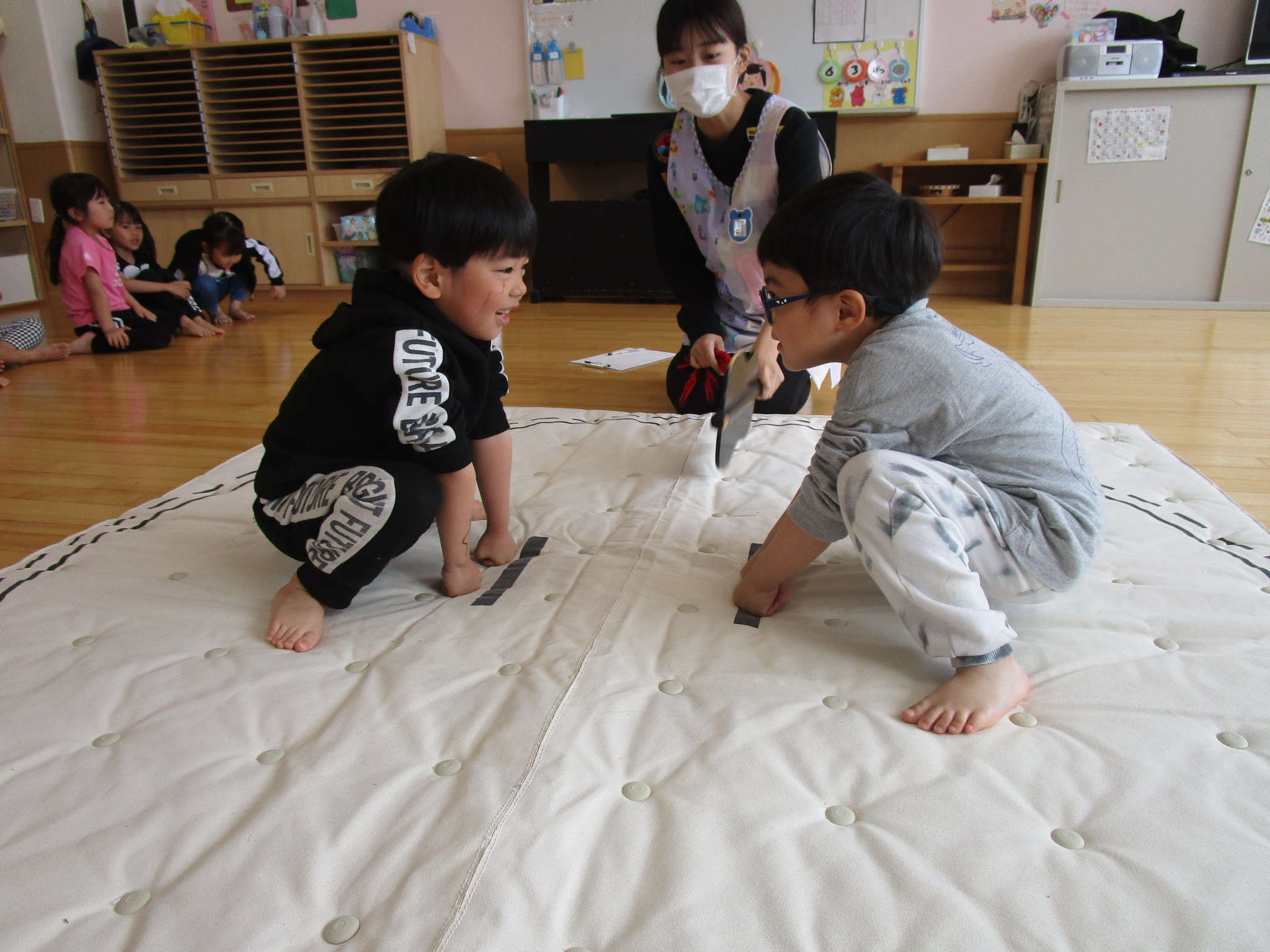 (30)令和6年度「年長学年 お相撲大会」 2024年6月3日 園内ブログ 年長組になって初めてのおすもう大会に取り組み、ドキドキわくわくの様子でした。みんな一生懸命力を発揮しておすもうに参加し、負けてもお友達を応援する姿に成長を感じました。初めて賞状をもらい勝って嬉しいお友達も負けて悔しいお友達も、次回の頑張りに期待しています! 今日の病気欠席者は、風邪3名、発熱4名、咳1名、鼻水1名、体調不良4名、大事をとって2名です。