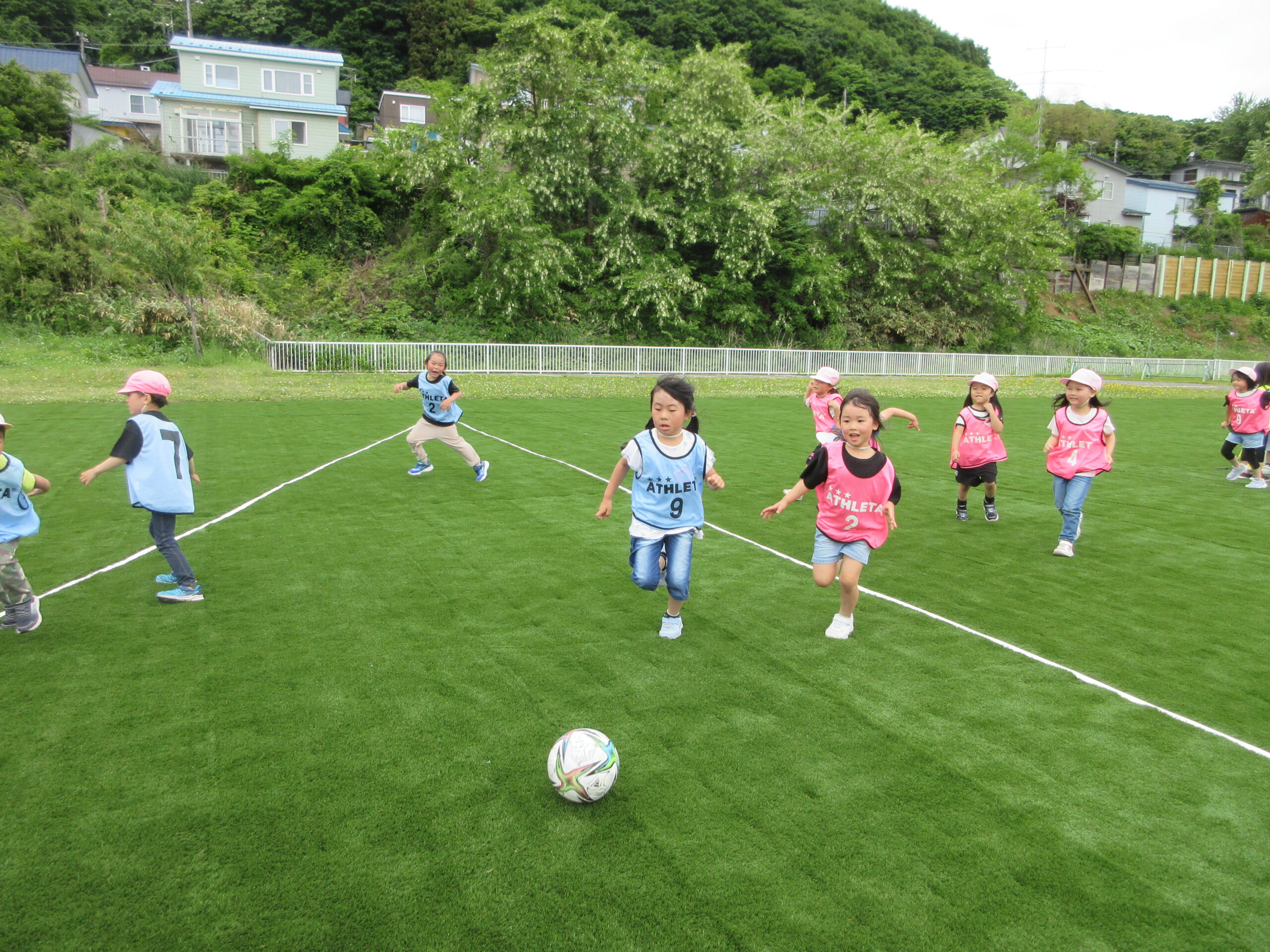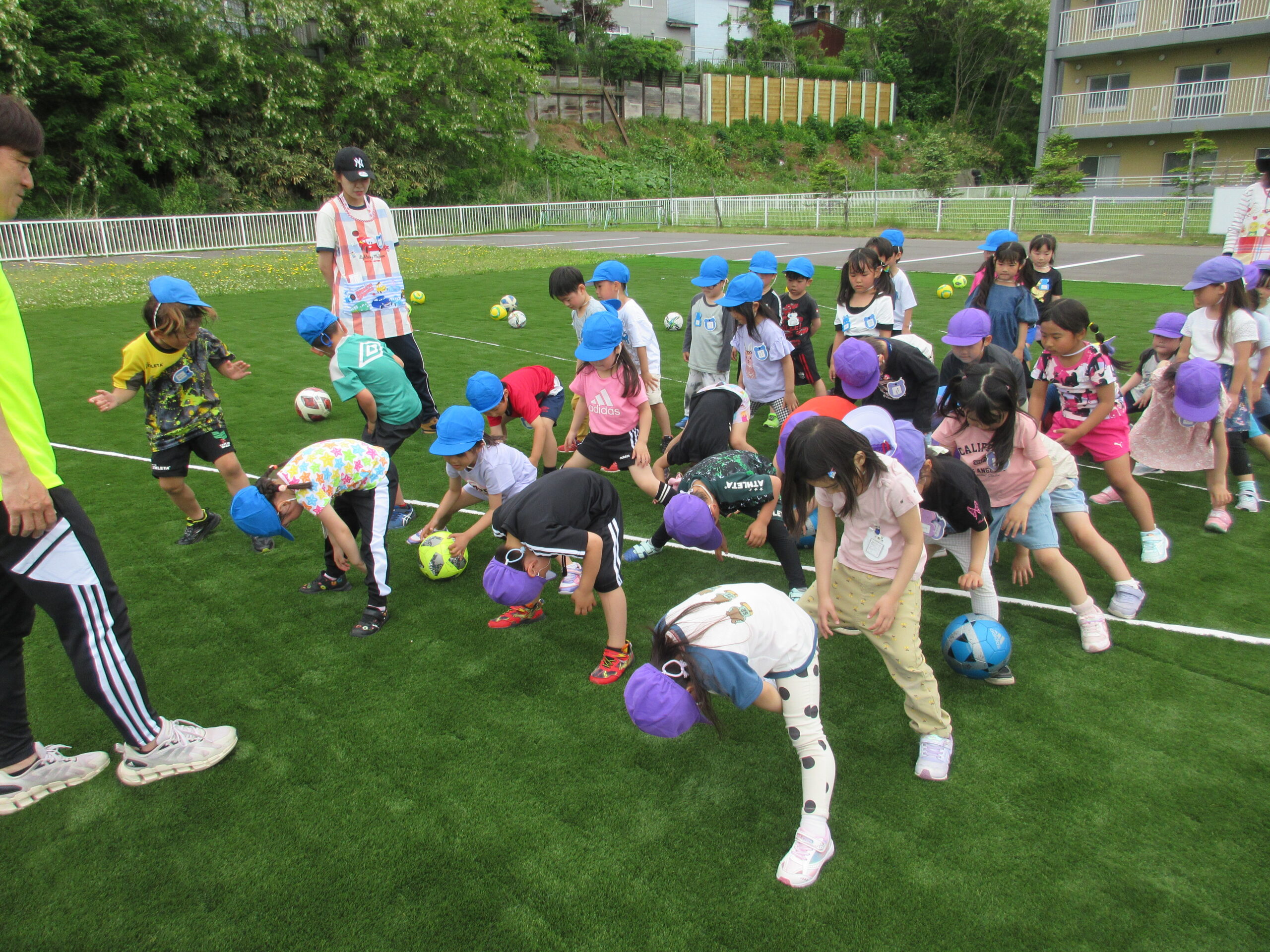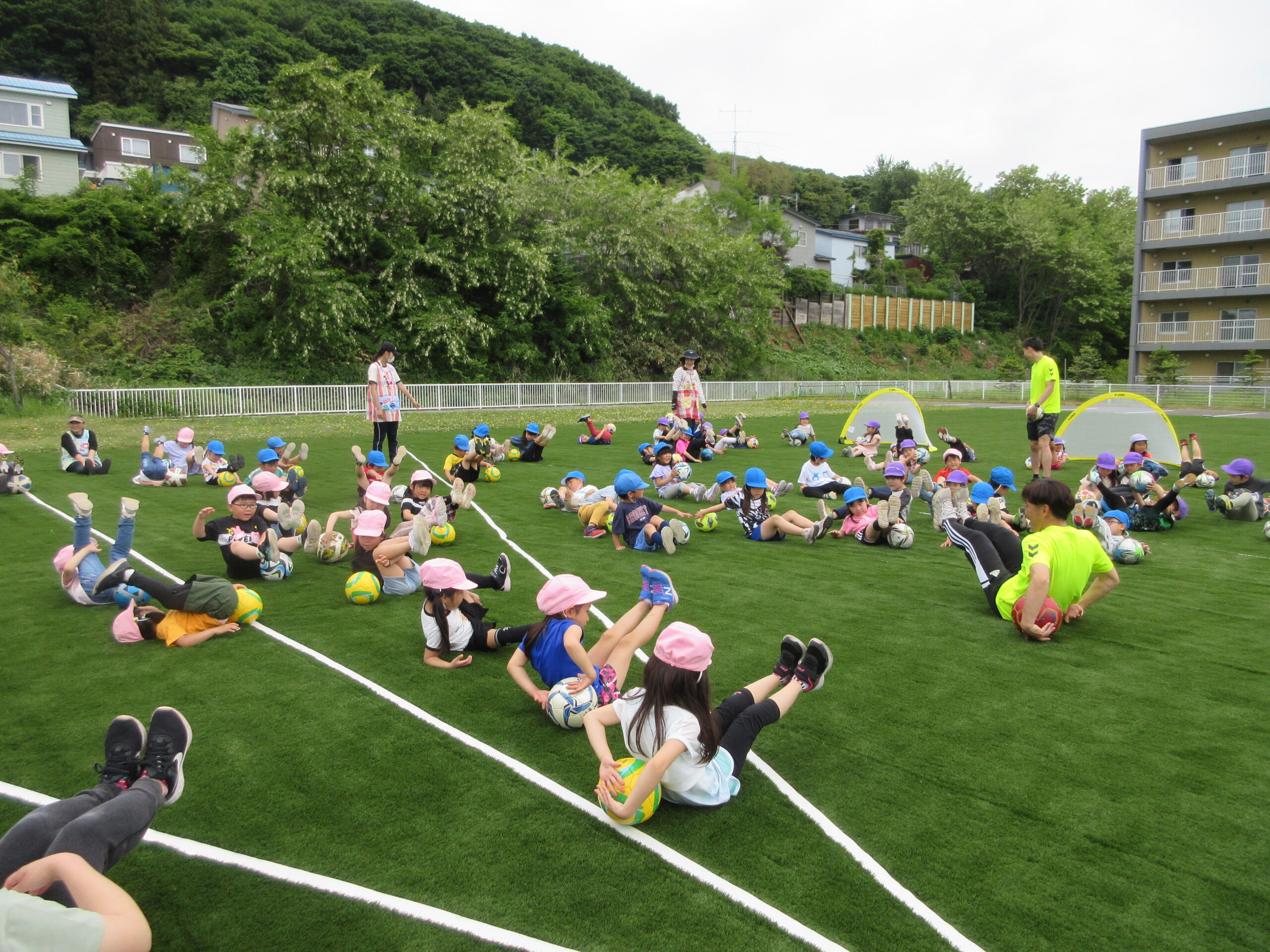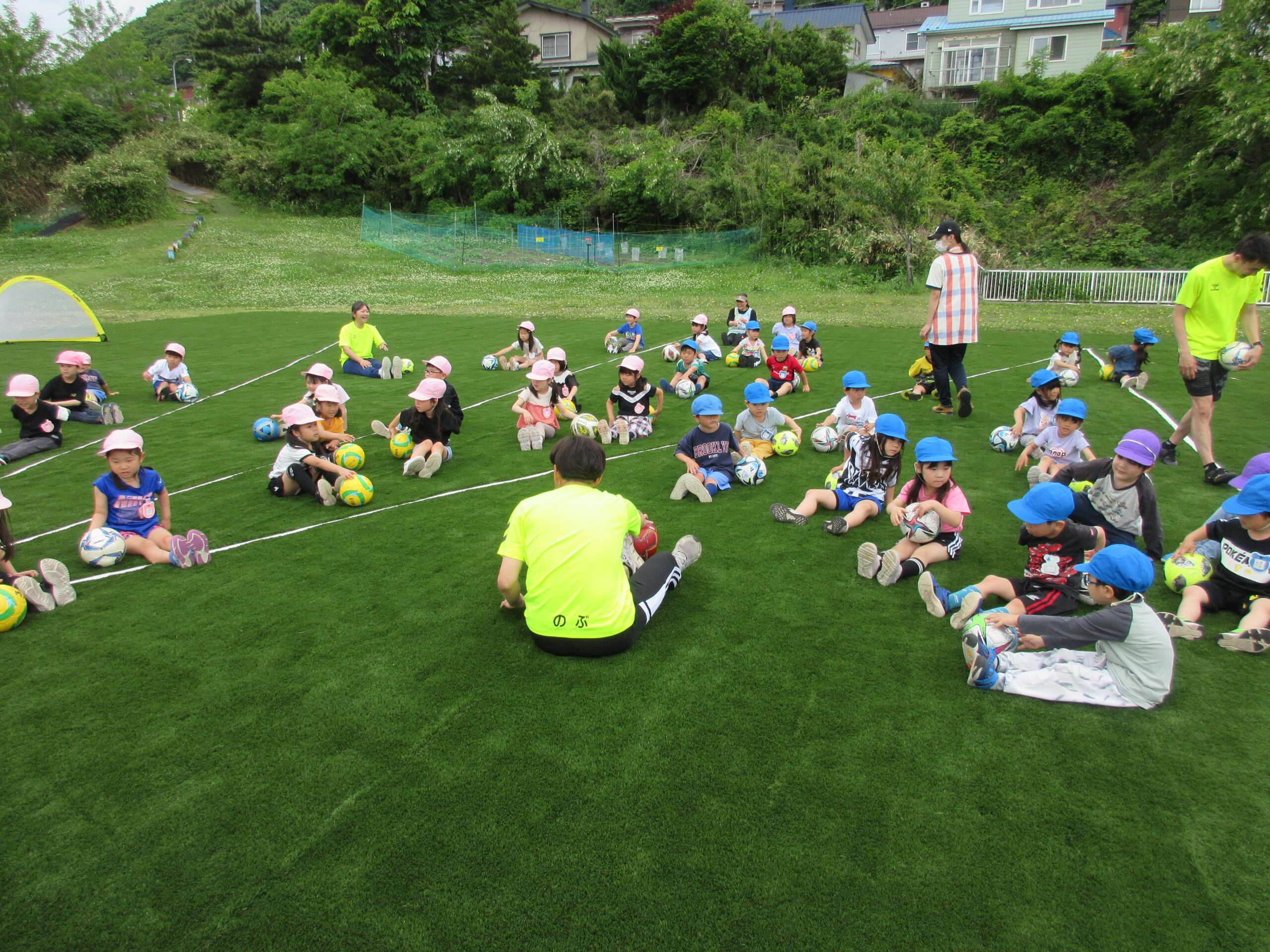 先週に続きまして本日6月11日(火)室蘭地区サッカー協会より3名の方が巡回指導に来て頂きました。子ども達は積極的にボールとタッチしたりキャッチしたりコロコロとリフティングしたり、そしてボールと絡み合ったりしながら指導者の指示に従い元気一杯、思いっきり楽しんで参加していました。ゲームではゴール目掛けて蹴るお友だちも多く、キーパーの候補者の多い印象でしたね!晴天に恵まれ、園庭でたくさん汗を流した年長さんでした。「のぶ・いわ・みかぱん」コーチの皆様ご指導ありがとうございました。