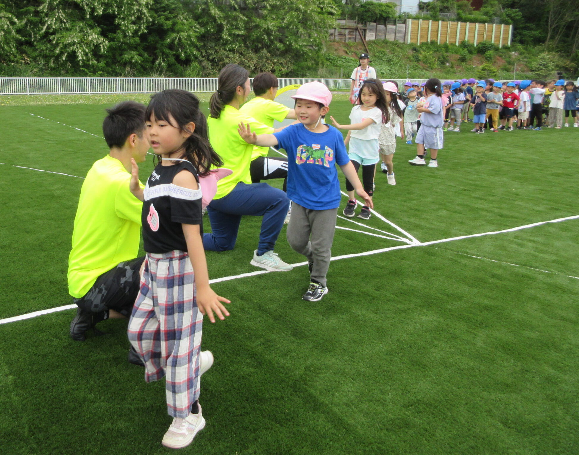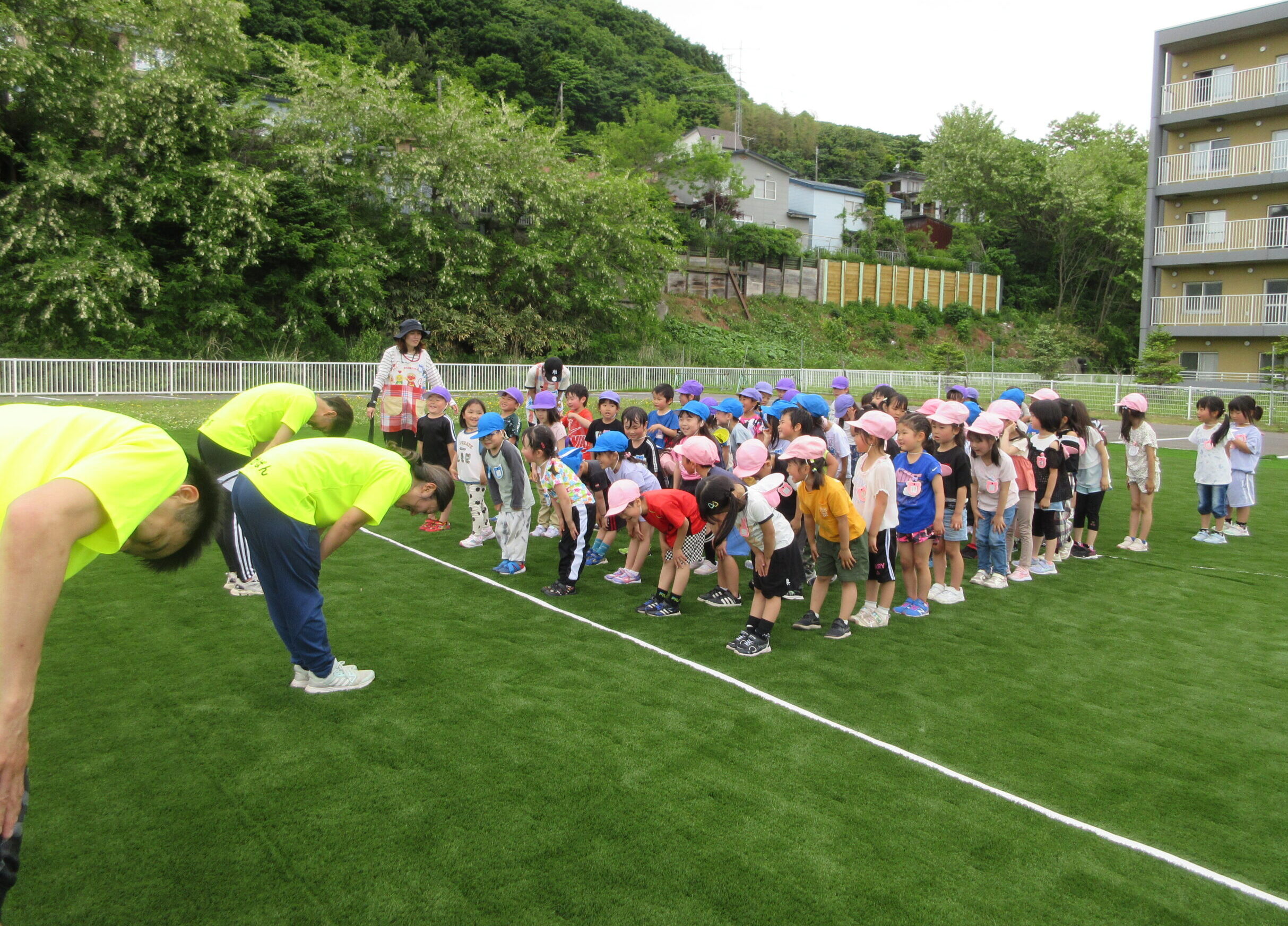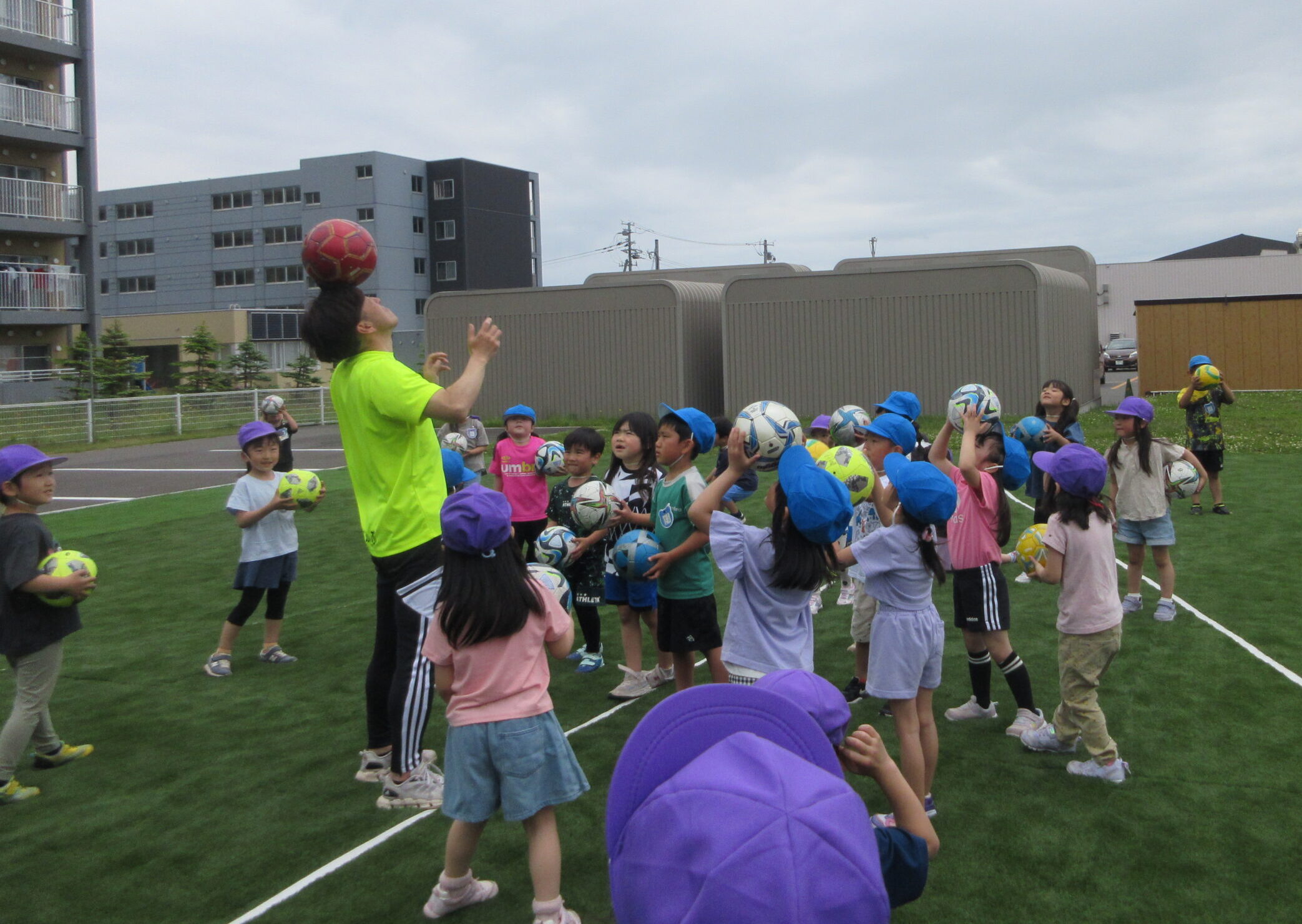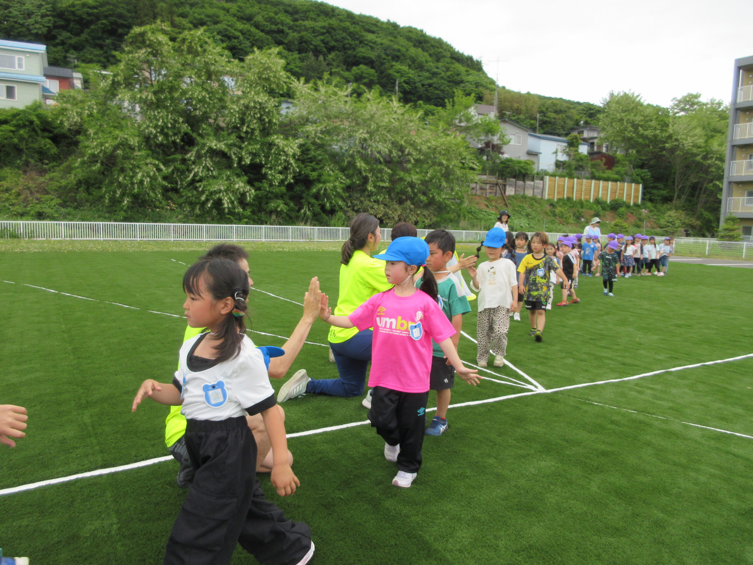 先週に続きまして本日6月11日(火)室蘭地区サッカー協会より3名の方が巡回指導に来て頂きました。子ども達は積極的にボールとタッチしたりキャッチしたりコロコロとリフティングしたり、そしてボールと絡み合ったりしながら指導者の指示に従い元気一杯、思いっきり楽しんで参加していました。ゲームではゴール目掛けて蹴るお友だちも多く、キーパーの候補者の多い印象でしたね!晴天に恵まれ、園庭でたくさん汗を流した年長さんでした。「のぶ・いわ・みかぱん」コーチの皆様ご指導ありがとうございました。