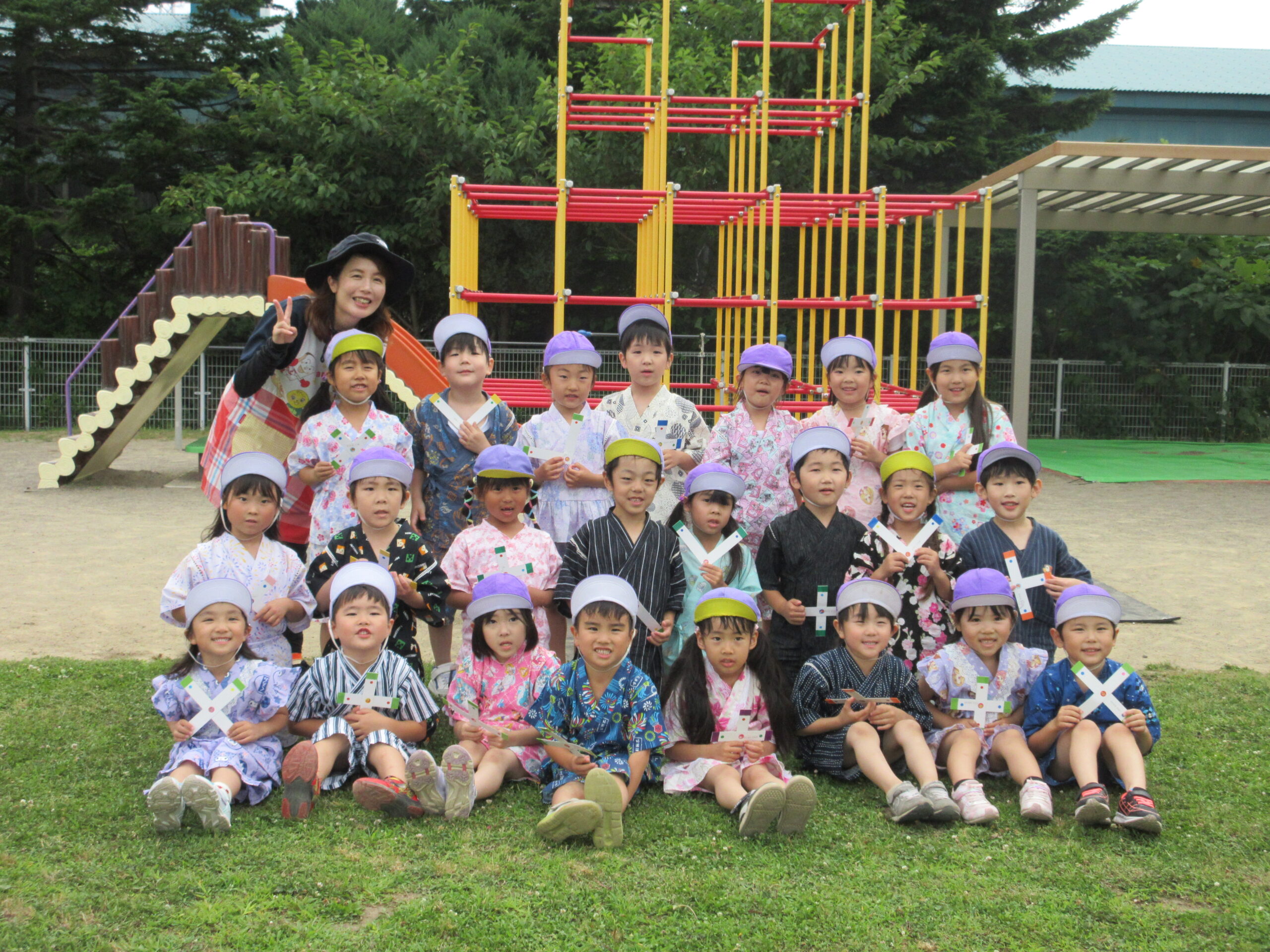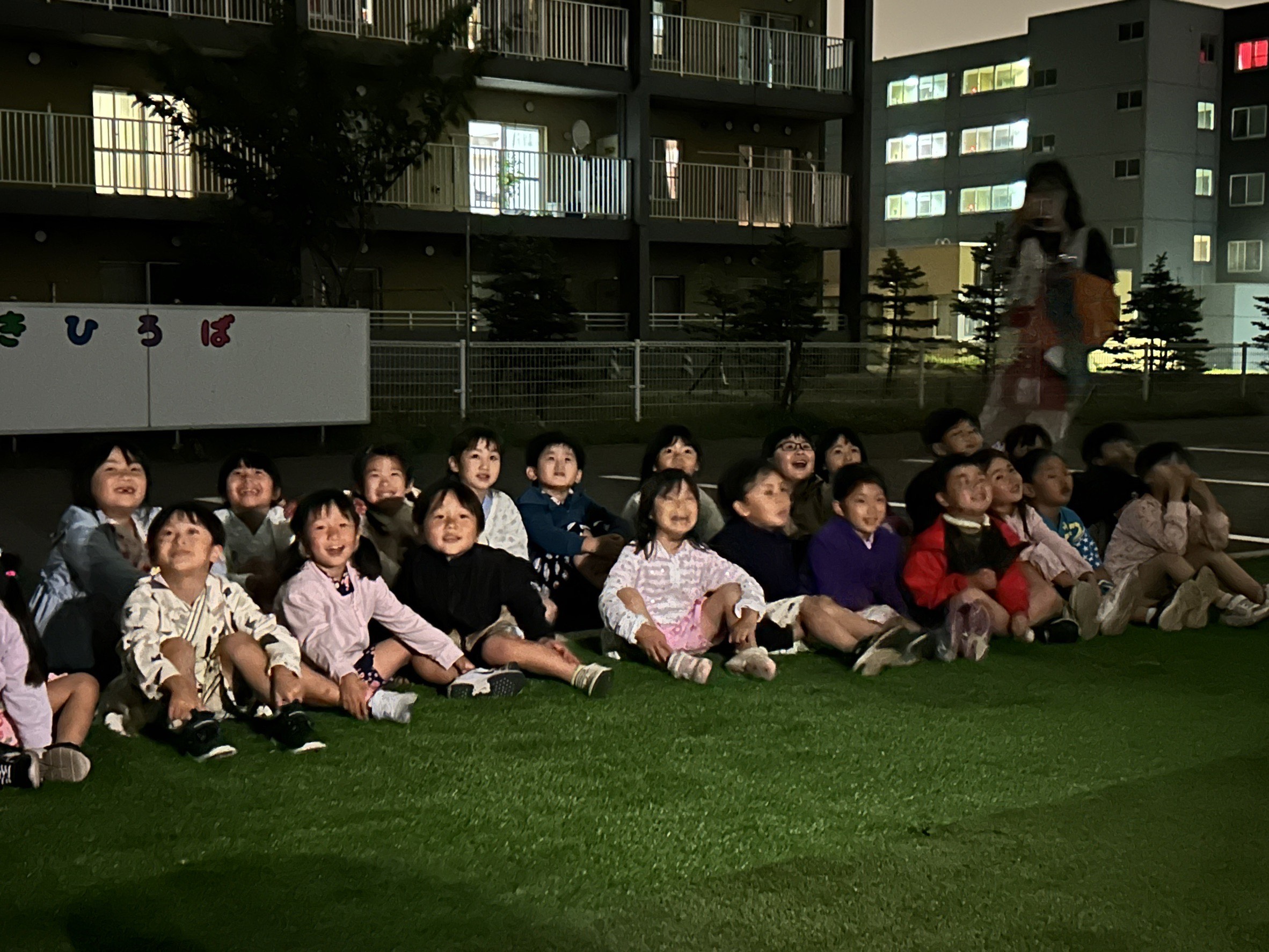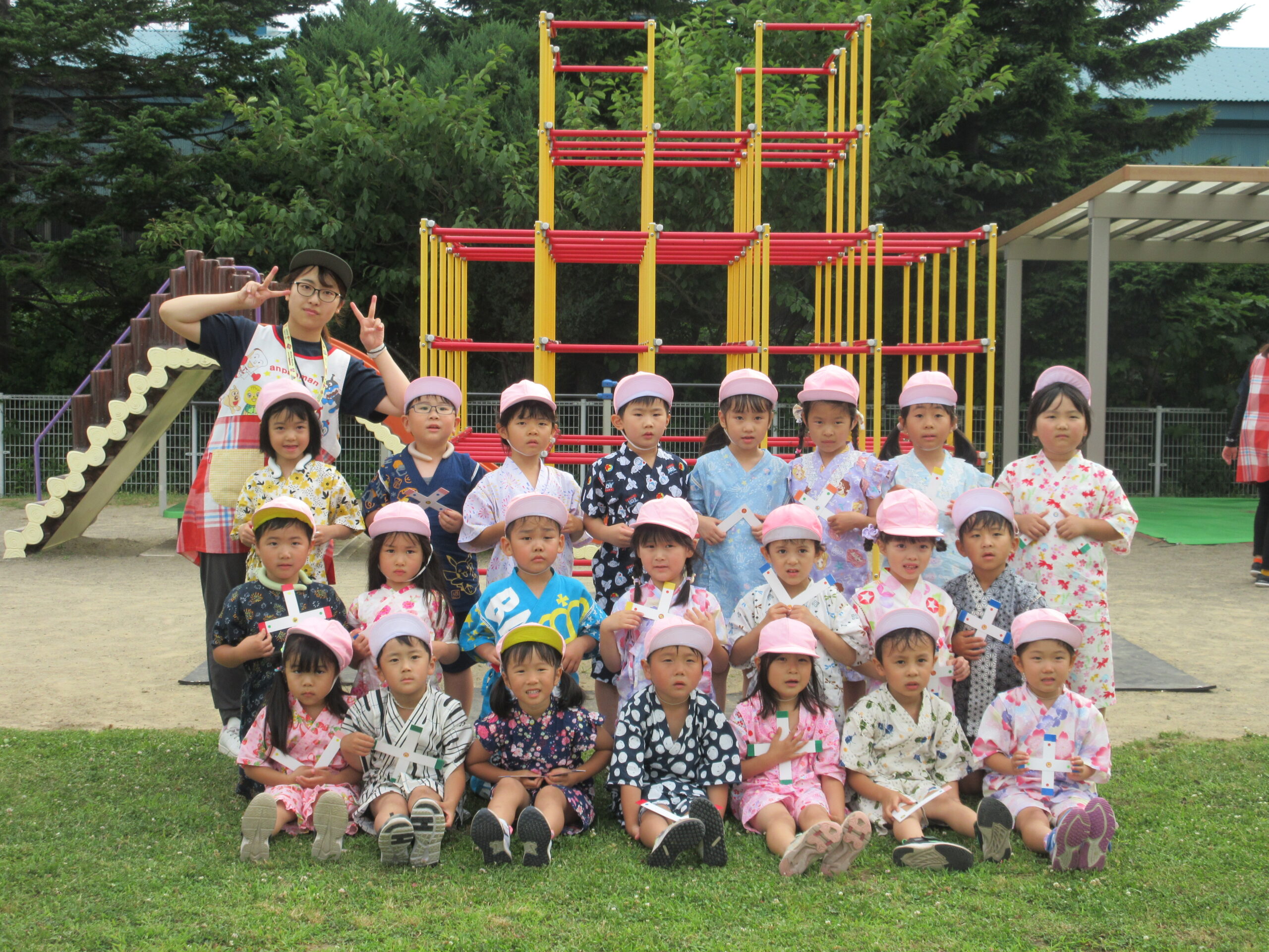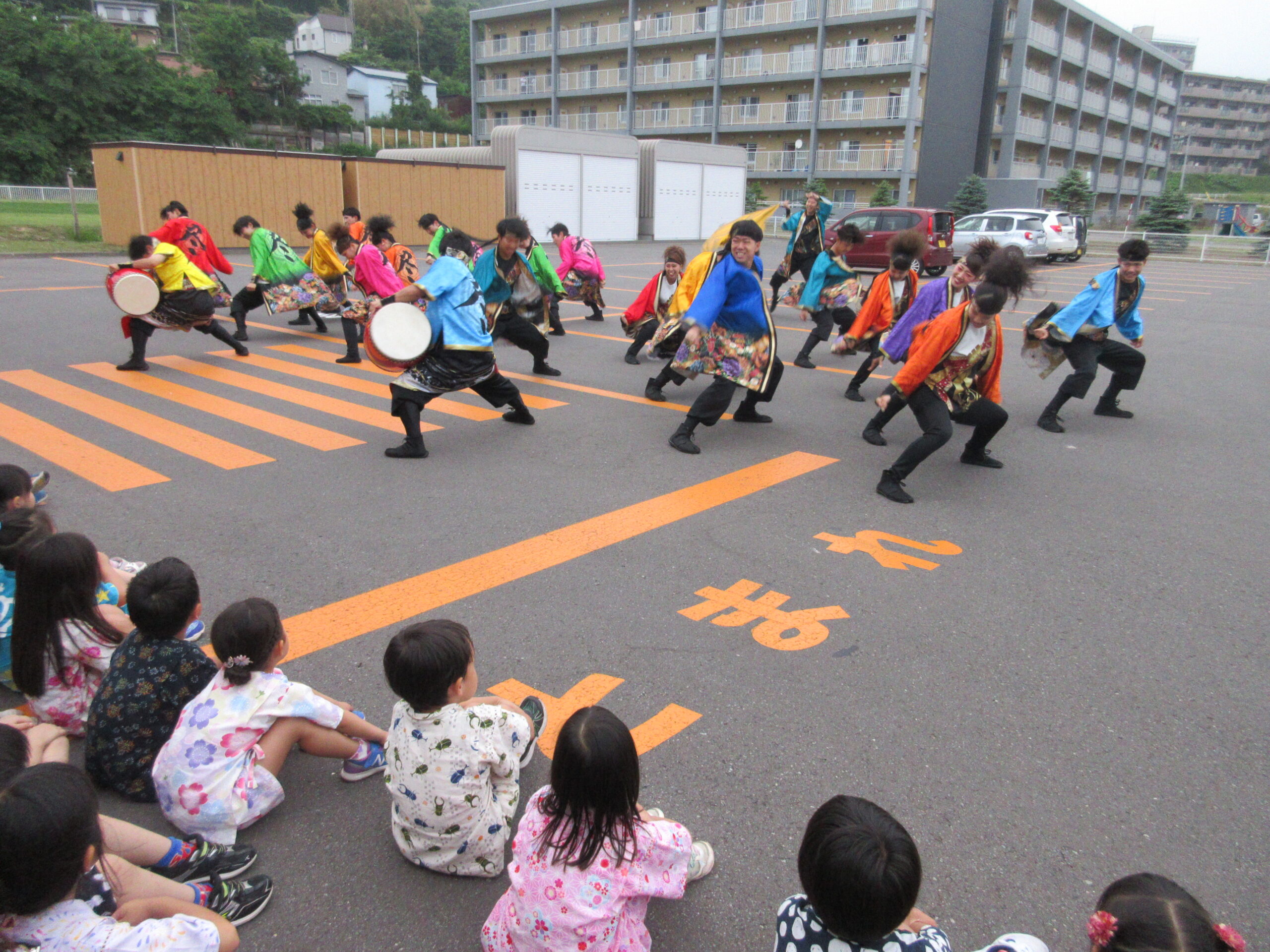 室蘭百花繚蘭の方々が来園し「よさこい」で大盛り上がり!みんなで掛け声をかけ引き込まれた場面も見られました。最後には夜空に広がる花火をみて歓声があがりました。その後、各クラスにてみんな就寝しています。