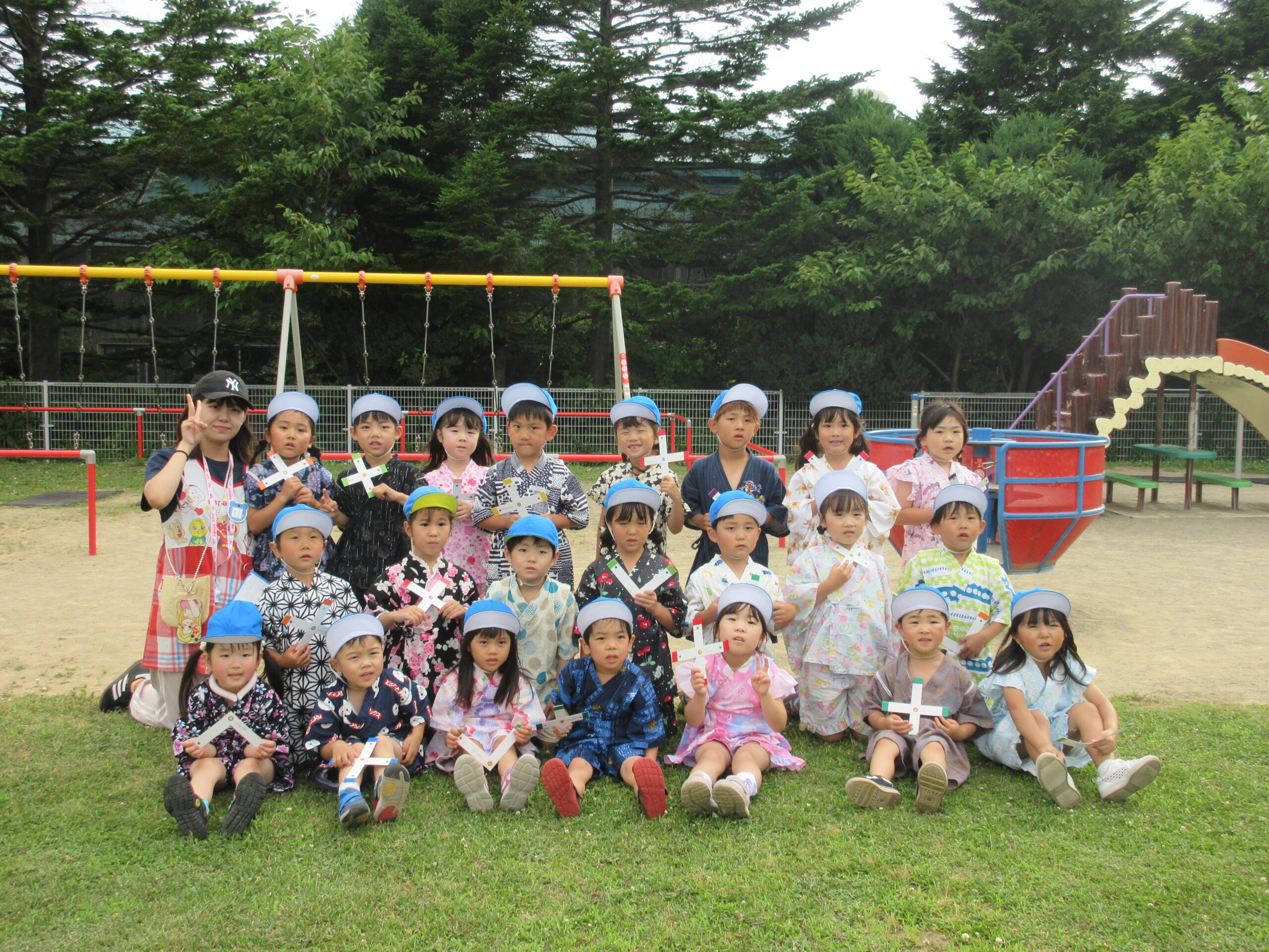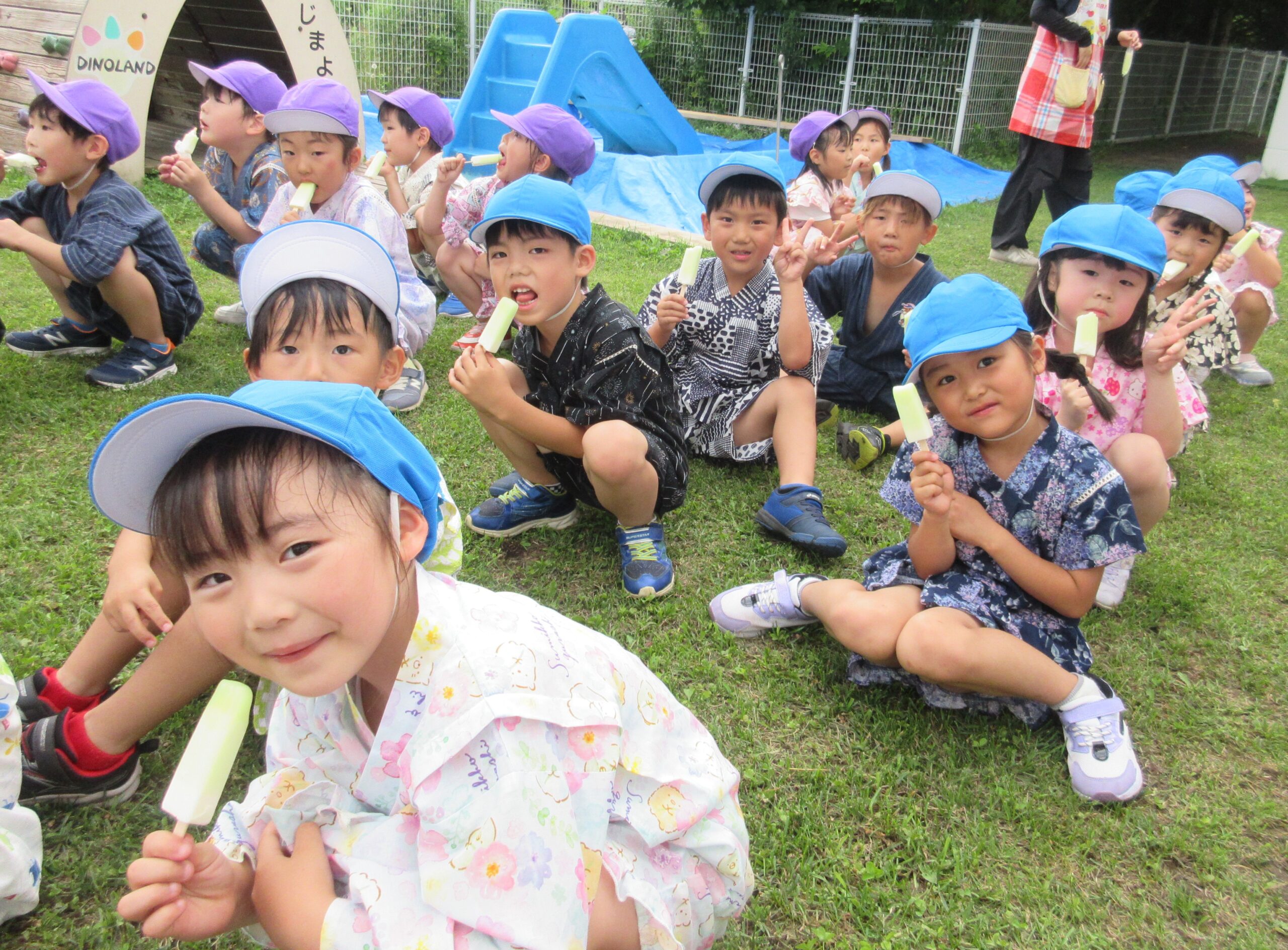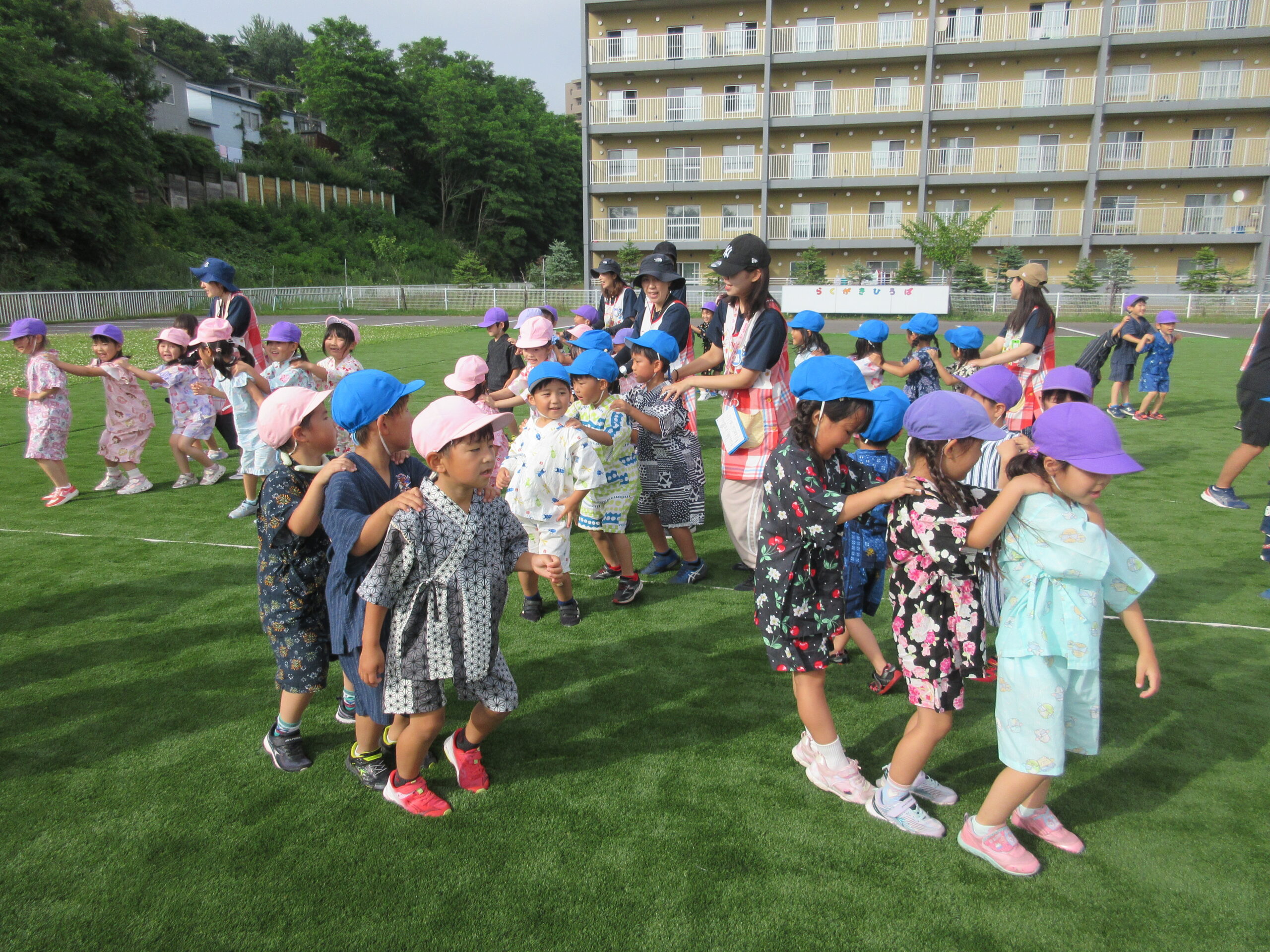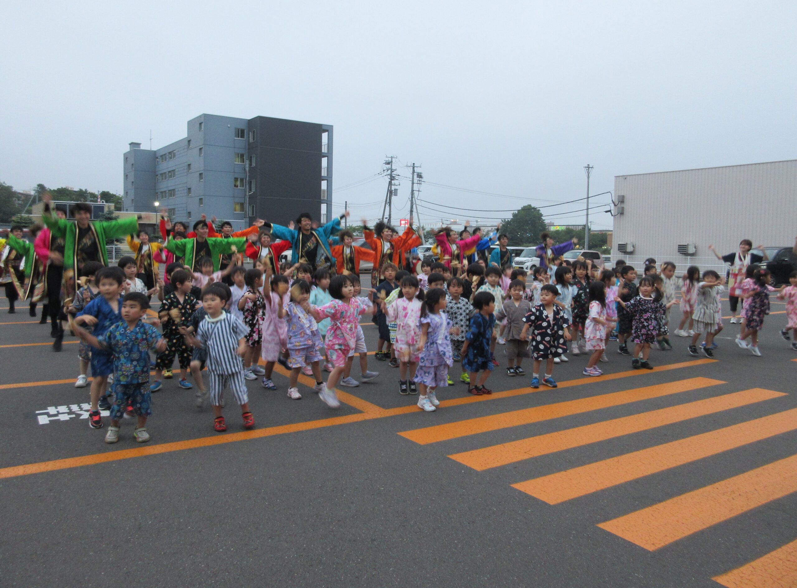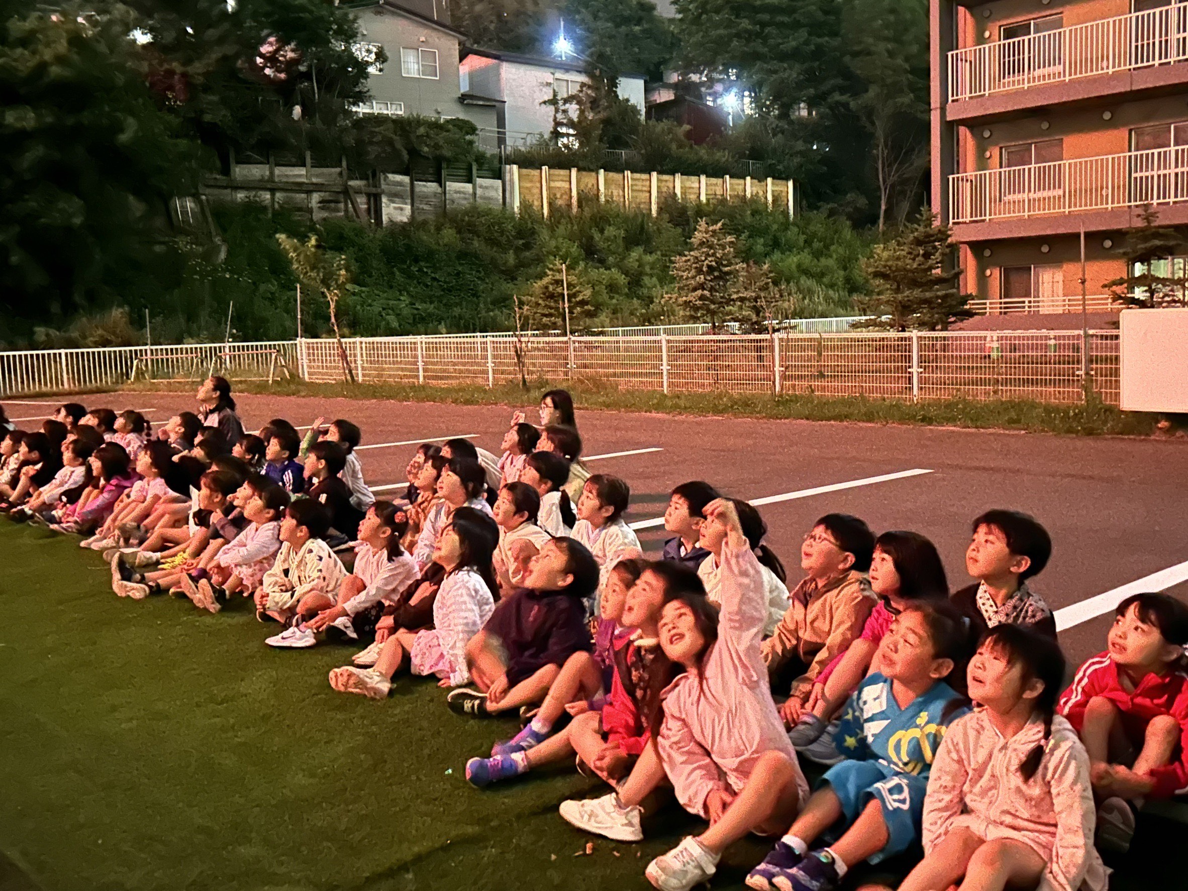 室蘭百花繚蘭の方々が来園し「よさこい」で大盛り上がり!みんなで掛け声をかけ引き込まれた場面も見られました。最後には夜空に広がる花火をみて歓声があがりました。その後、各クラスにてみんな就寝しています。