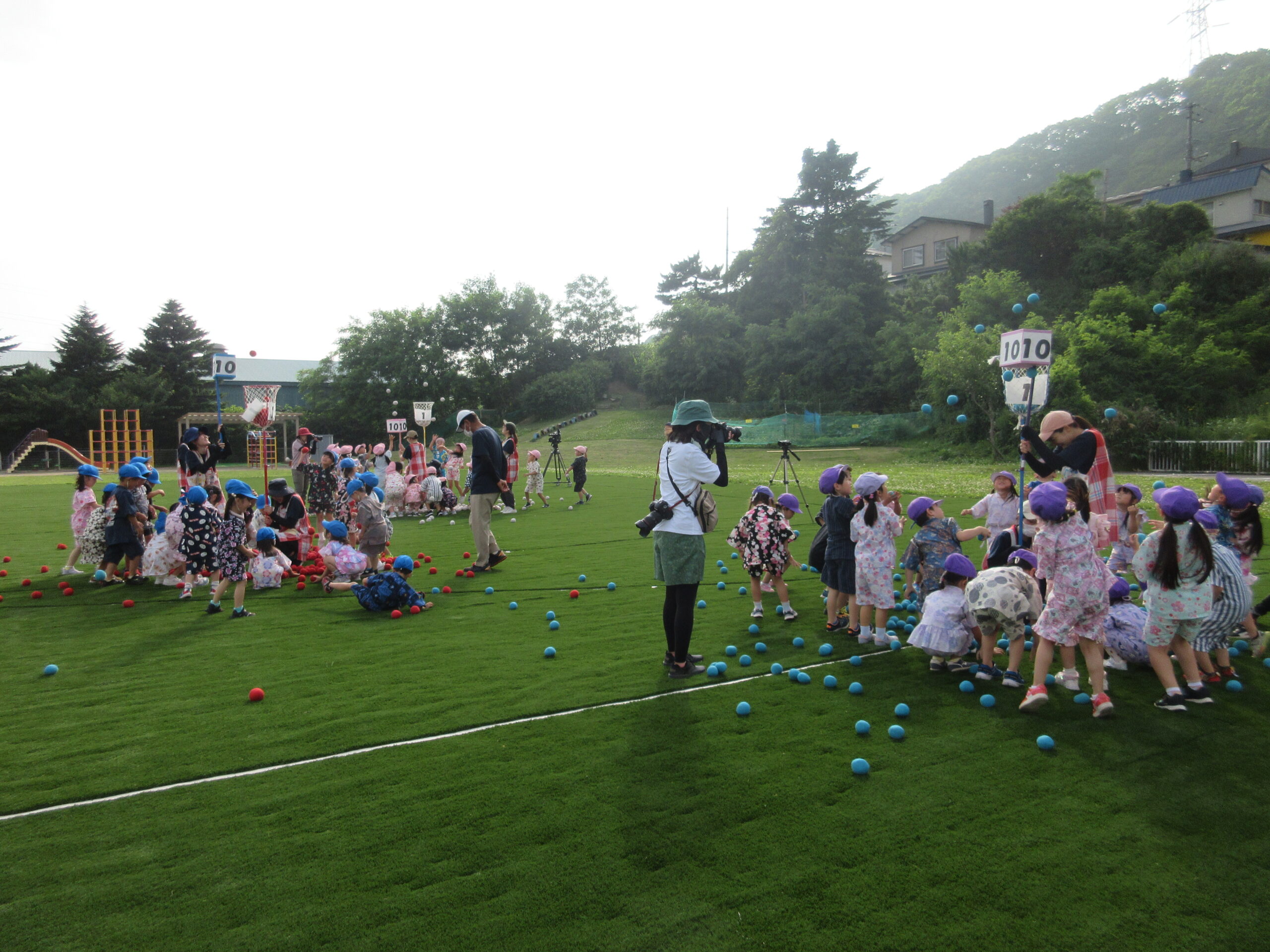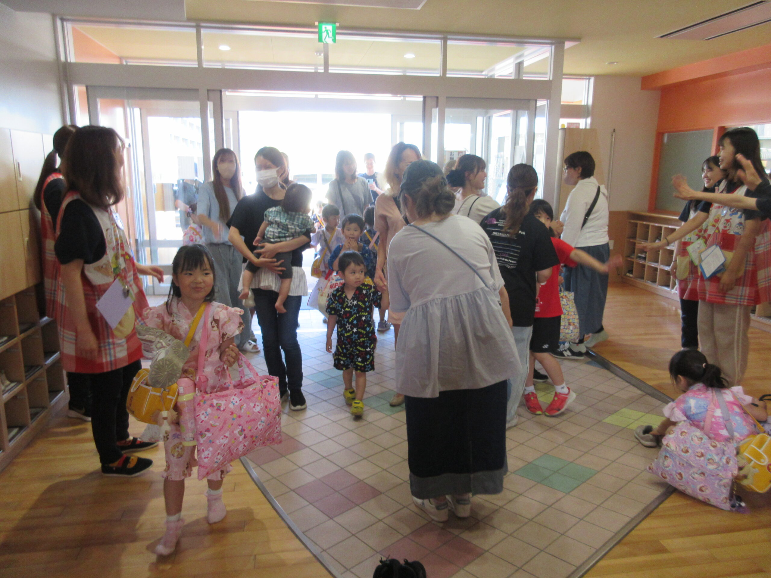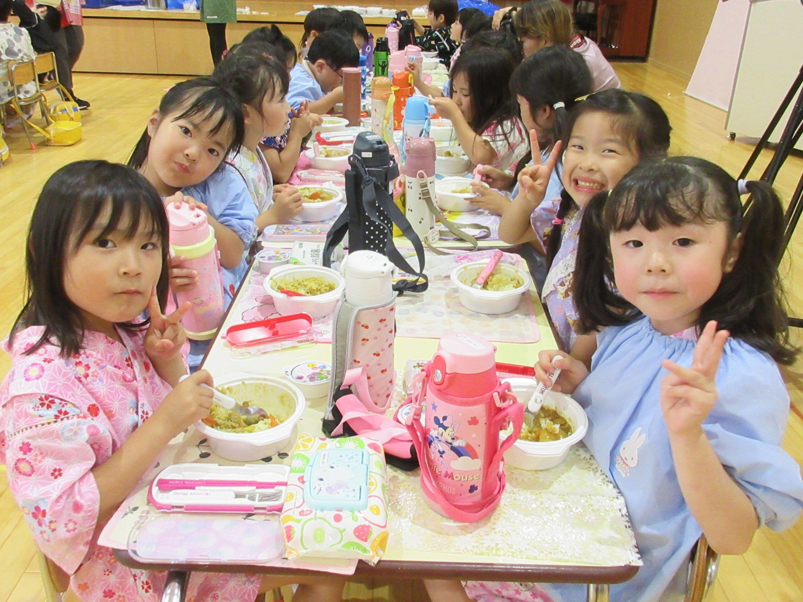 7月18日(木)年長学年のお泊まり会を実施しました。最高の天候に恵まれた中、子ども達は保護者付き添いで大きな荷物を持ち元気に登園しました。親元離れて幼稚園に泊まることに不安を感じている子どもや、ルンルン楽しみにしている子ども達と気持ちはそれぞれでありましたが、玉入れゲームや宝探し、フォークダンスと園庭で汗を流しながら楽しみました。