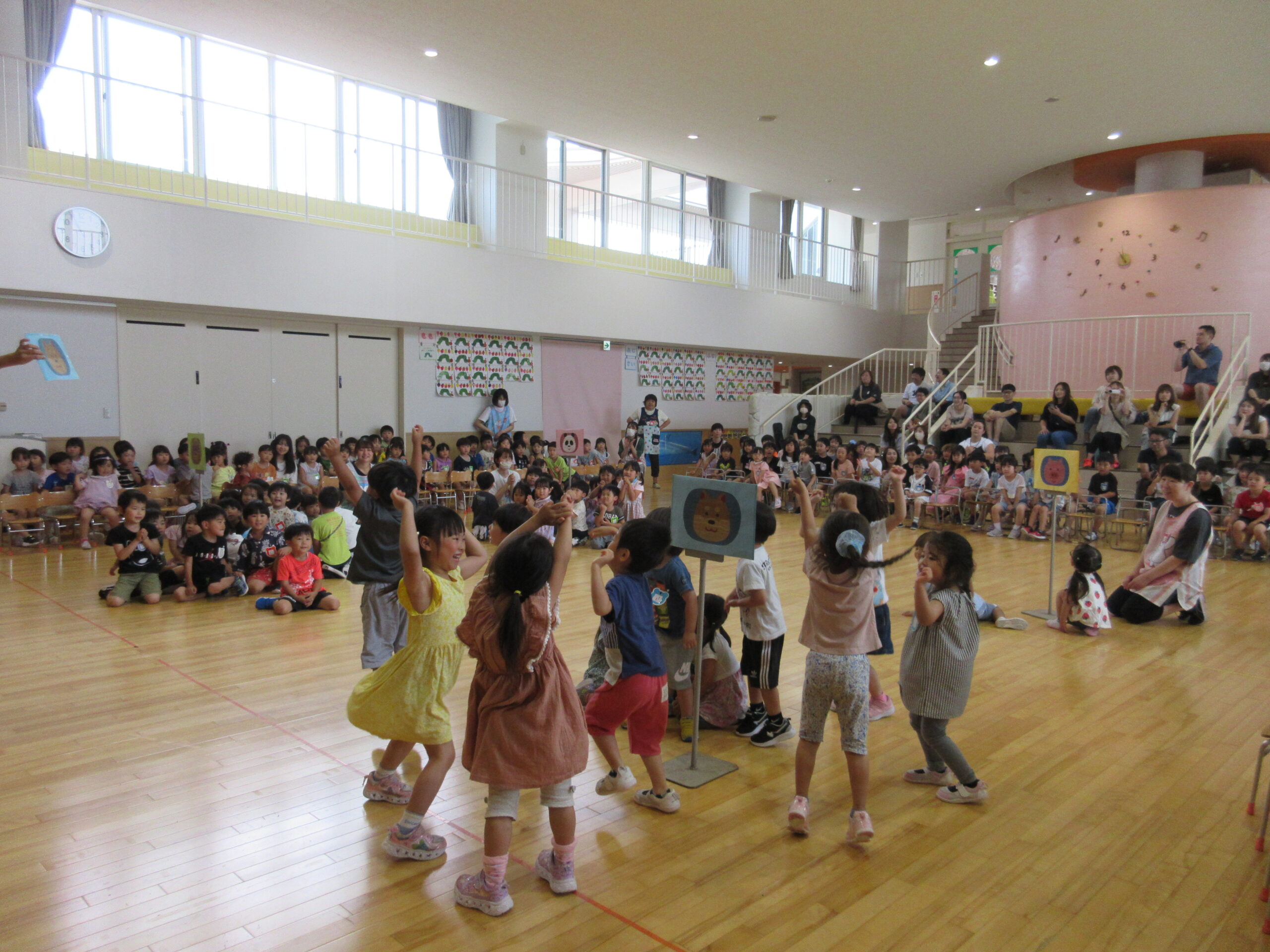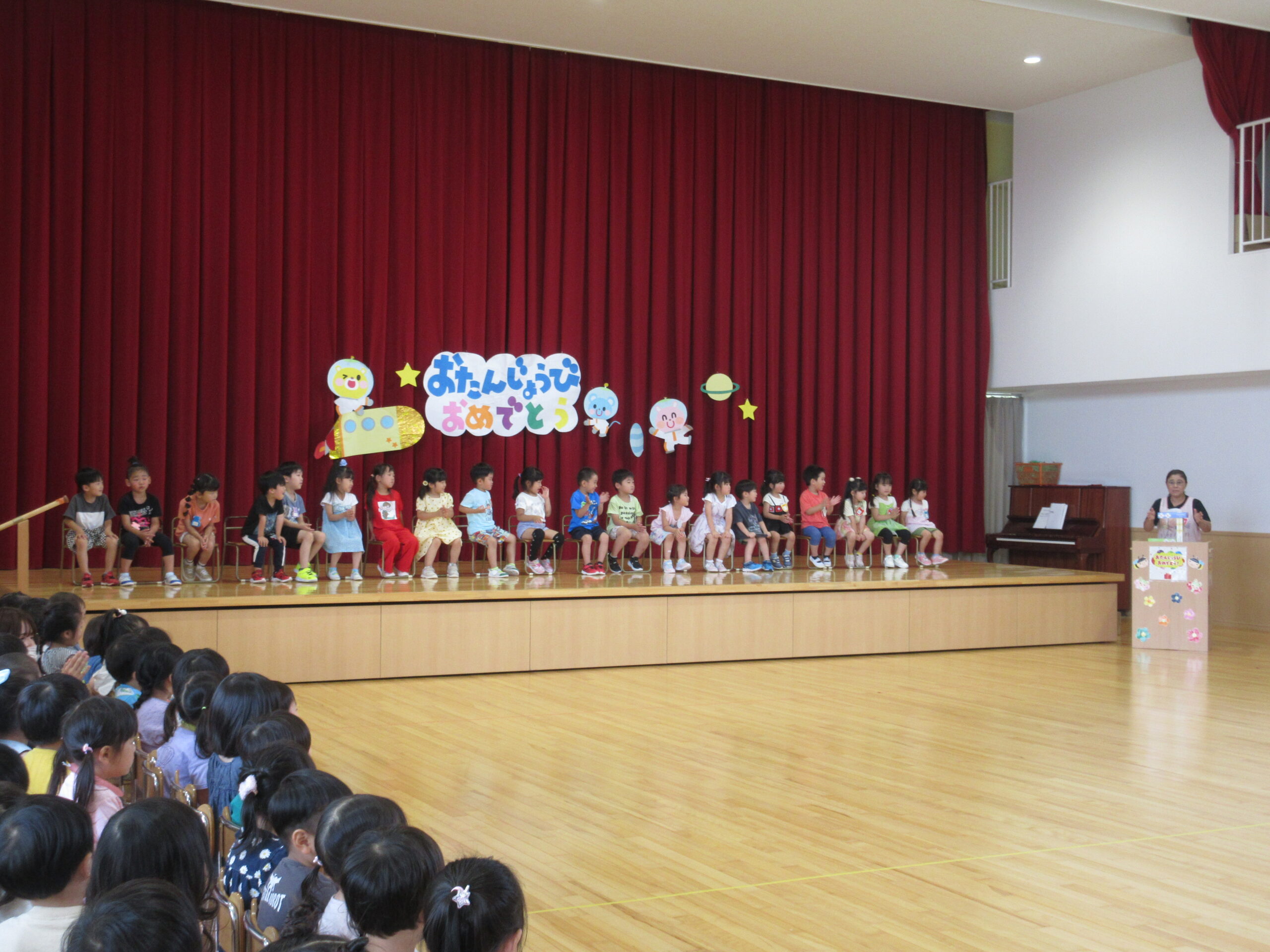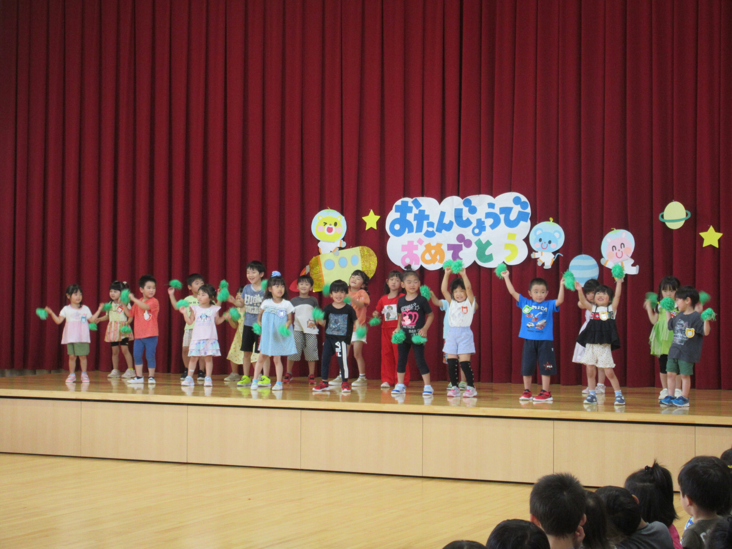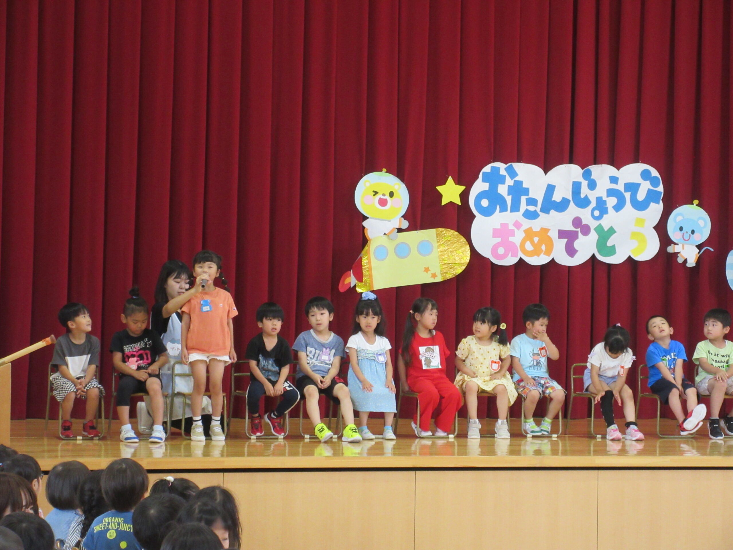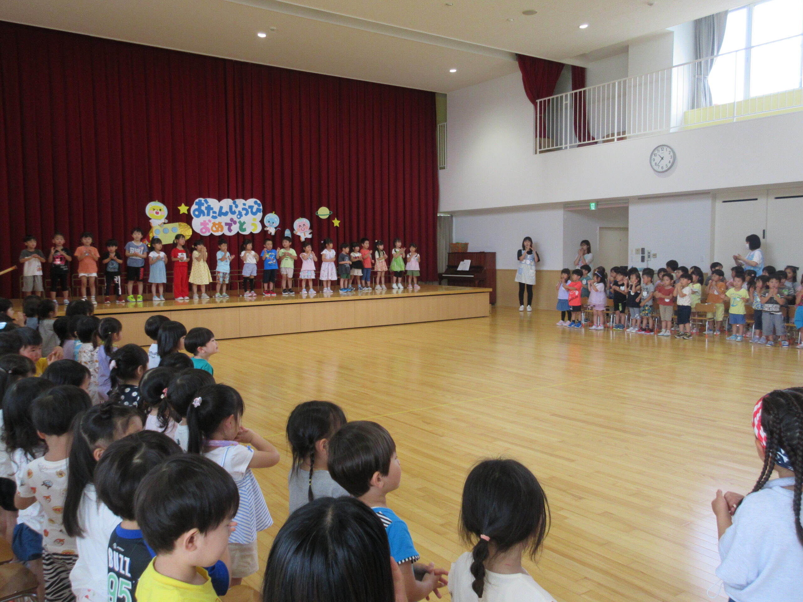 1学期も残すところ3日となりました。本日7月12日(金)は7月生まれ20名のお誕生会を実施し7月生まれのお友だちは今月もポンポンを持って「ちょんまげマーチ」を元気に踊ることができていました。ちょんまげマーチの踊りもとても愉快で笑いがありましたね!もちろん自己紹介も練習の成果を発揮して堂々と発表することが出来ていました。お誕生会後は全園児縦割りで「ぴったしカンカン」ゲームで楽しみながら今学期最後の誕生会を終えました。