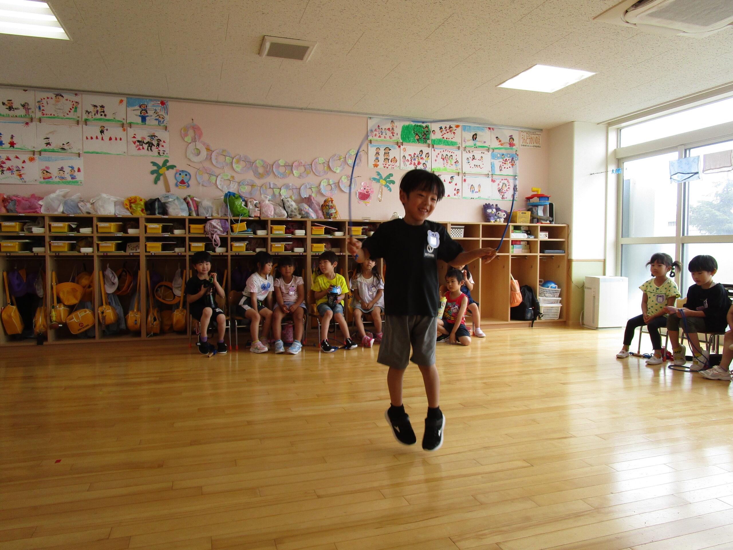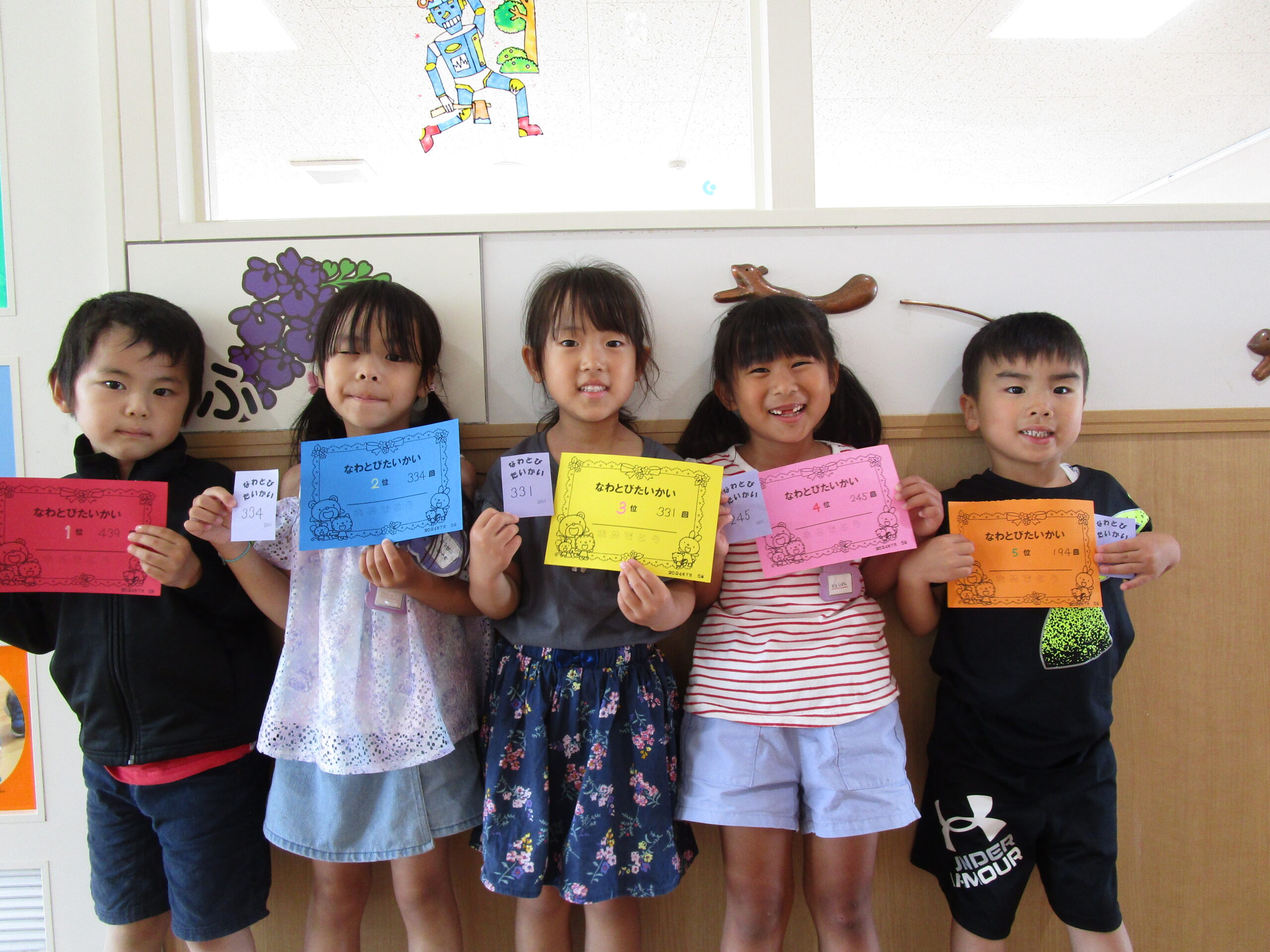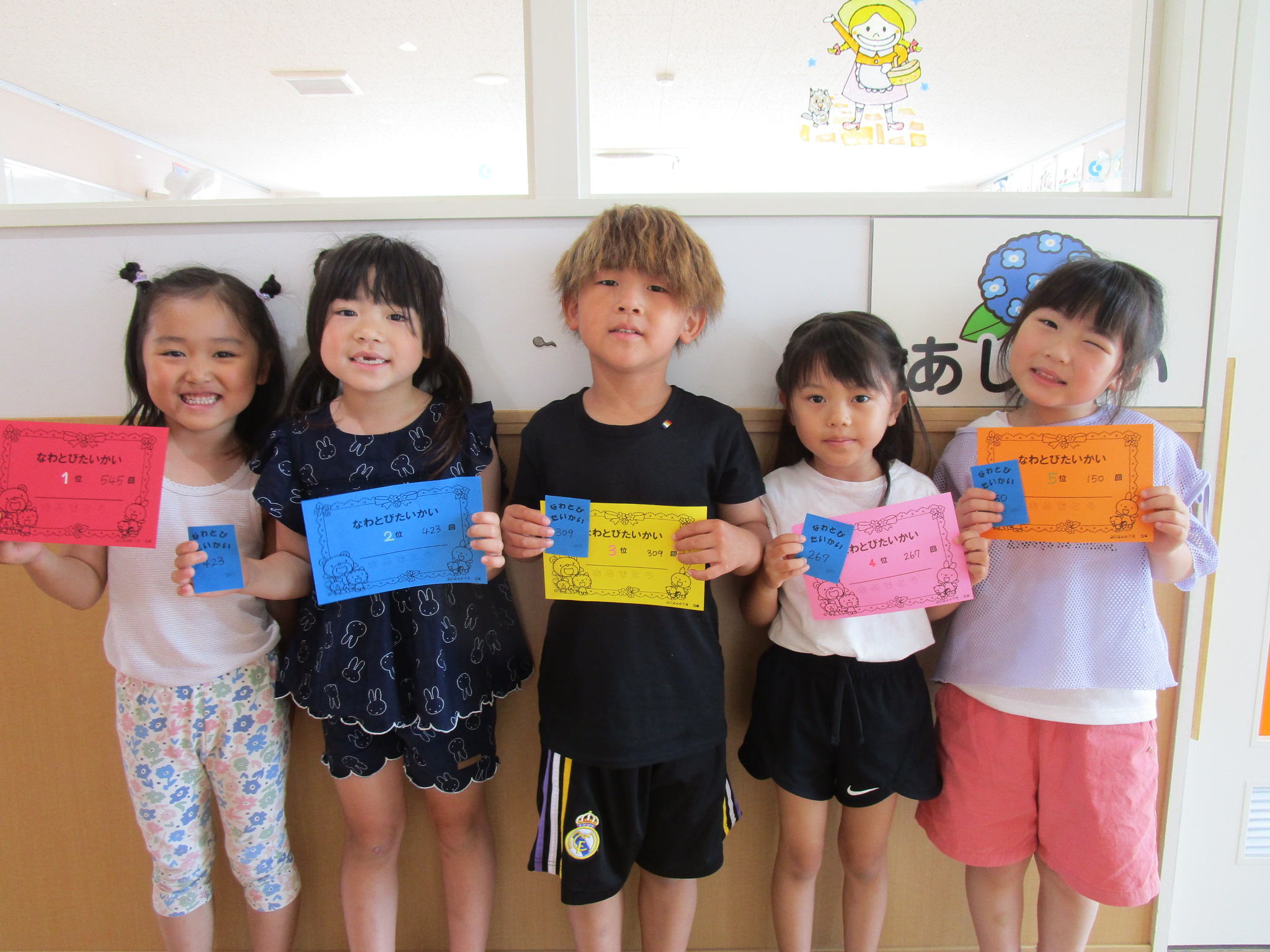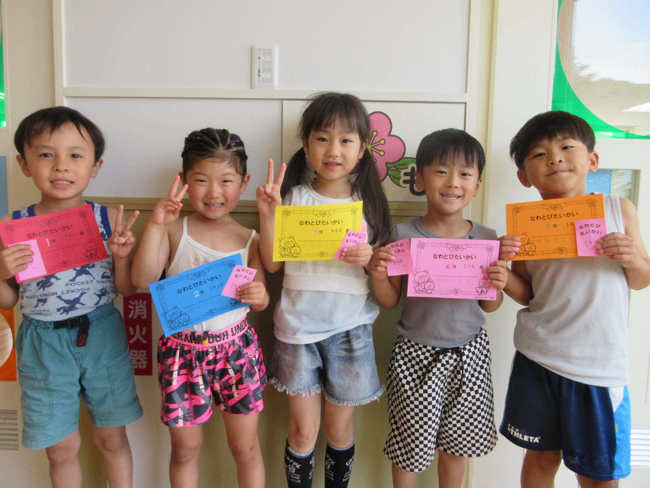 (48)令和6年度「年長学年 縄跳び大会」 2024年7月5日 園内ブログ 本日7月5日(金)お部屋でなわとび大会を行いました。進級してから初めての大会(お部屋)となりました。跳び続ける回数が多いお友達が1~5位の賞状がもらえます。1人ずつ皆の前で跳ぶので緊張して、いつもの力を発揮できないお友達もいましたが、1000回を超えるお友達もおり、沢山跳んでいるお友達を目標にし、一生懸命取り組んでいる姿が見られました。2学期も大会はありますので、頑張ってほしいと思います!🔥 【もも組】 【あじさい組】 【ふじ組】