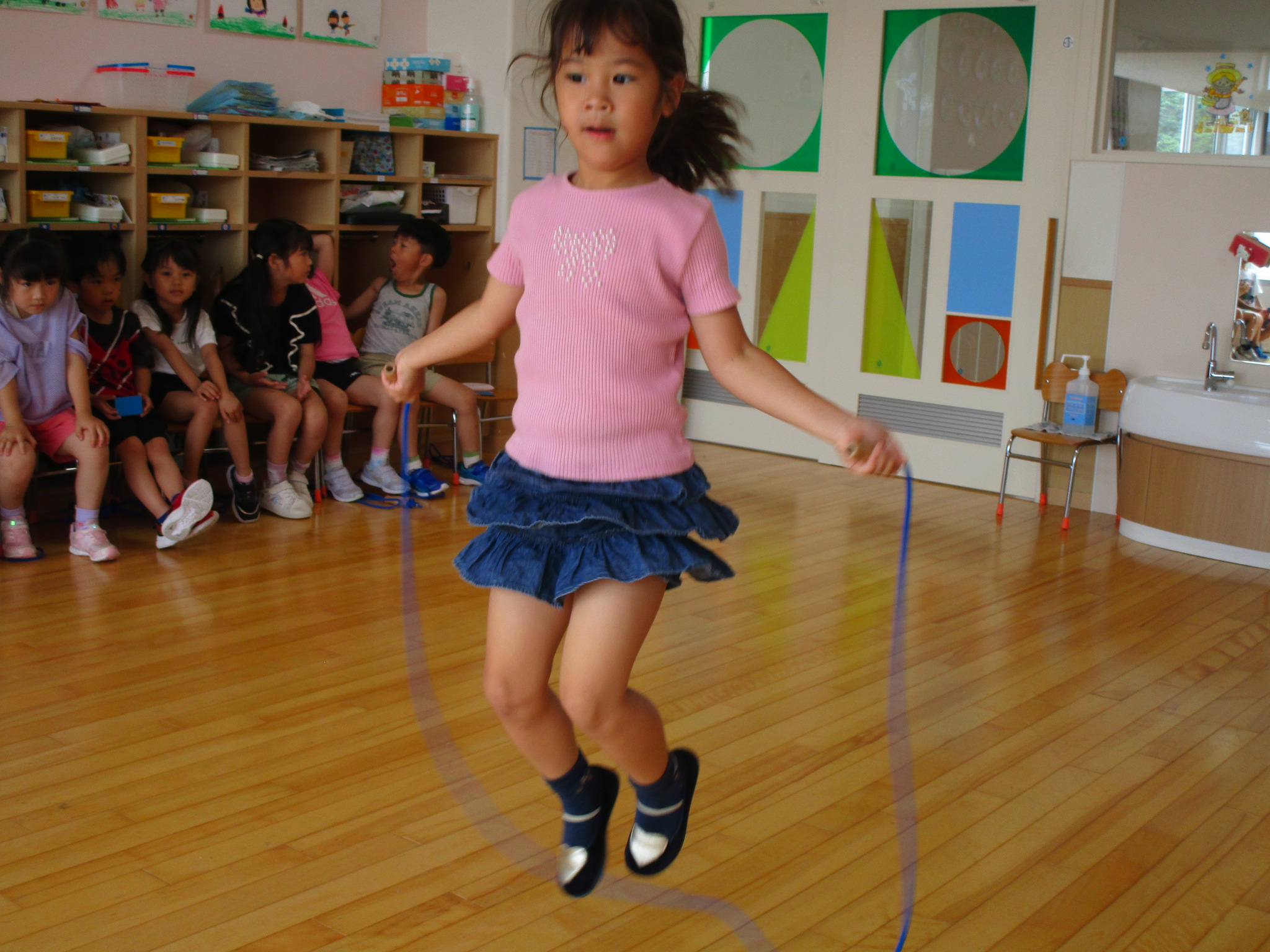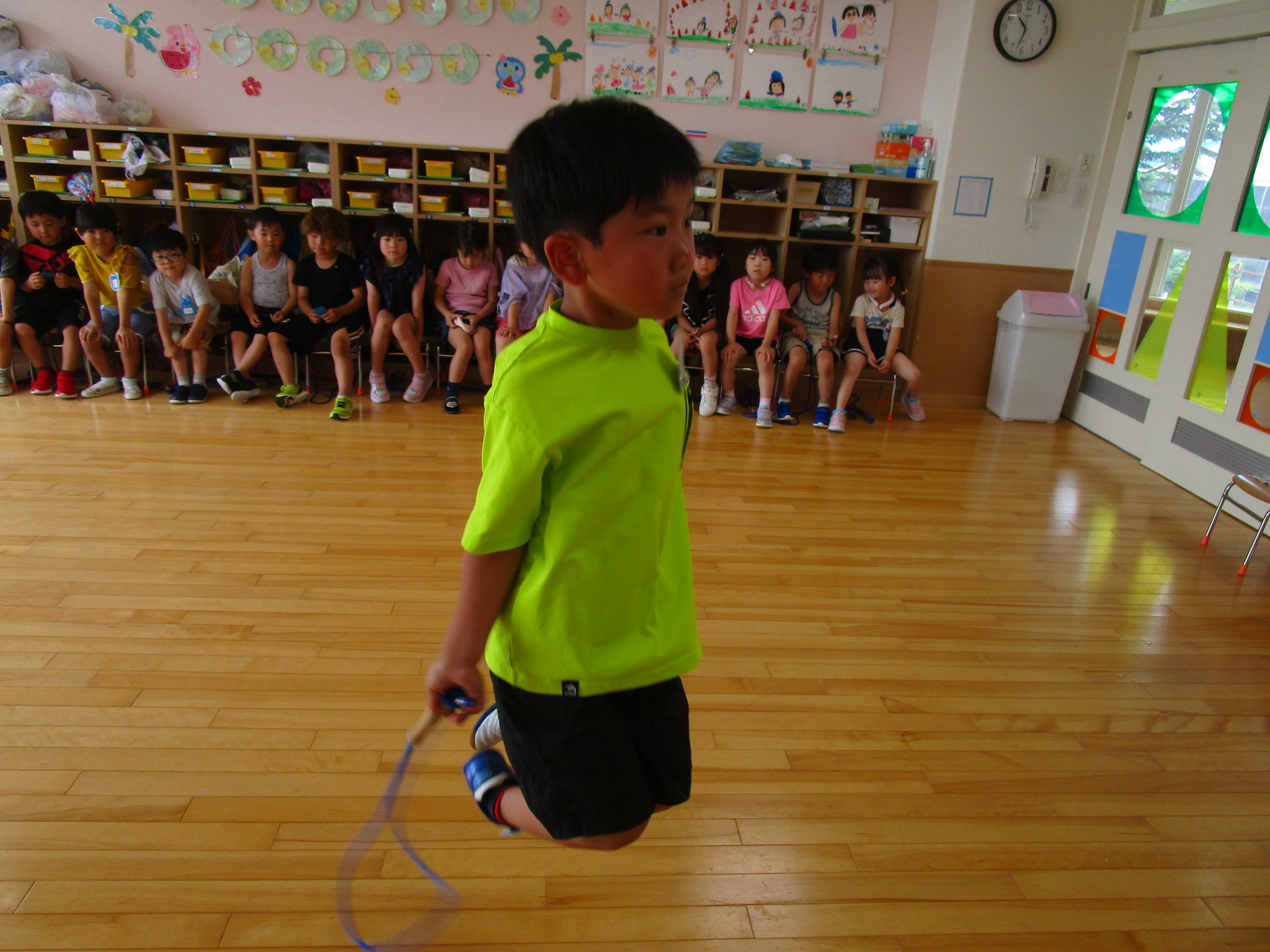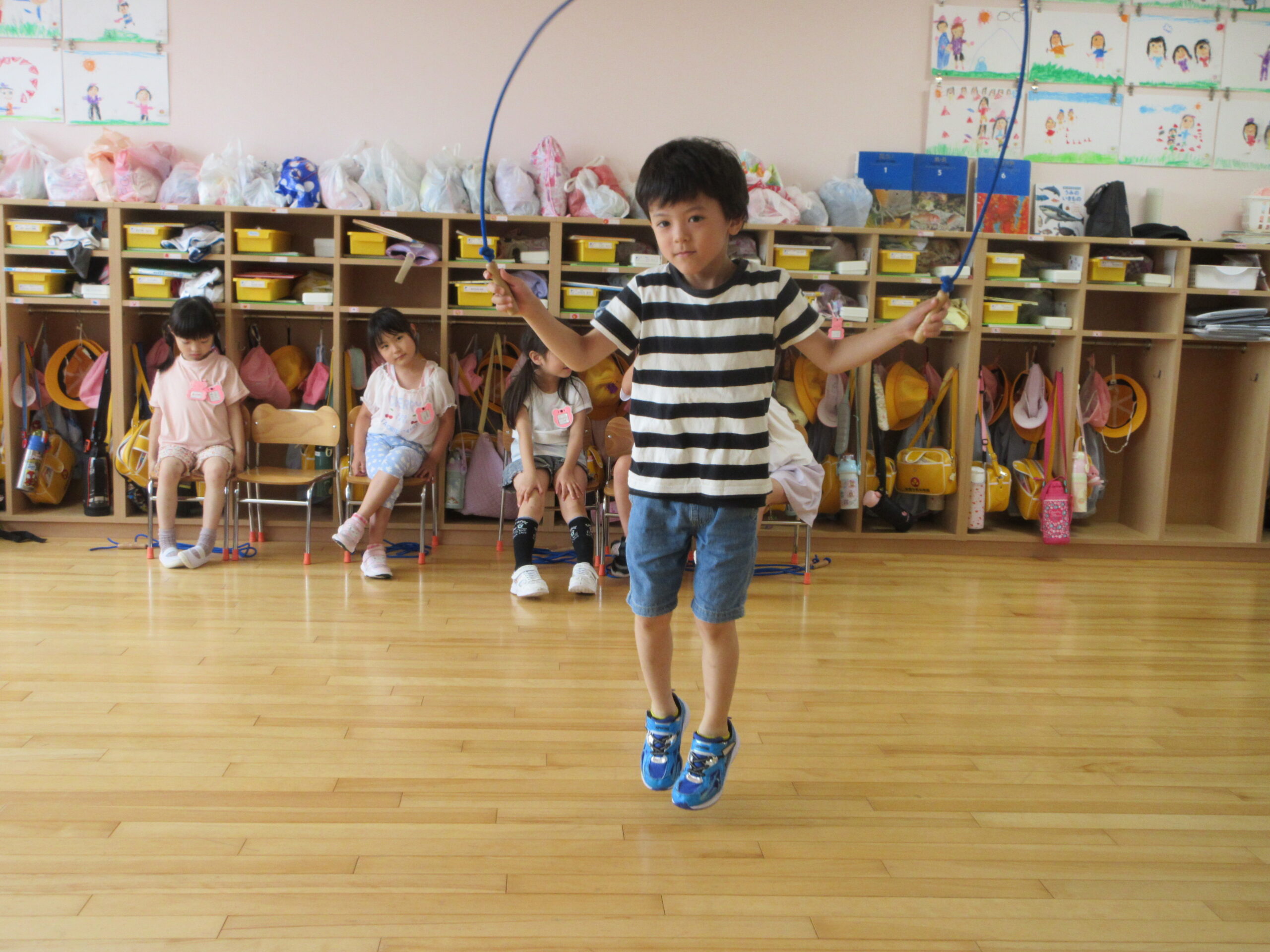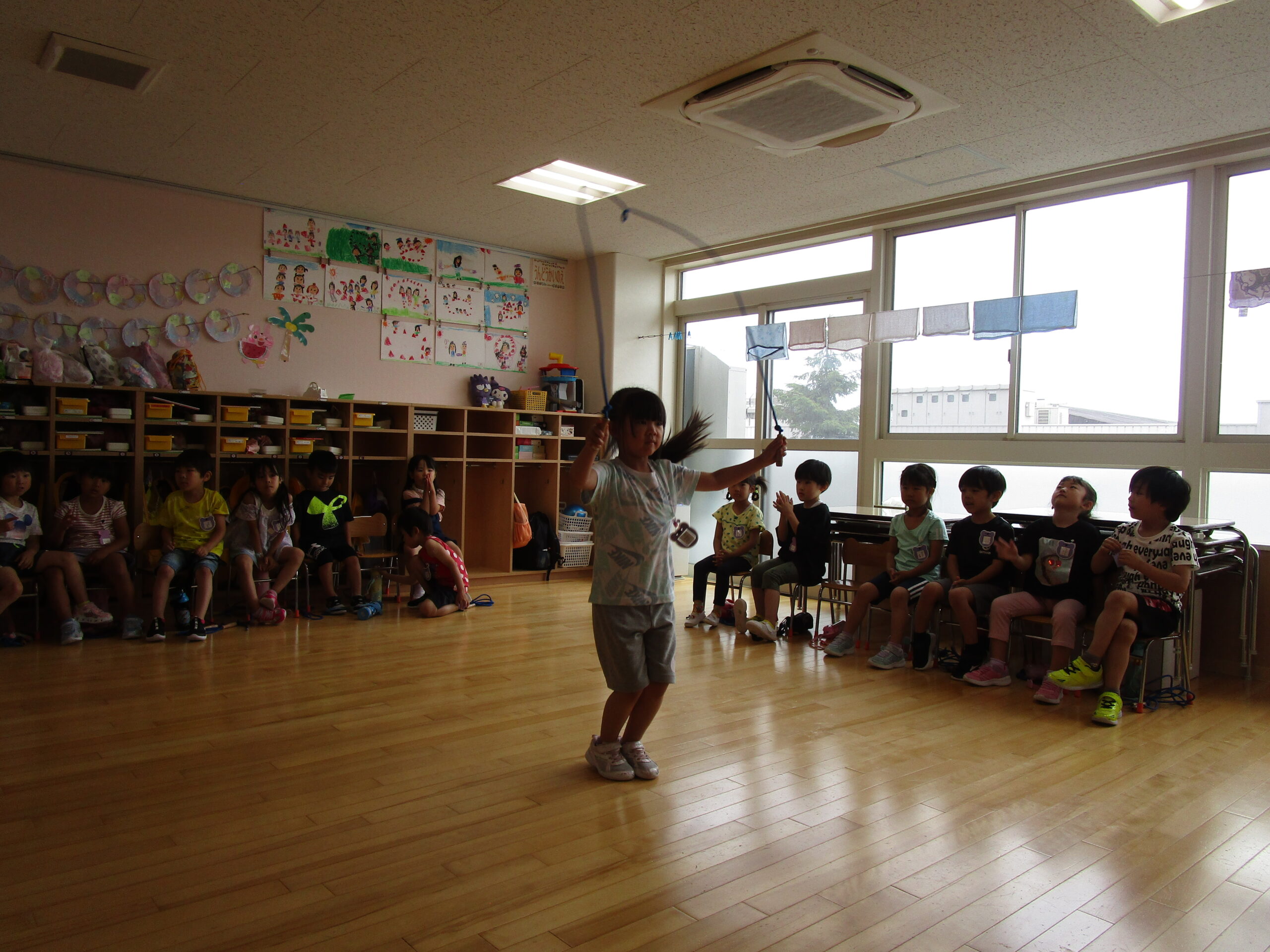 (48)令和6年度「年長学年 縄跳び大会」 2024年7月5日 園内ブログ 本日7月5日(金)お部屋でなわとび大会を行いました。進級してから初めての大会(お部屋)となりました。跳び続ける回数が多いお友達が1~5位の賞状がもらえます。1人ずつ皆の前で跳ぶので緊張して、いつもの力を発揮できないお友達もいましたが、1000回を超えるお友達もおり、沢山跳んでいるお友達を目標にし、一生懸命取り組んでいる姿が見られました。2学期も大会はありますので、頑張ってほしいと思います!🔥 【もも組】 【あじさい組】 【ふじ組】