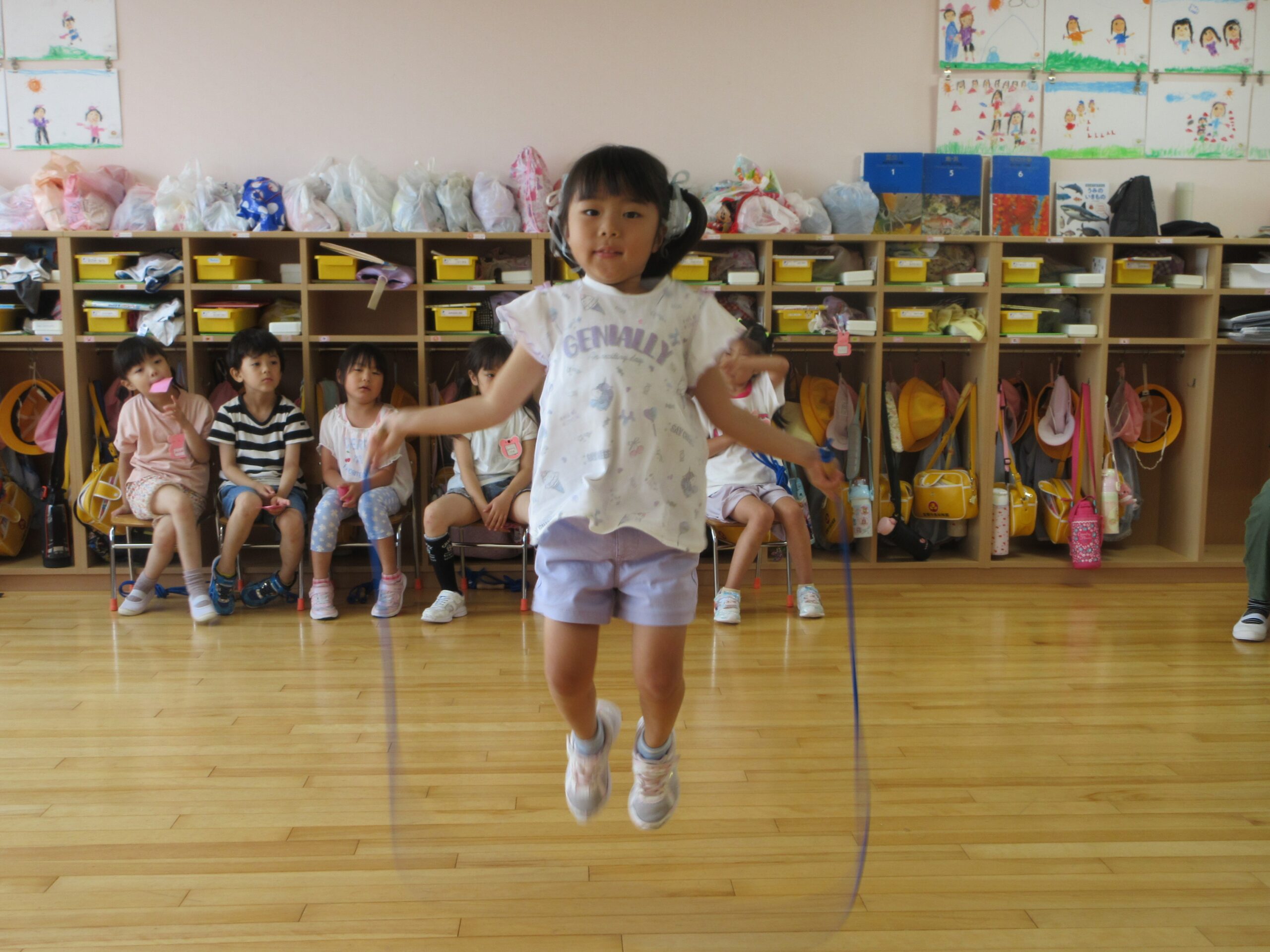 本日7月5日(金)お部屋でなわとび大会を行いました。進級してから初めての大会(お部屋)となりました。跳び続ける回数が多いお友達が1~5位の賞状がもらえます。1人ずつ皆の前で跳ぶので緊張して、いつもの力を発揮できないお友達もいましたが、1000回を超えるお友達もおり、沢山跳んでいるお友達を目標にし、一生懸命取り組んでいる姿が見られました。2学期も大会はありますので、頑張ってほしいと思います!🔥