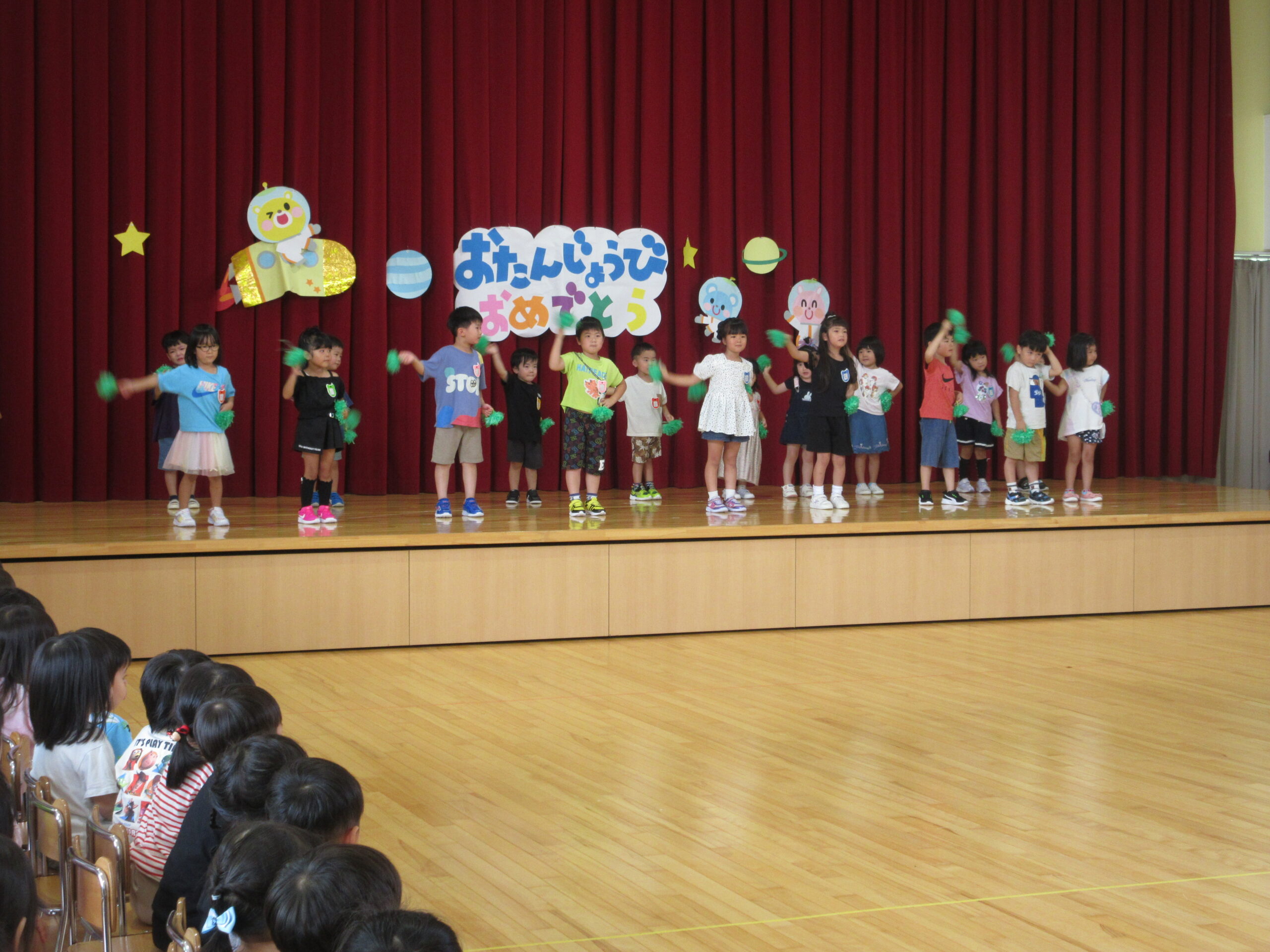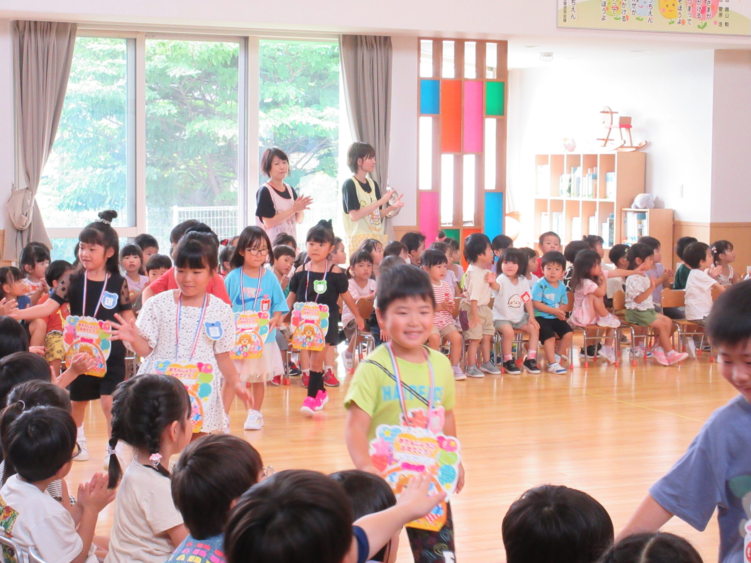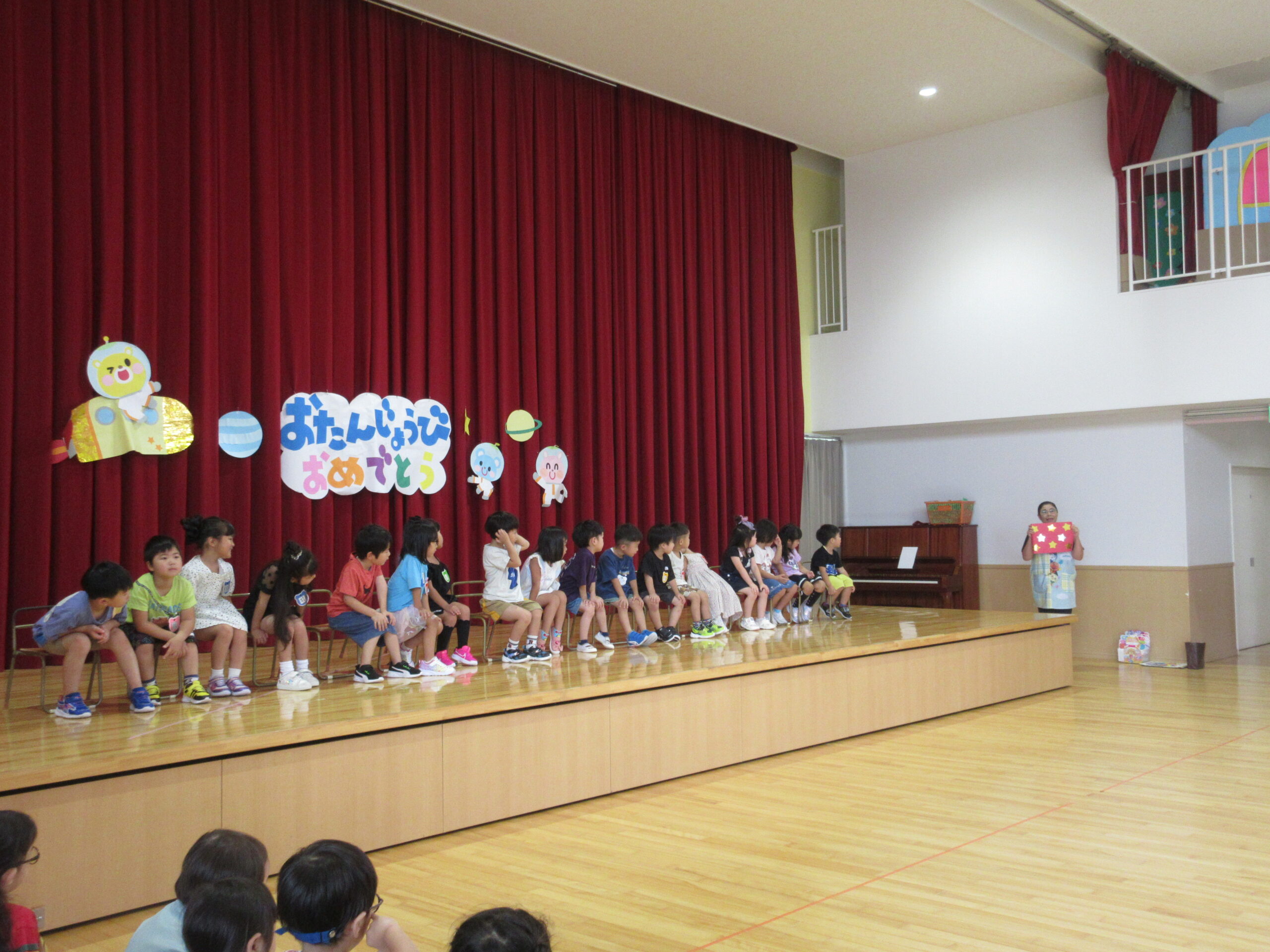 8月30日(金)は8月生まれ18名のお誕生会を実施しました。お誕生会練習が非常に短い8月生まれのお友達でしたが、自己紹介、お遊戯共に順調に覚え披露することができていました。「地球はみんなの大合唱」の踊りは可愛らしく表現し誕生会後は「おつかいありさん」ゲームを全園児で行い楽しむことができました。
