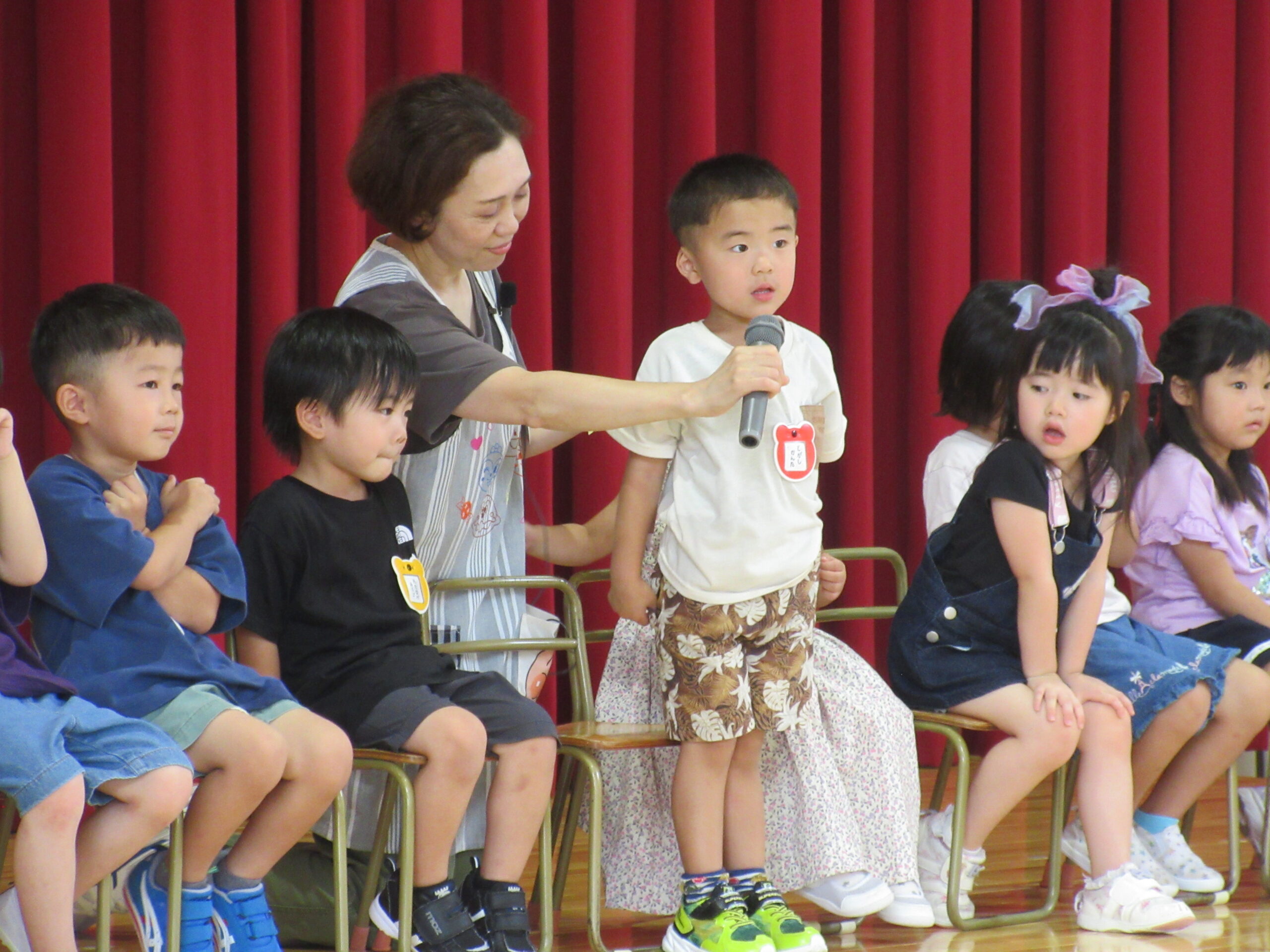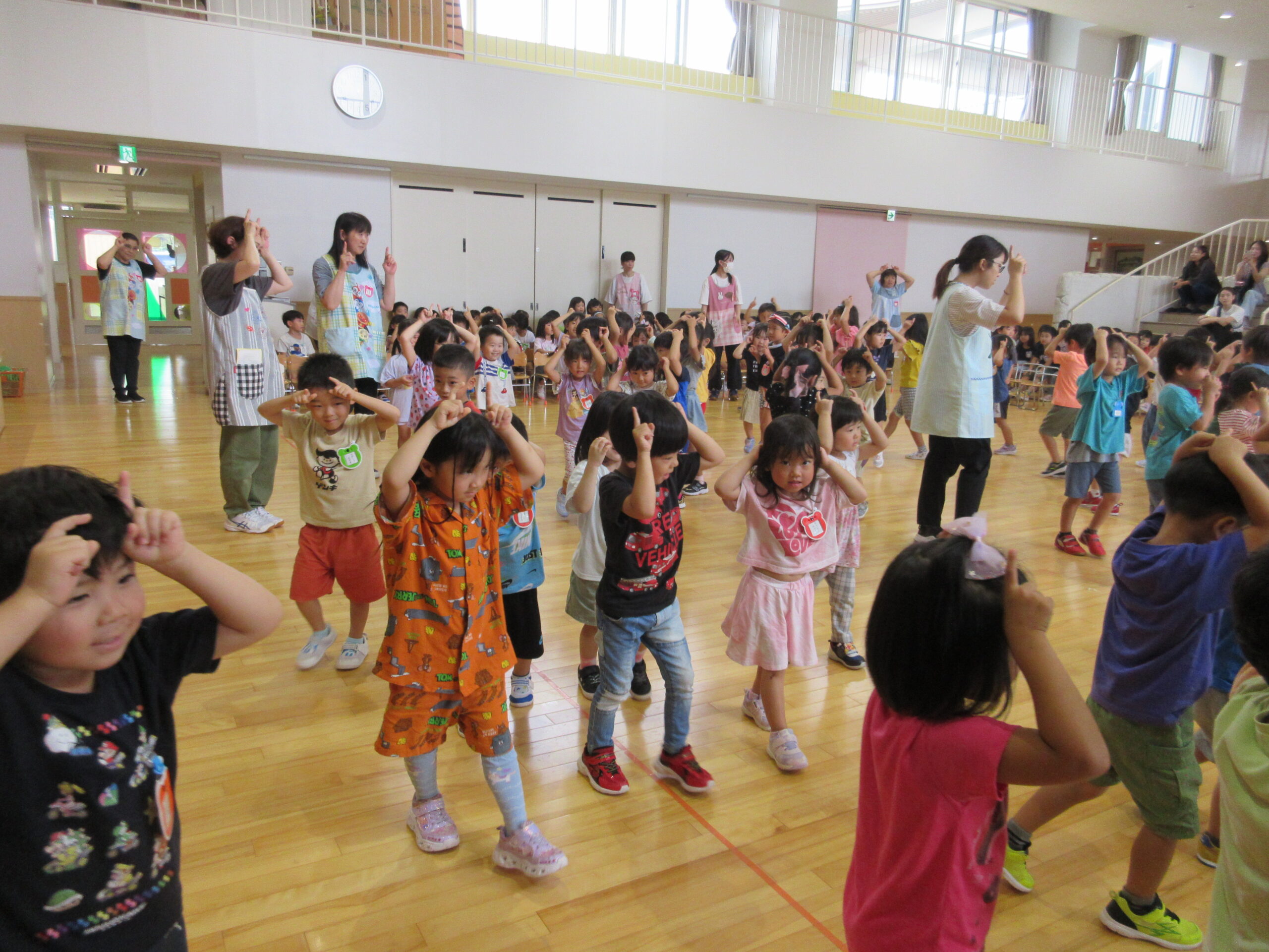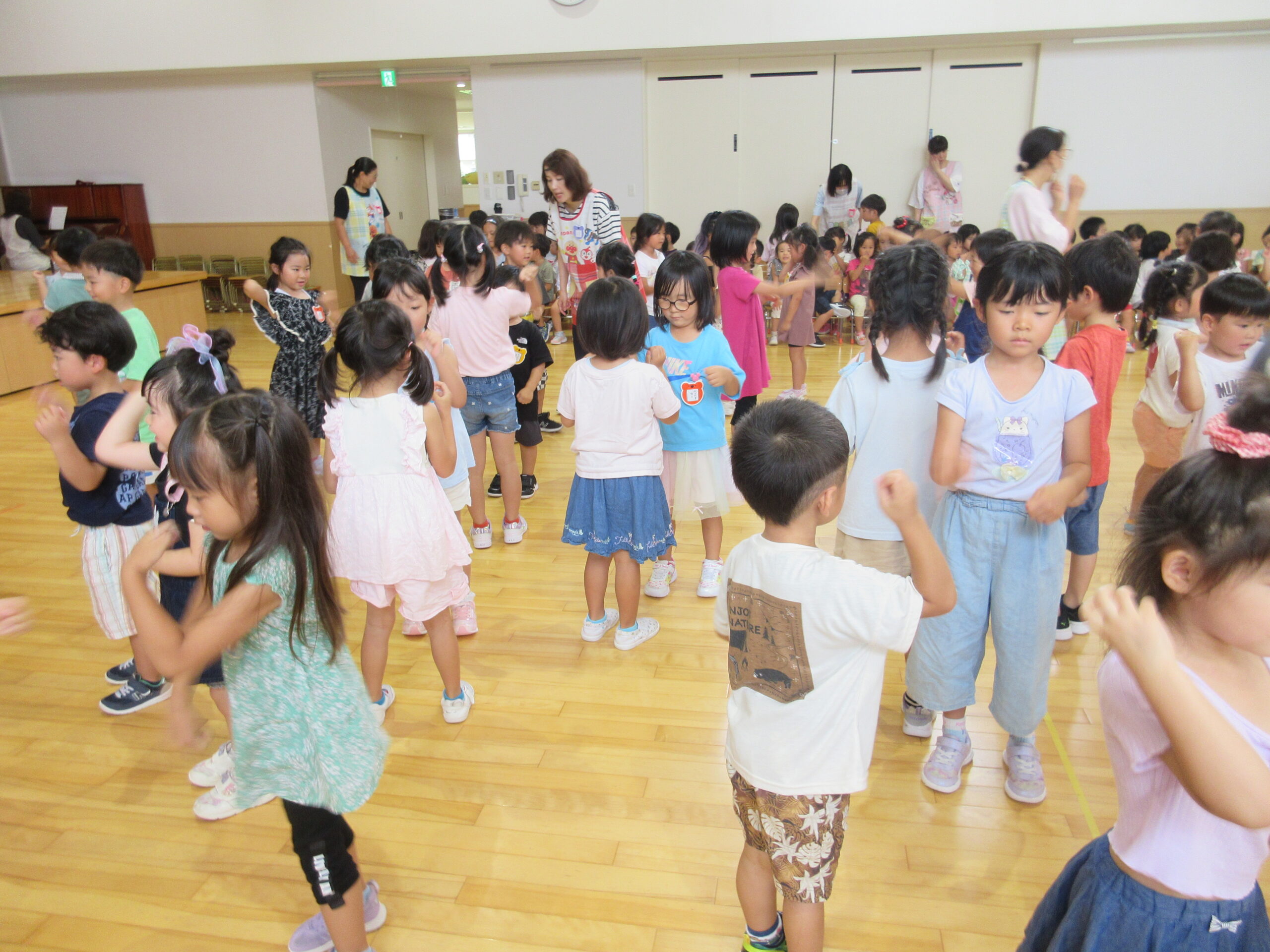 8月30日(金)は8月生まれ18名のお誕生会を実施しました。お誕生会練習が非常に短い8月生まれのお友達でしたが、自己紹介、お遊戯共に順調に覚え披露することができていました。「地球はみんなの大合唱」の踊りは可愛らしく表現し誕生会後は「おつかいありさん」ゲームを全園児で行い楽しむことができました。