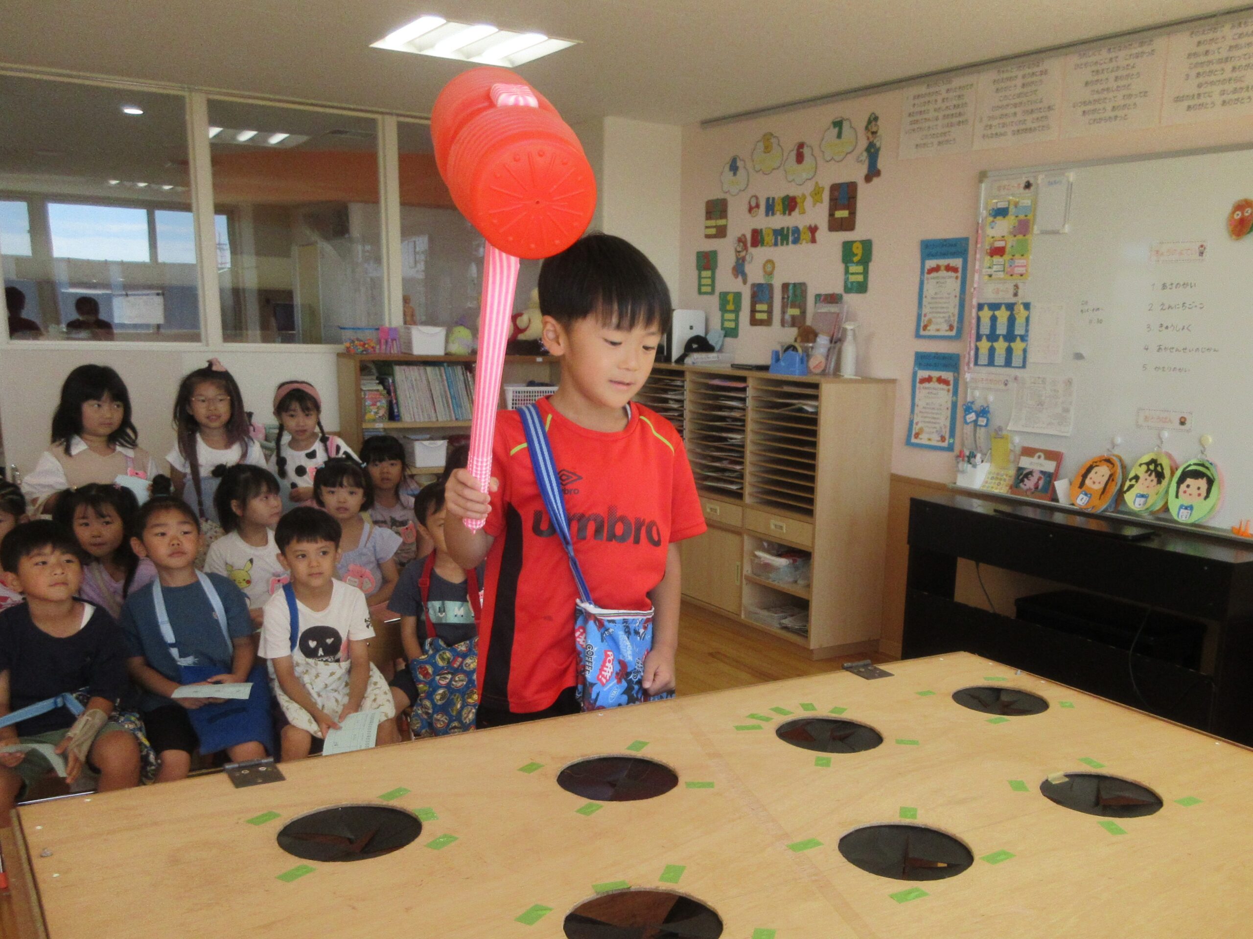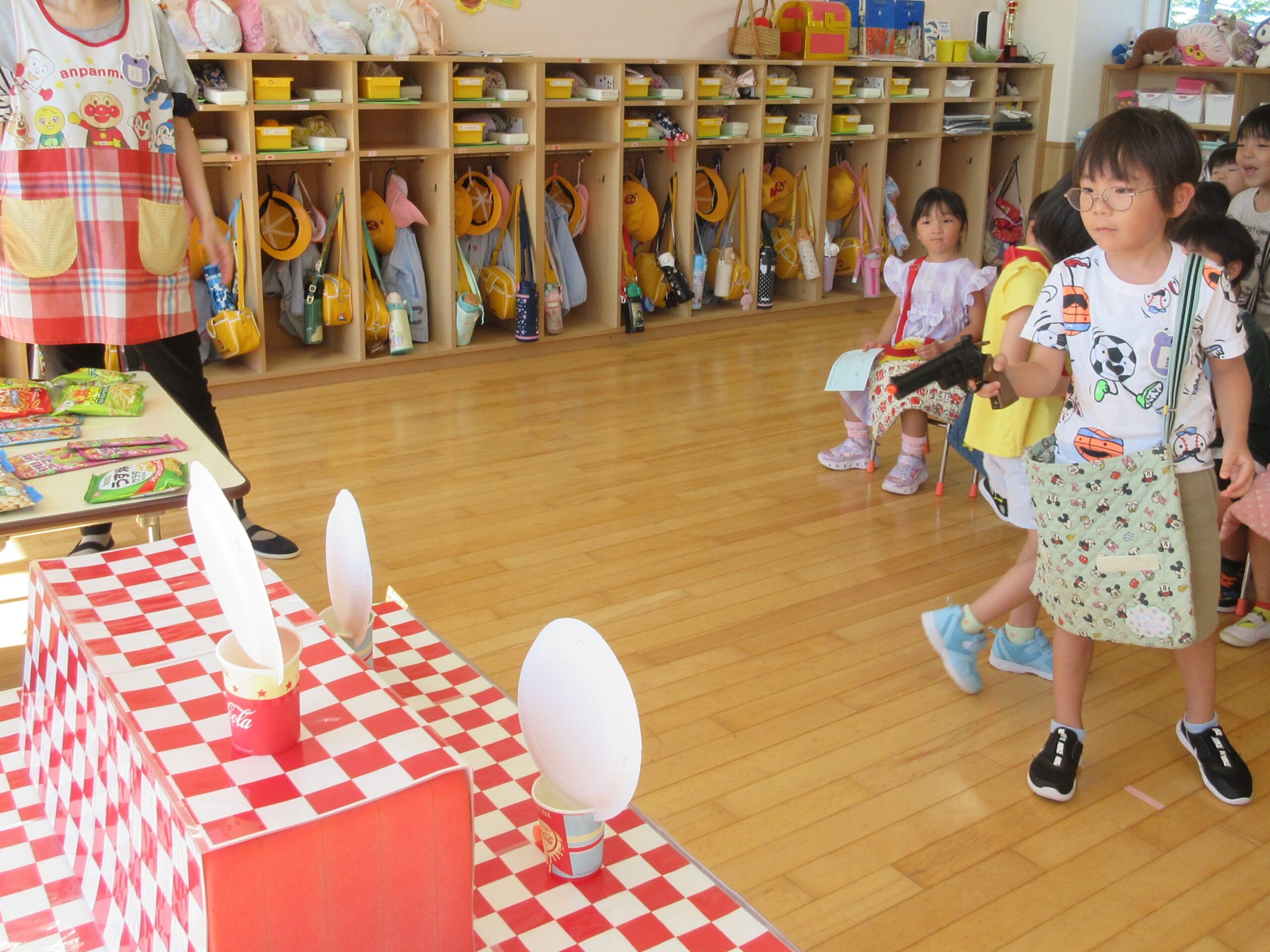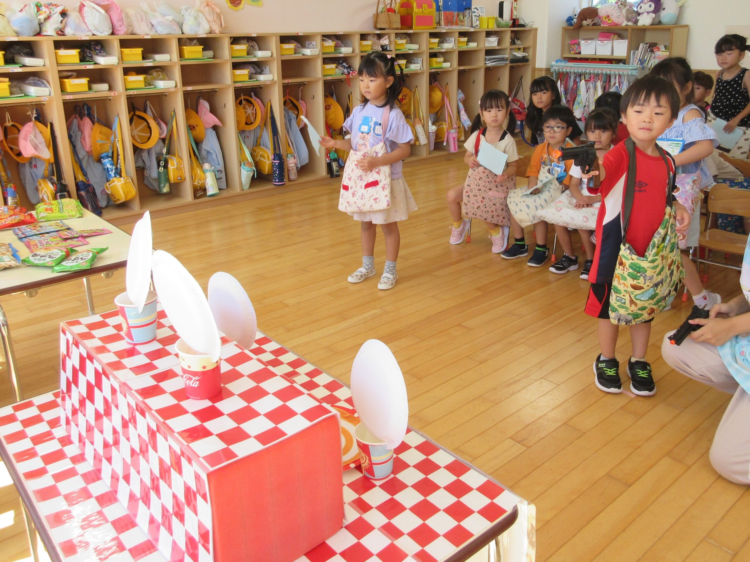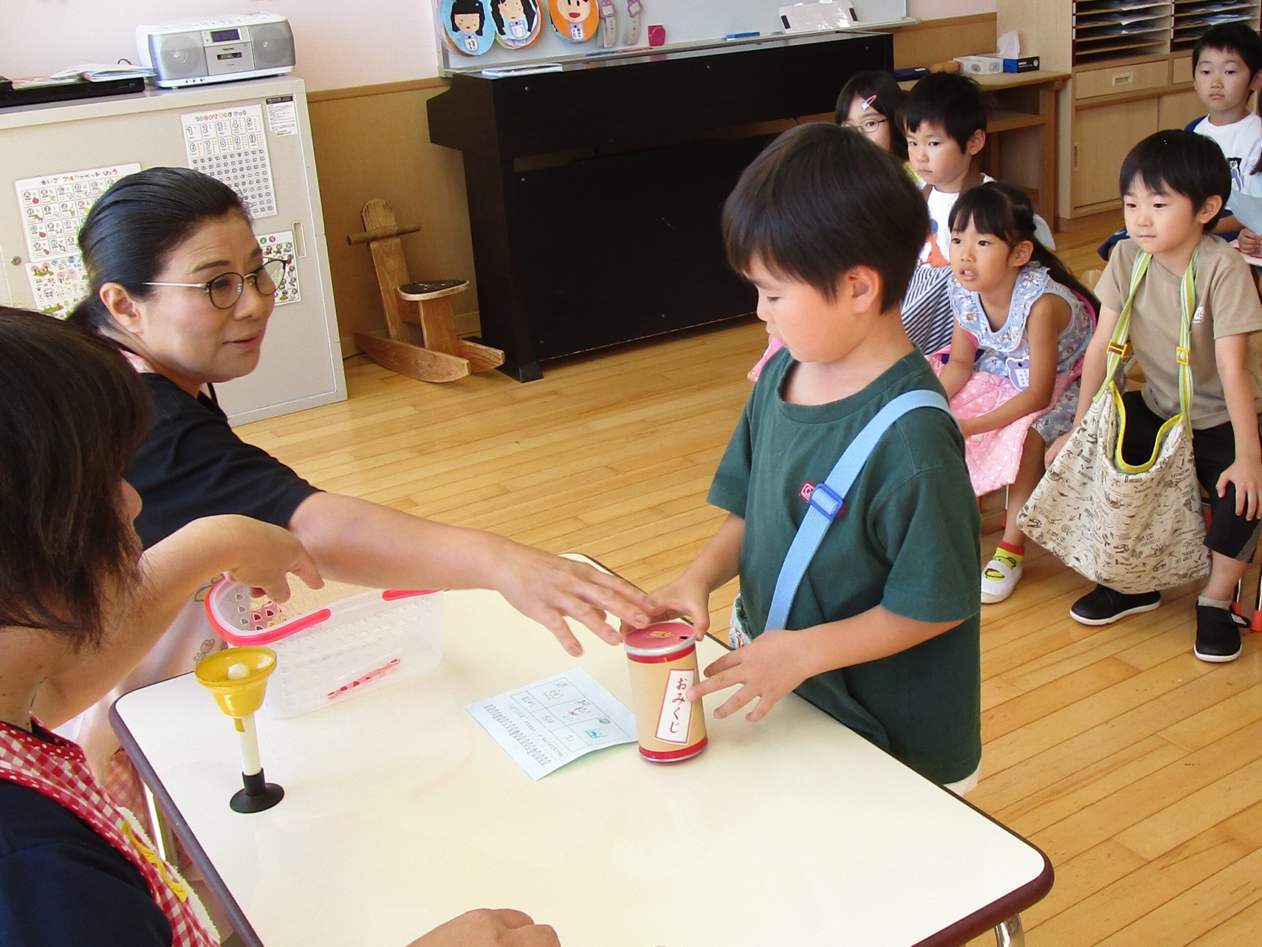 (66)令和6年度「年長学年 縁日ごっこ」 2024年9月3日 園内ブログ 昨日に引き続き今日9月3日は年長学年の縁日ごっこを実施しました。年長学年においては昨年経験している催し物もあることで、事が順調に運び時間に余裕をもって楽しんで参加することができていました。箇所箇所で声を上げながら充実した時間を過ごすことができていました。 今日の病気欠席者は、発熱2名、咳1名、体調不良1名、大事をとって2名です。 【射的】 【もぐらたたき】 【くじ】 🍙今日の給食🍙