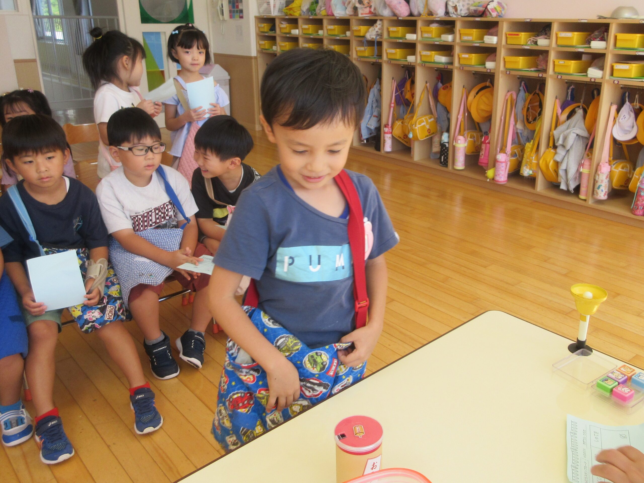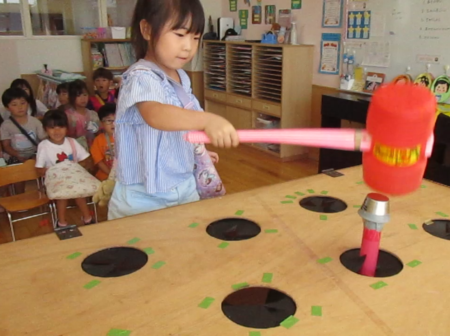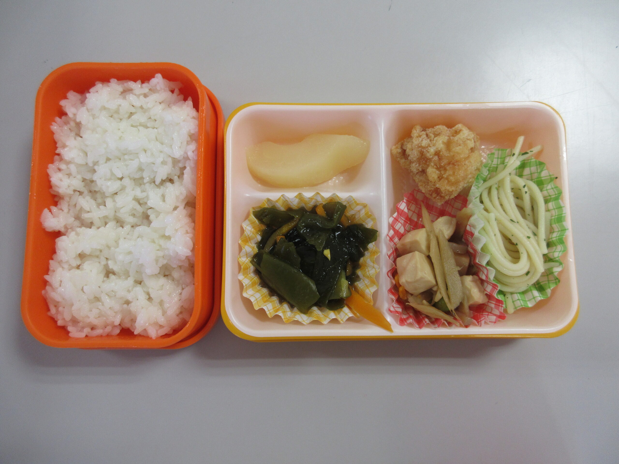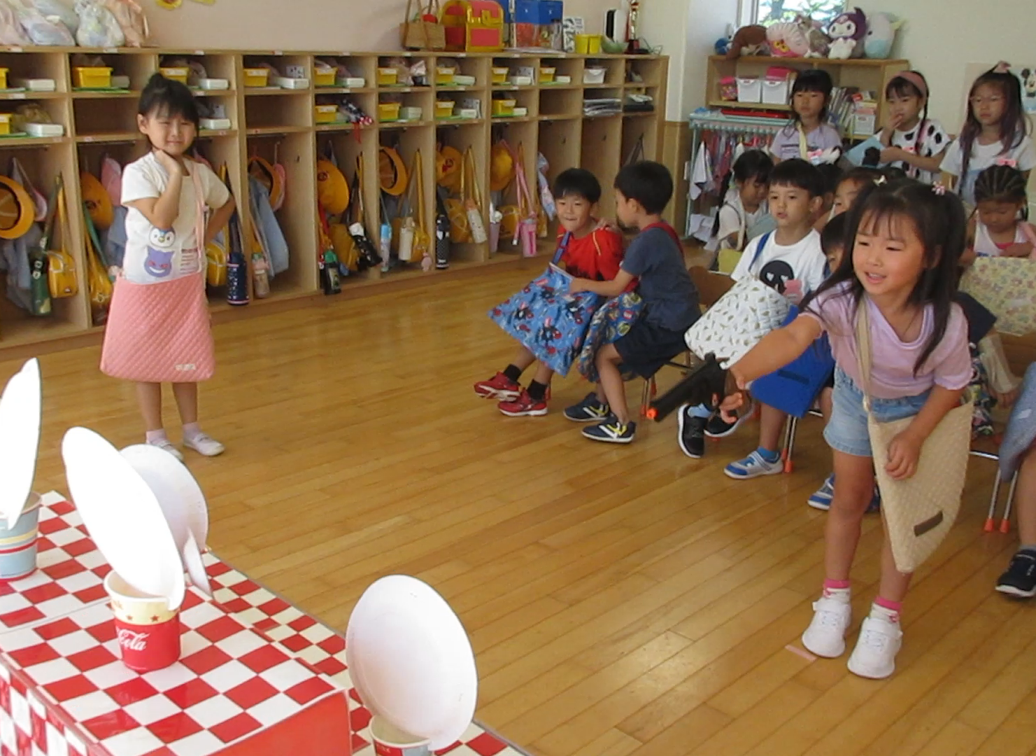 (66)令和6年度「年長学年 縁日ごっこ」 2024年9月3日 園内ブログ 昨日に引き続き今日9月3日は年長学年の縁日ごっこを実施しました。年長学年においては昨年経験している催し物もあることで、事が順調に運び時間に余裕をもって楽しんで参加することができていました。箇所箇所で声を上げながら充実した時間を過ごすことができていました。 今日の病気欠席者は、発熱2名、咳1名、体調不良1名、大事をとって2名です。 【射的】 【もぐらたたき】 【くじ】 🍙今日の給食🍙
