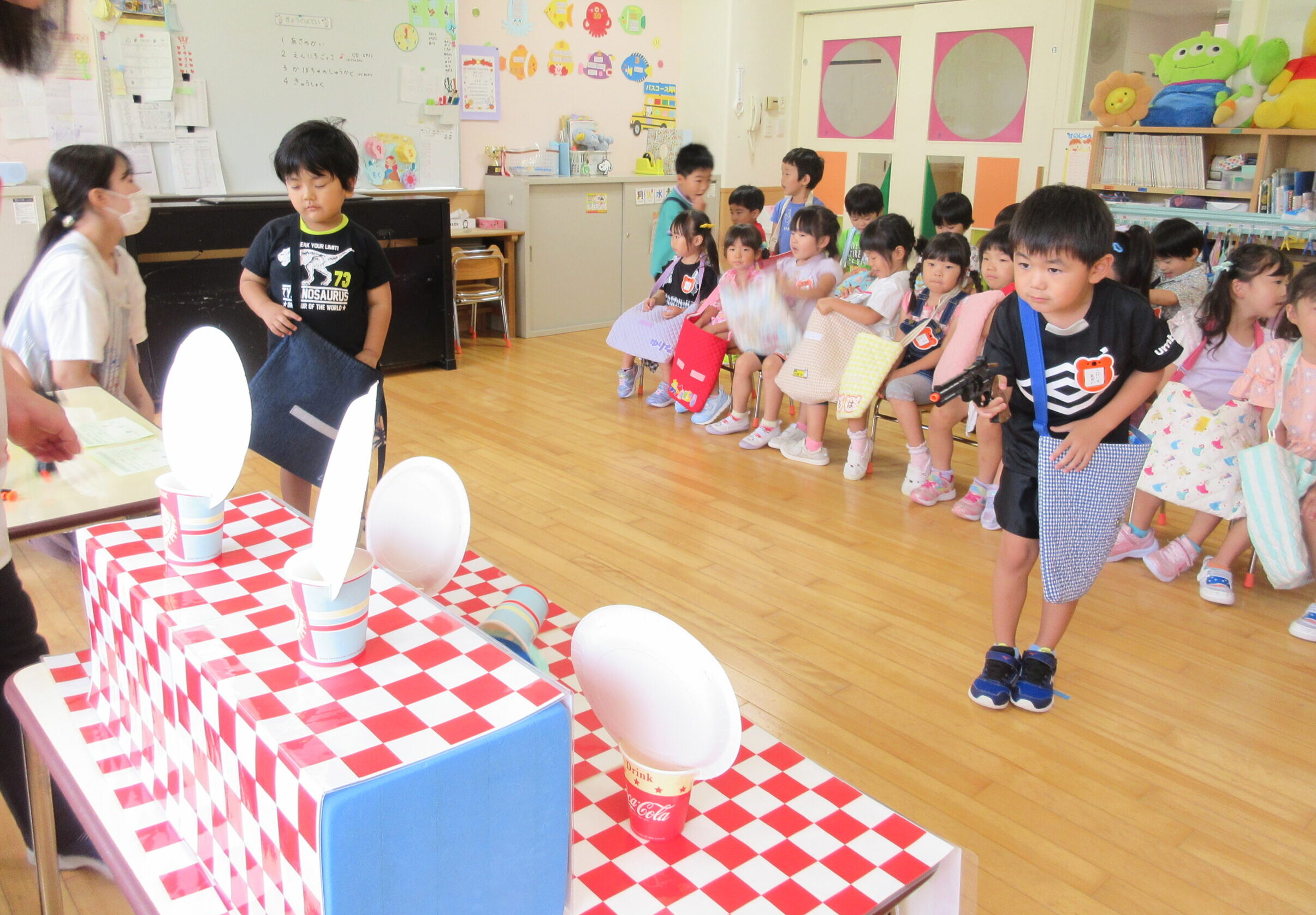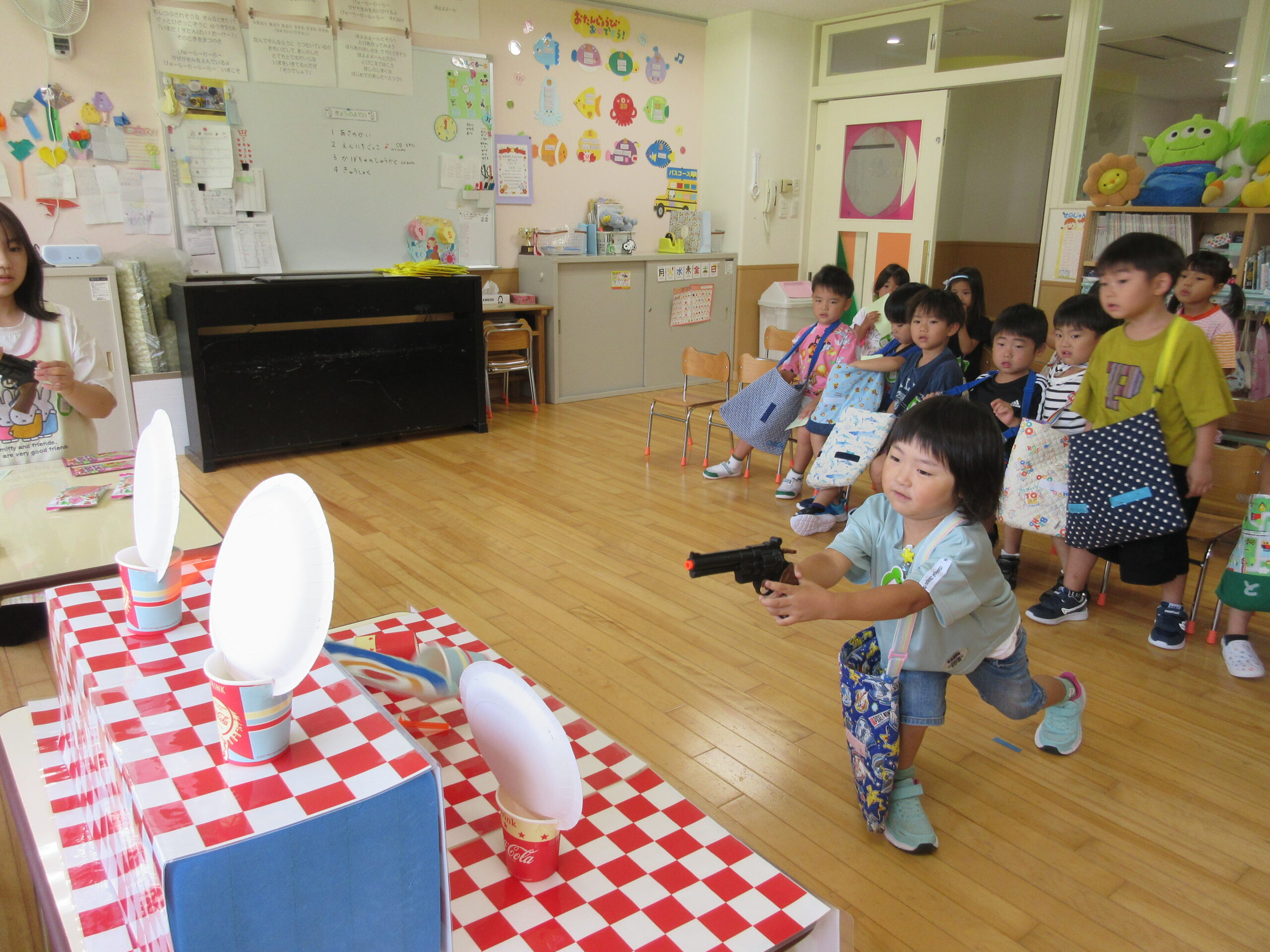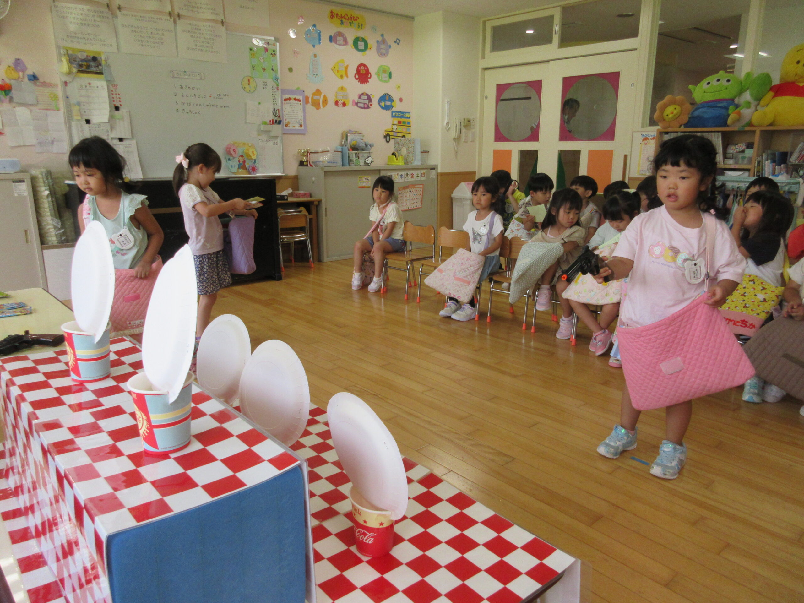 今日9月5日(木)は年中学年の縁日ごっこでした。本日最終日の縁日ごっこです。年中学年の子ども達はそれぞれのカードを見せ合いながら、お部屋を回っており少々難しい射的にも積極的に参加していました。テンションが高く落ち着かない様子ではありましたがお友達同士声掛けもよく喜んでいる姿が見られていました。