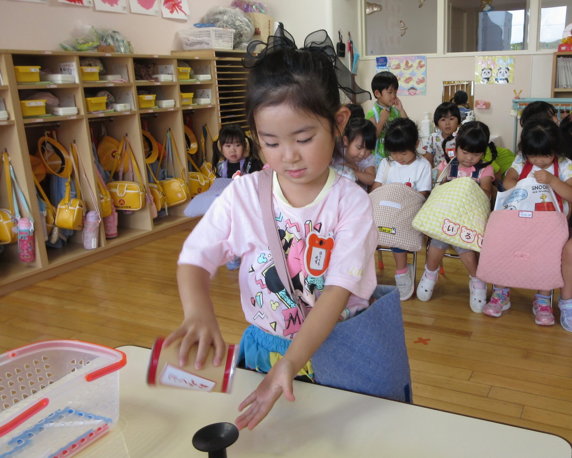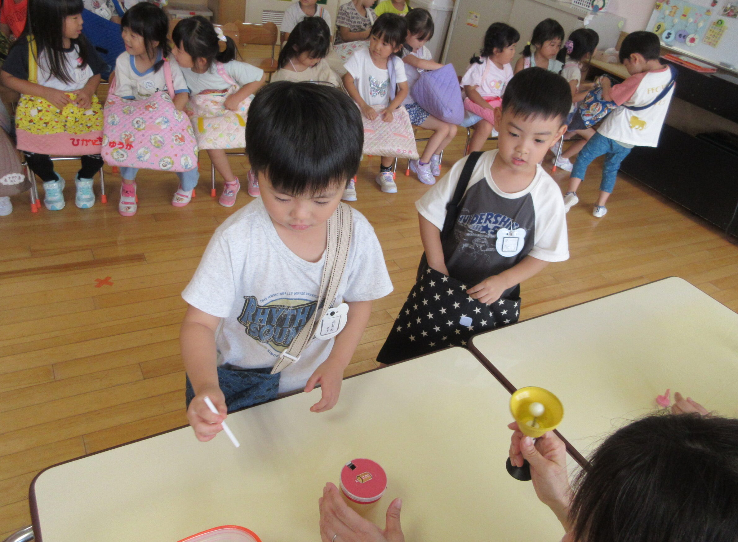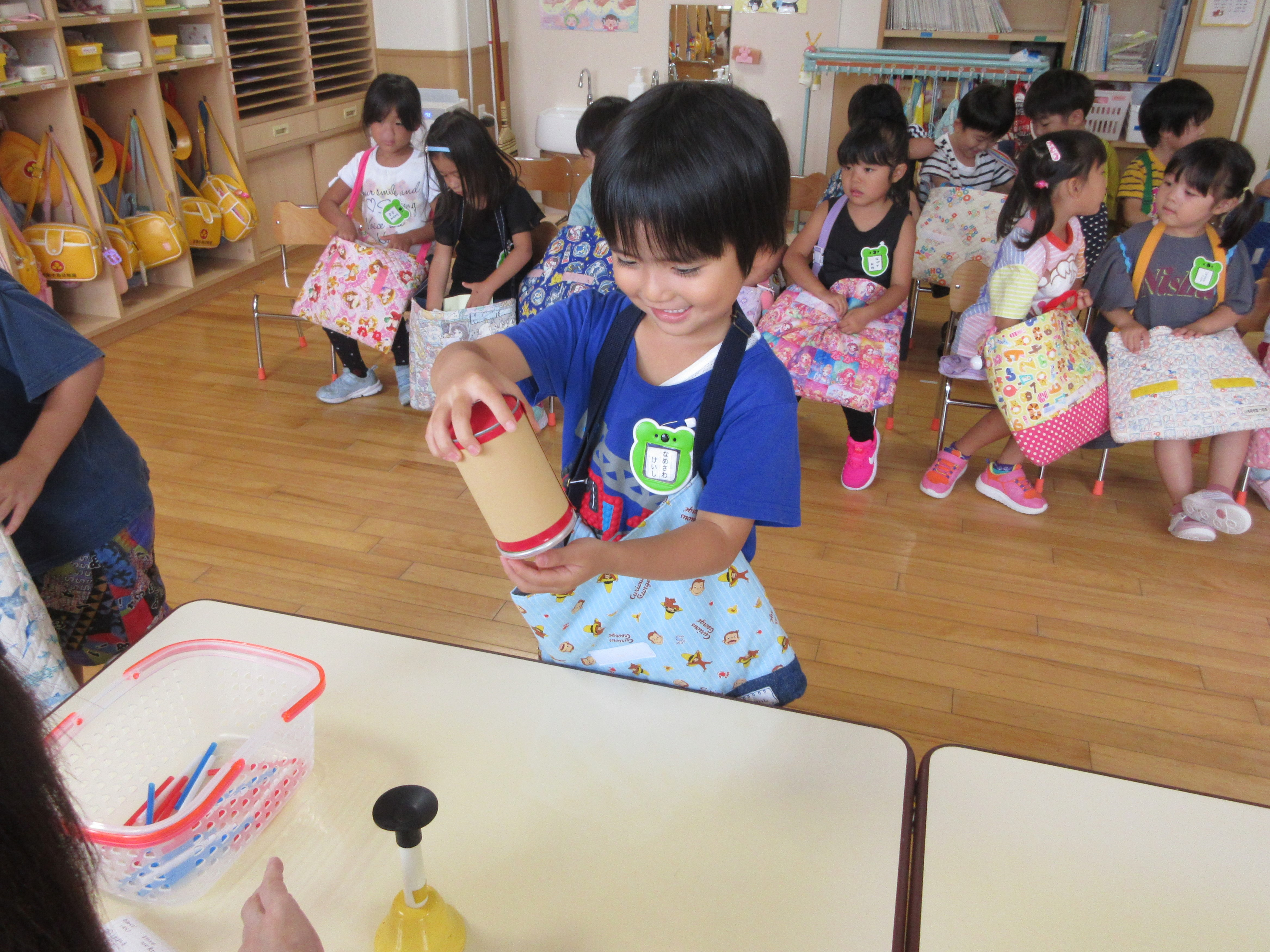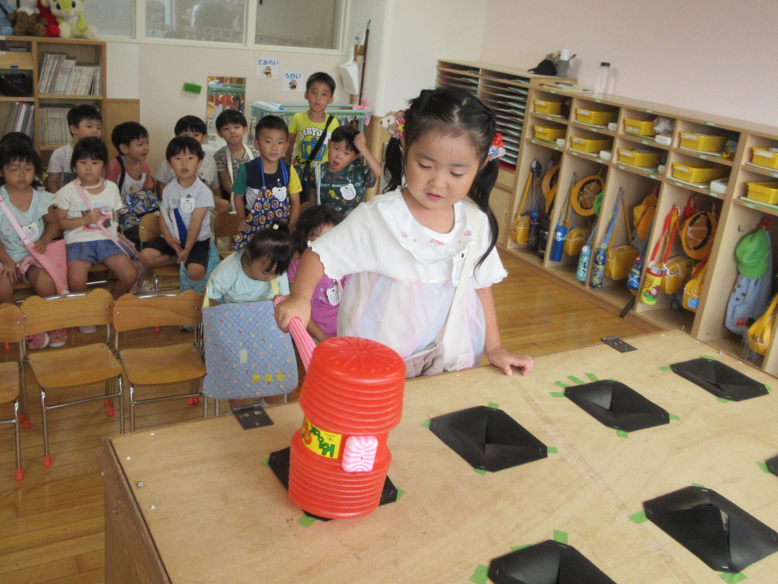 今日9月5日(木)は年中学年の縁日ごっこでした。本日最終日の縁日ごっこです。年中学年の子ども達はそれぞれのカードを見せ合いながら、お部屋を回っており少々難しい射的にも積極的に参加していました。テンションが高く落ち着かない様子ではありましたがお友達同士声掛けもよく喜んでいる姿が見られていました。