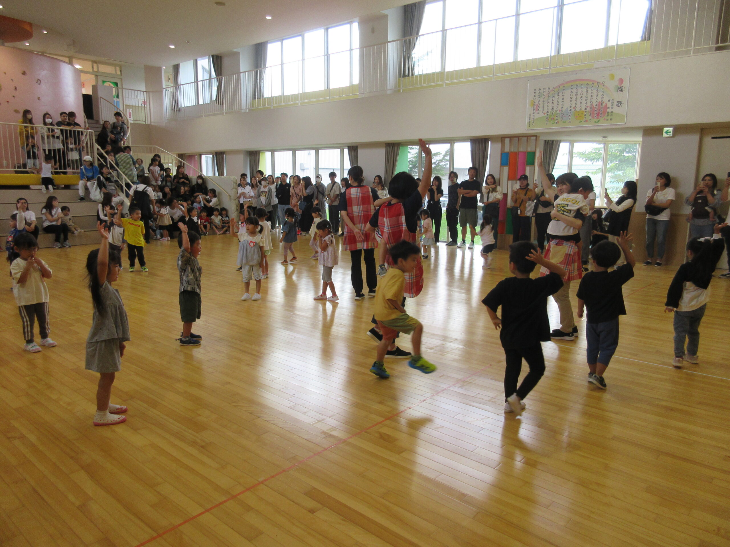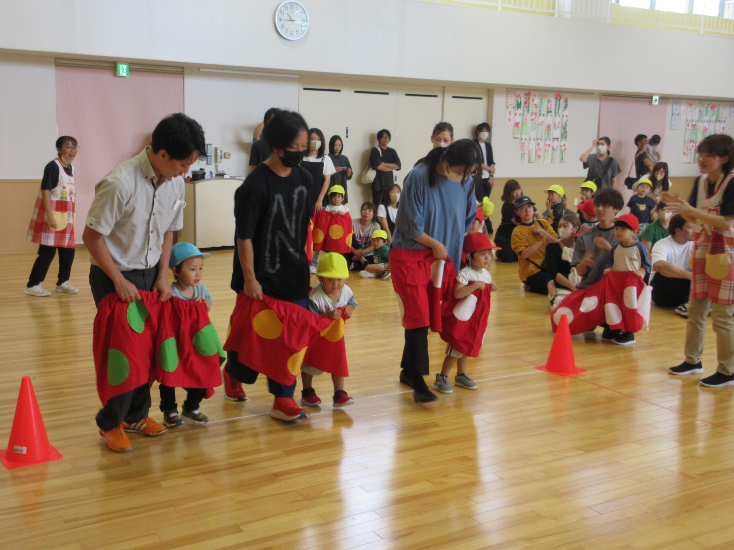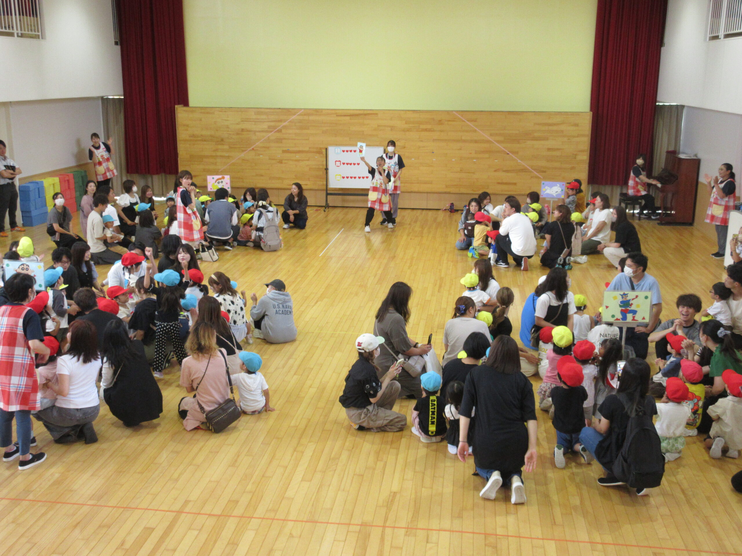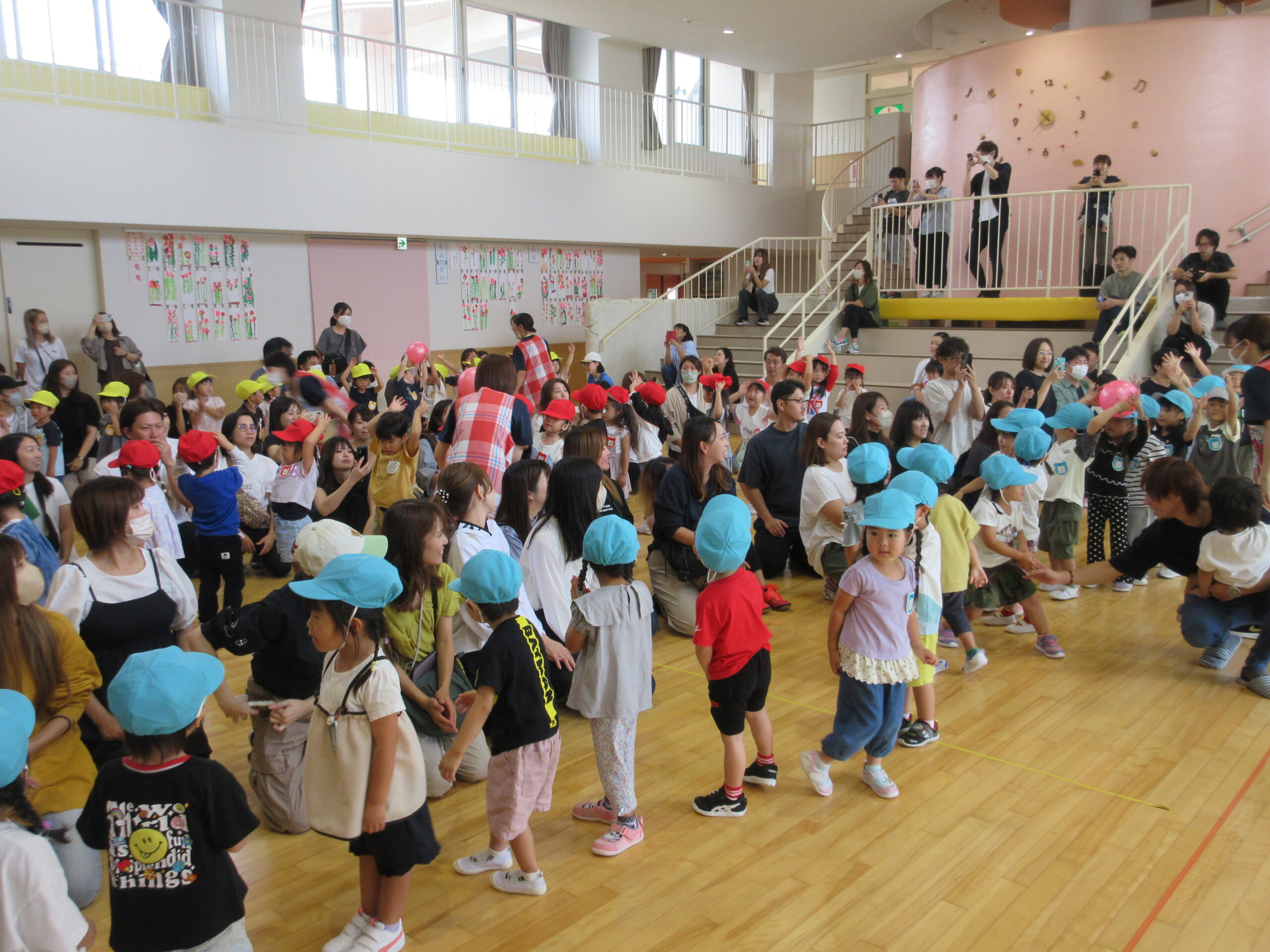 本日9月20日(金)は年少学年の参観日です。年少学年は運動遊びということで親子でボール送りリレーをし上手に手渡しながら楽しむ姿がみられました。その後、親子でペアになりデカパンツ競争をしました。クラス対抗で行い親子共に競争心がマックスになった一面が見られたのではないでしょうか。また、「ぴったしカンカンゲーム」ではクレヨンしんちゃんのキャラクター選びに迷いながらも決断してましたね!年少さんは保護者の方からなかなか離れられないお友達もおりましたが、2学期が始まり園生活に慣れ、成長した姿をお見せできたと思います。今日は親子で楽しく競技ができ、ご協力頂きました保護者の皆様ありがとうございました。