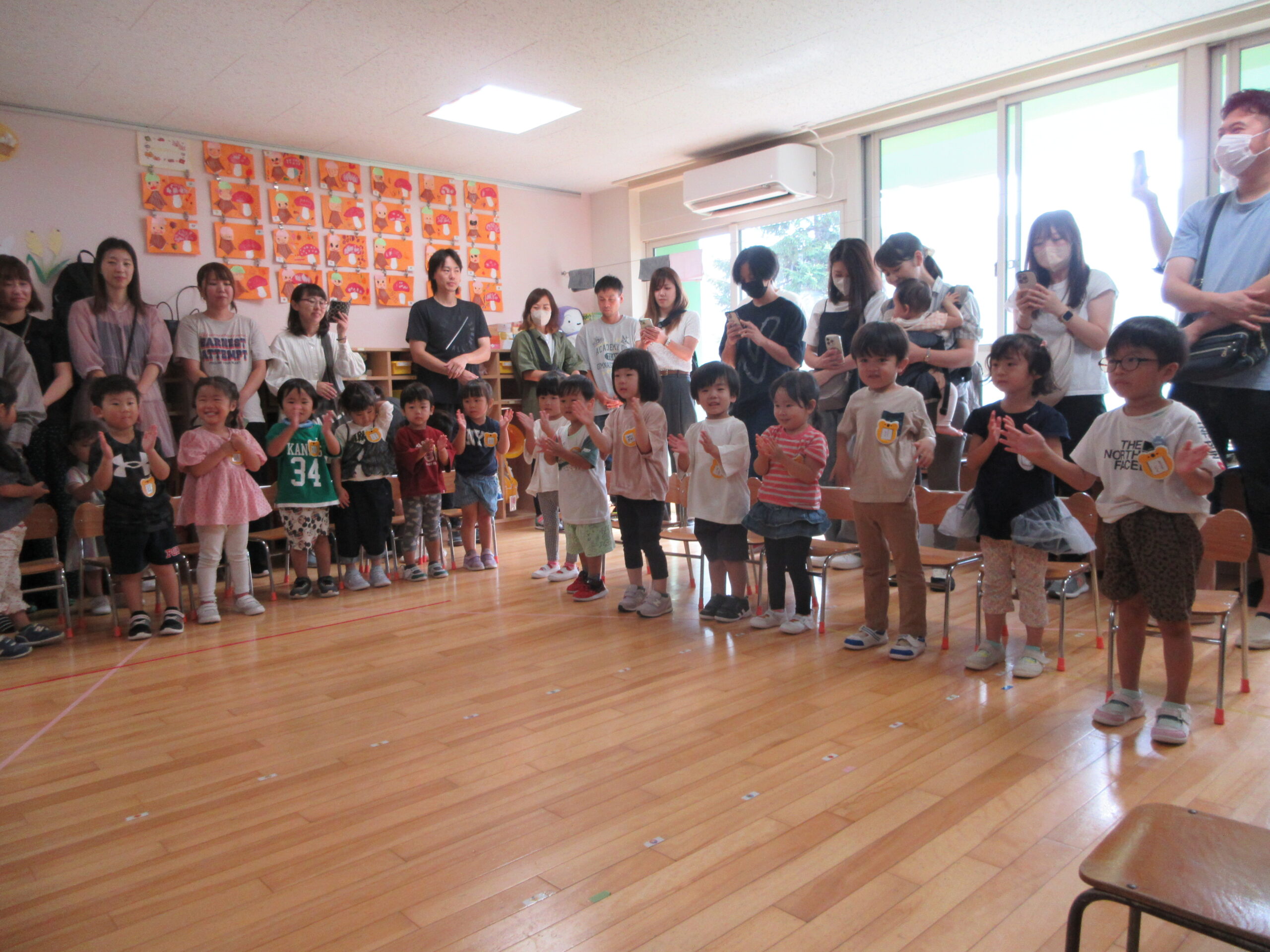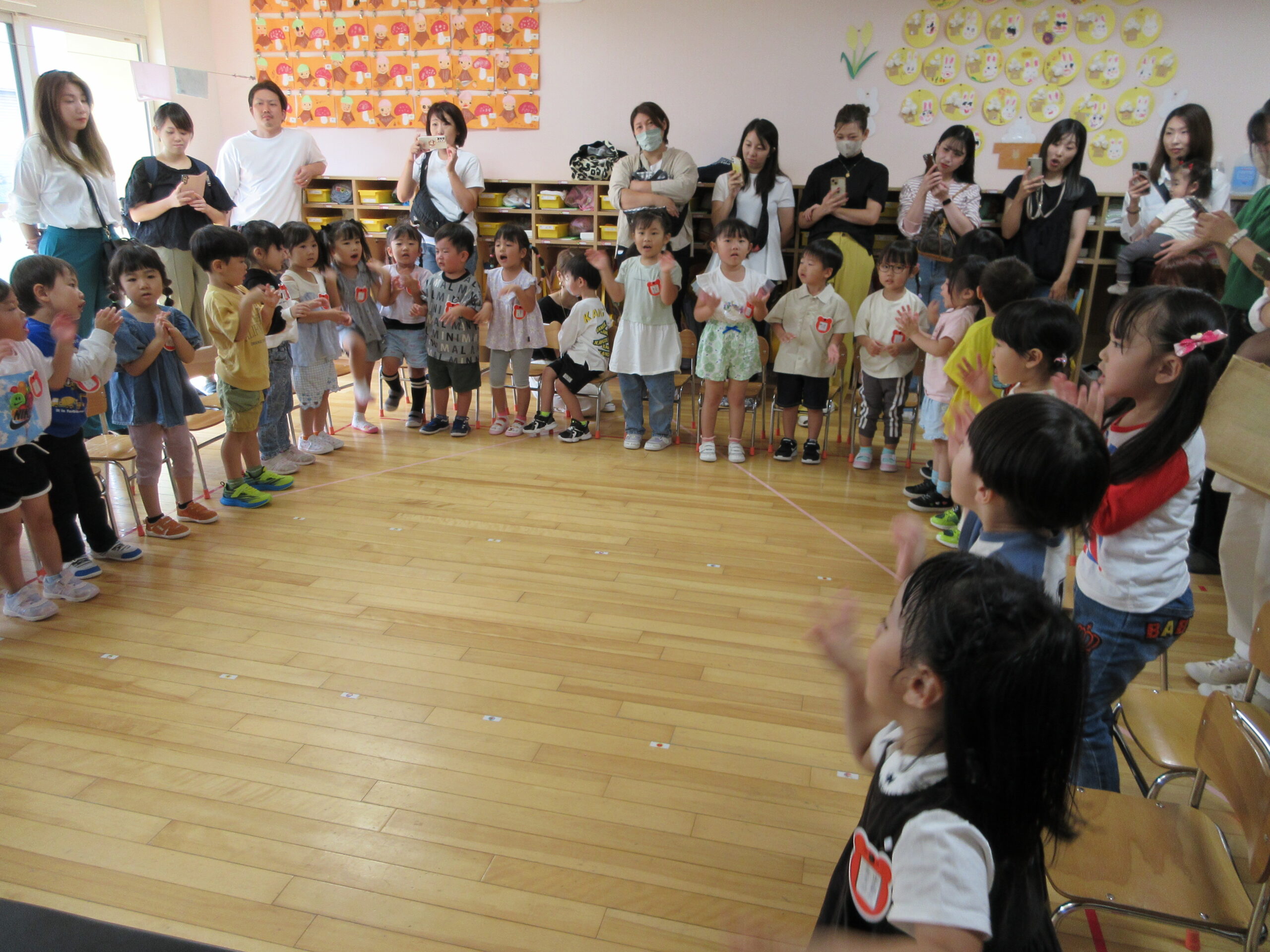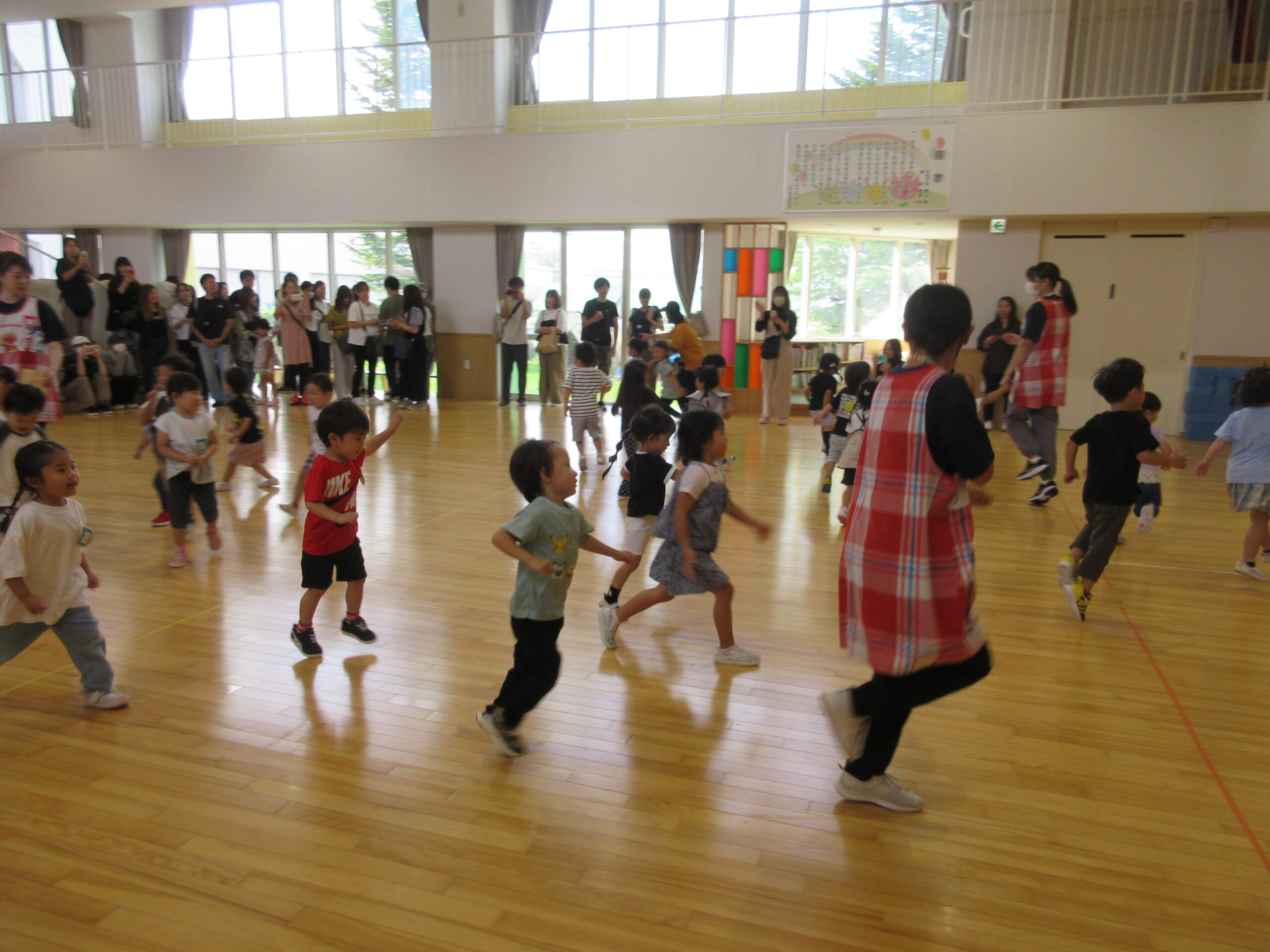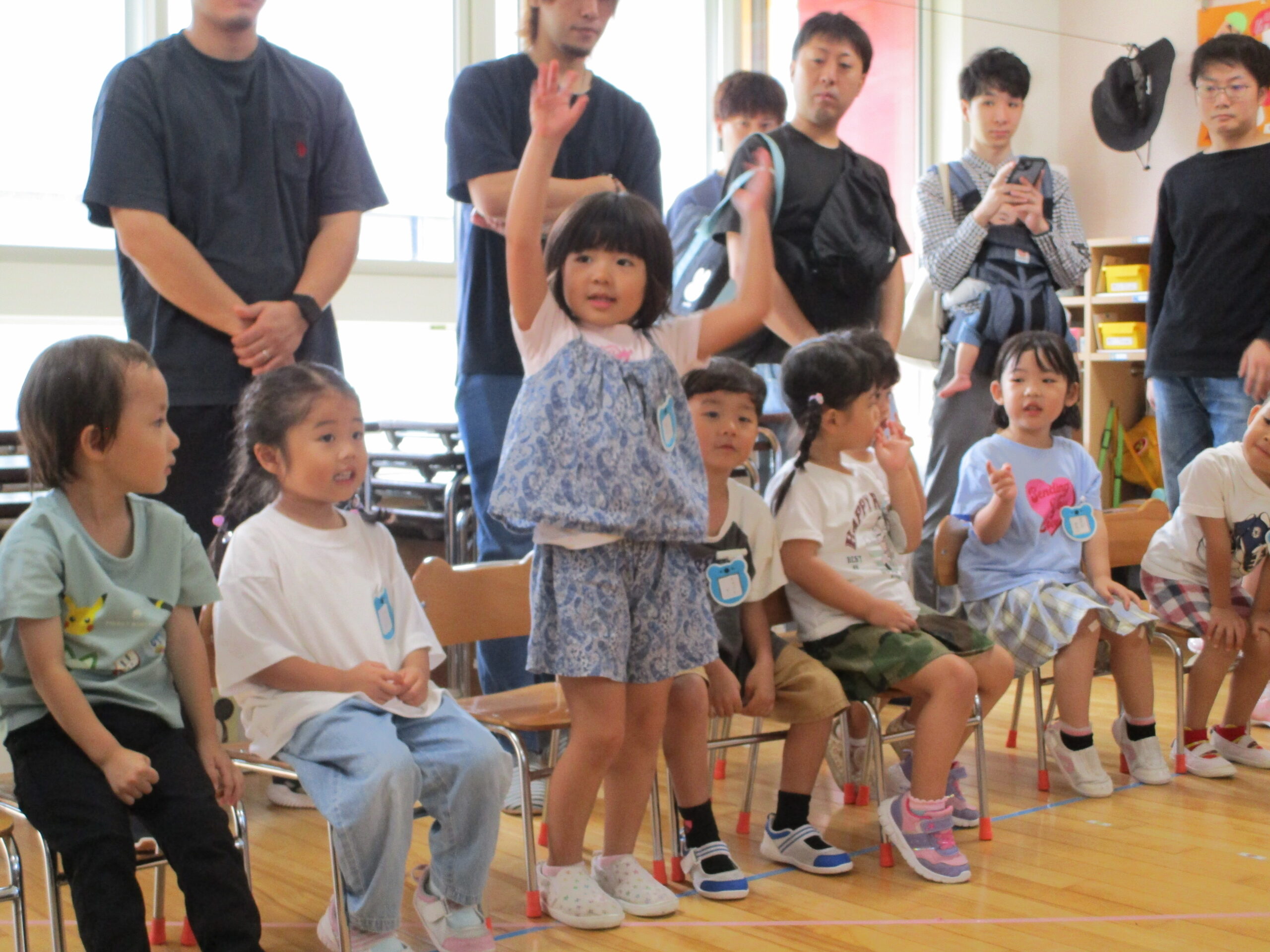 本日9月20日(金)は年少学年の参観日です。年少学年は運動遊びということで親子でボール送りリレーをし上手に手渡しながら楽しむ姿がみられました。その後、親子でペアになりデカパンツ競争をしました。クラス対抗で行い親子共に競争心がマックスになった一面が見られたのではないでしょうか。また、「ぴったしカンカンゲーム」ではクレヨンしんちゃんのキャラクター選びに迷いながらも決断してましたね!年少さんは保護者の方からなかなか離れられないお友達もおりましたが、2学期が始まり園生活に慣れ、成長した姿をお見せできたと思います。今日は親子で楽しく競技ができ、ご協力頂きました保護者の皆様ありがとうございました。