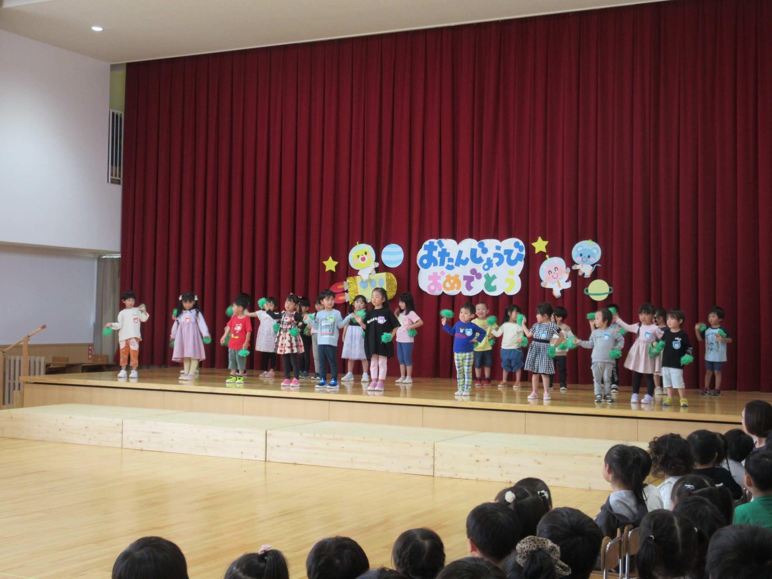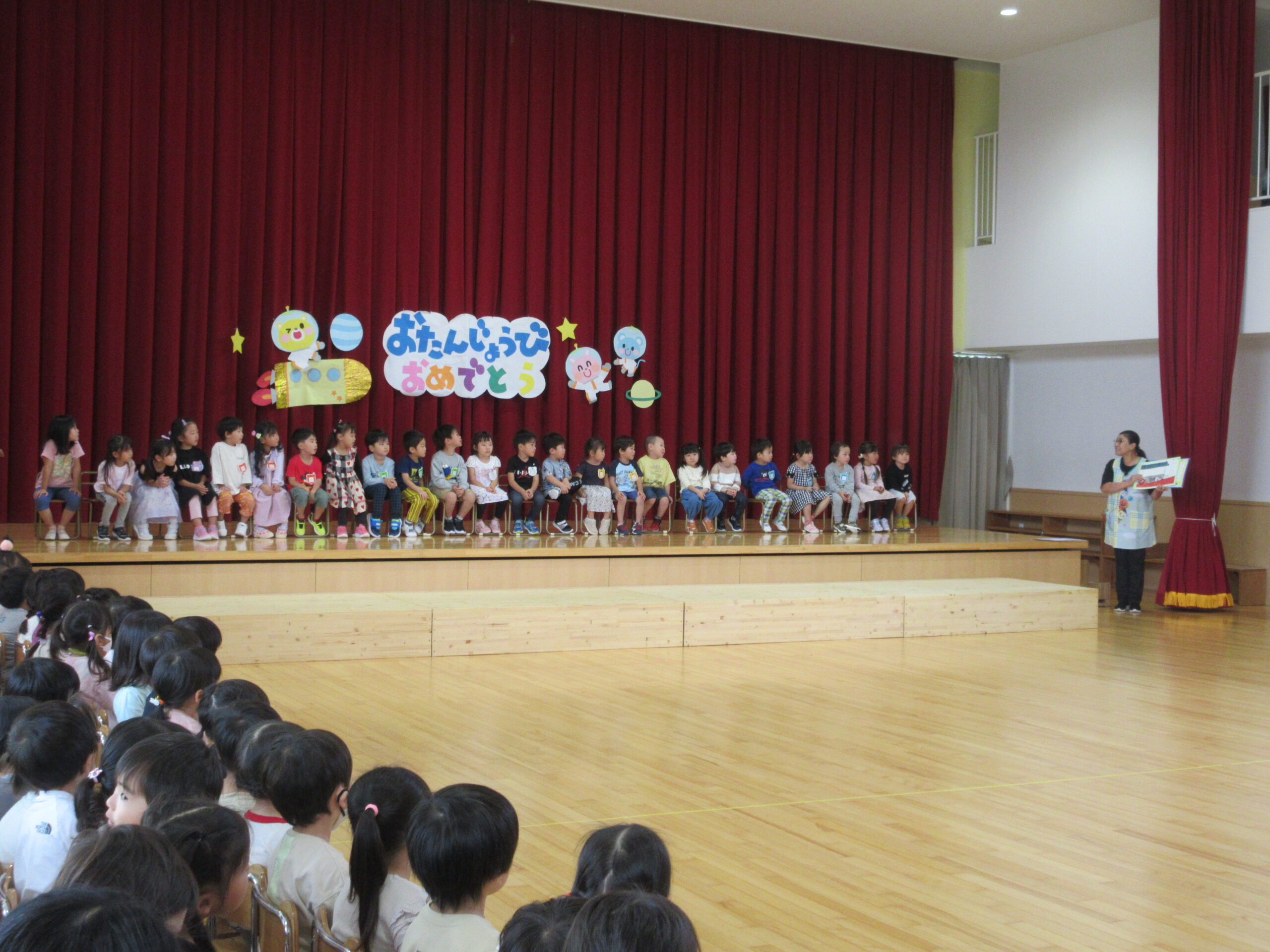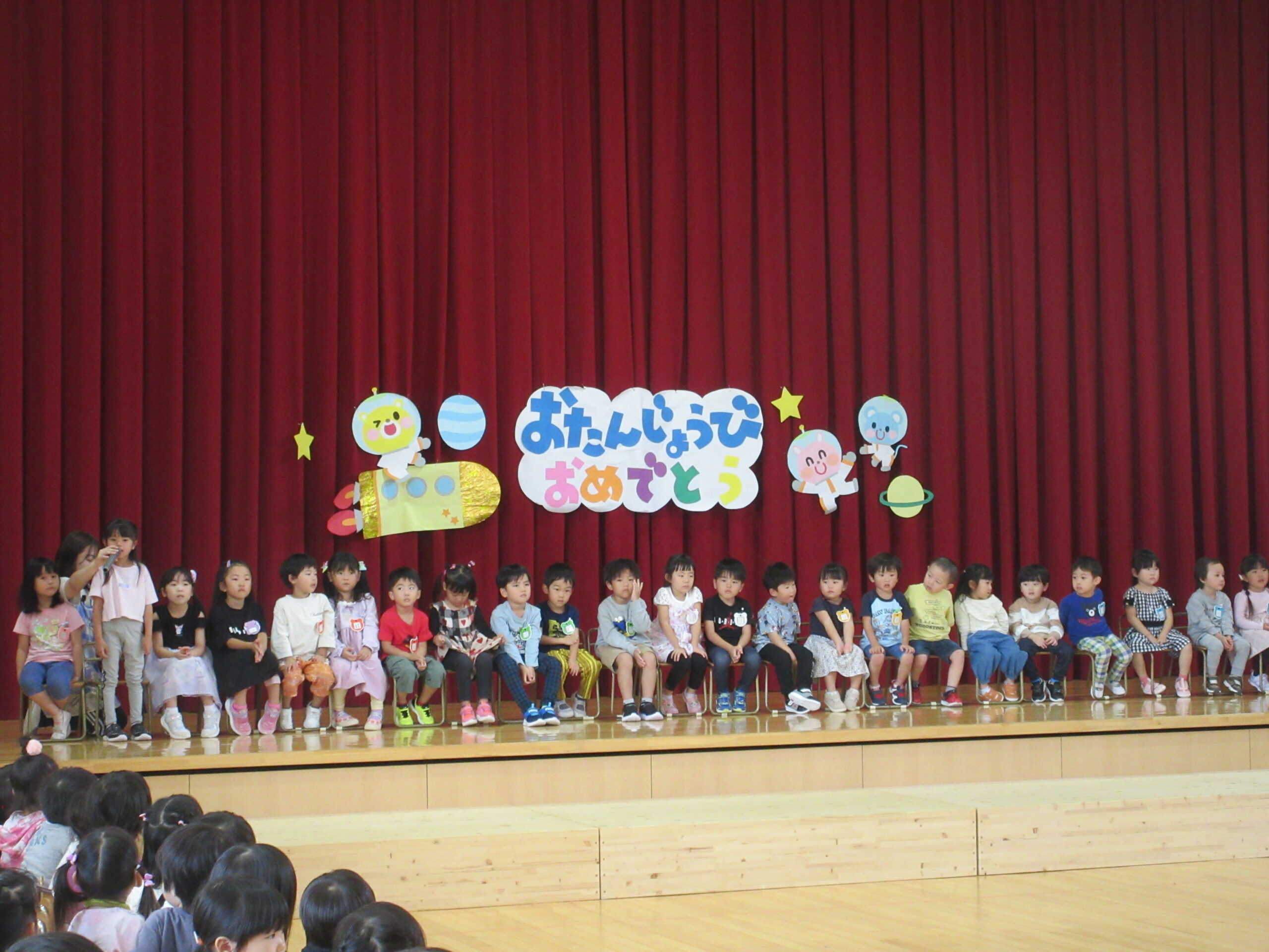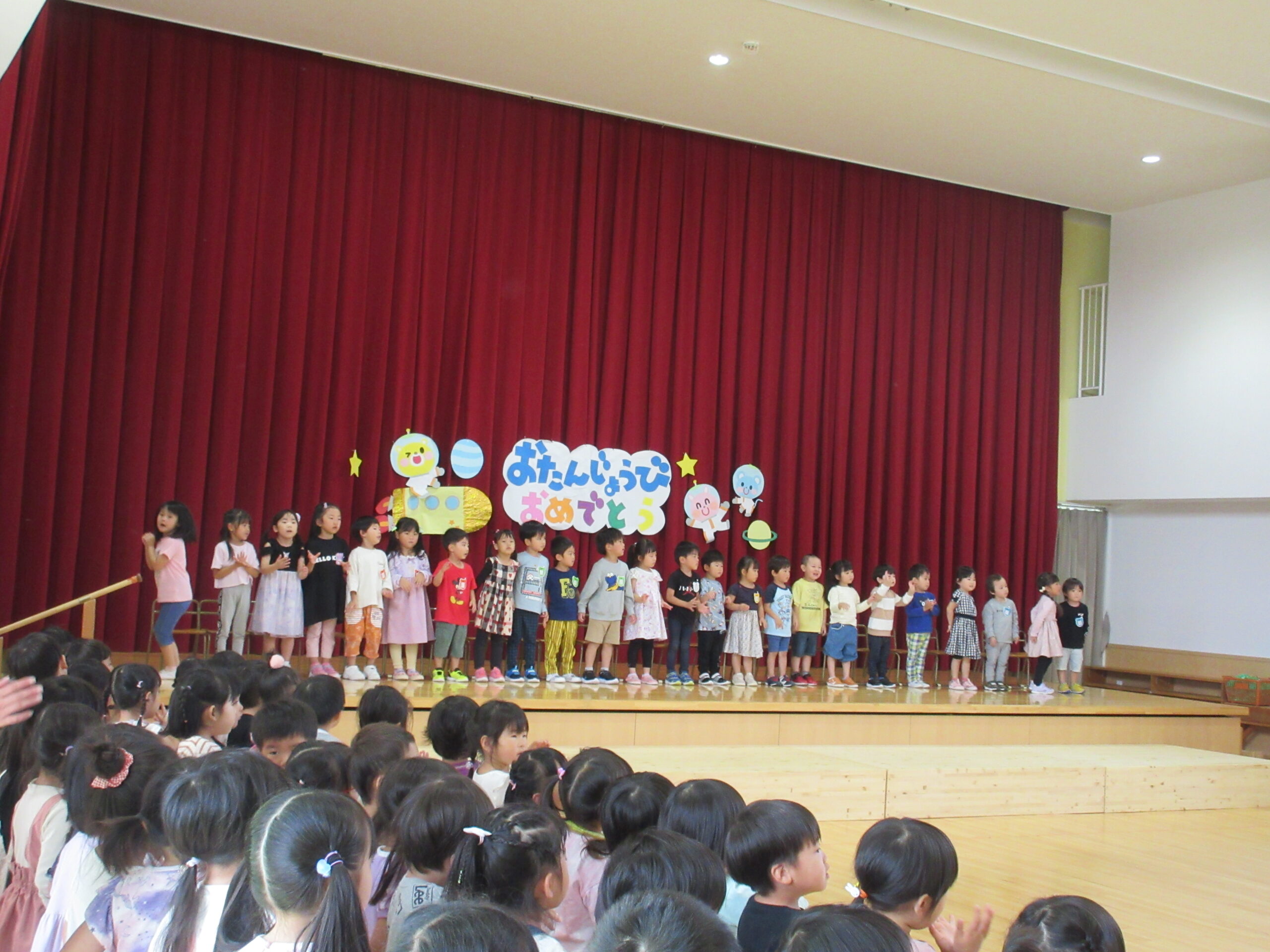 (78)令和6年度「9月誕生会」 2024年9月30日 園内ブログ 9月30日(月)は9月生まれ24名の誕生会を実施しました。人数が多い状況でしたが一列に並び元気良い自己紹介ができました。また、遊戯「ヘイ!タンブリン」は前後入れ替えをしながら「ヘイ!」と声をだしながらタンブリンをイメージしてリズムよく踊り可愛らしい姿が見られていました。誕生会後は全園児での爆弾ゲームをルールを守りながら意欲的に参加していました。 今日の病気欠席者は、鼻水1名、腹痛・下痢1名、胃腸炎1名、大事をとって1名です。 🍙今日の給食とケーキ🍰