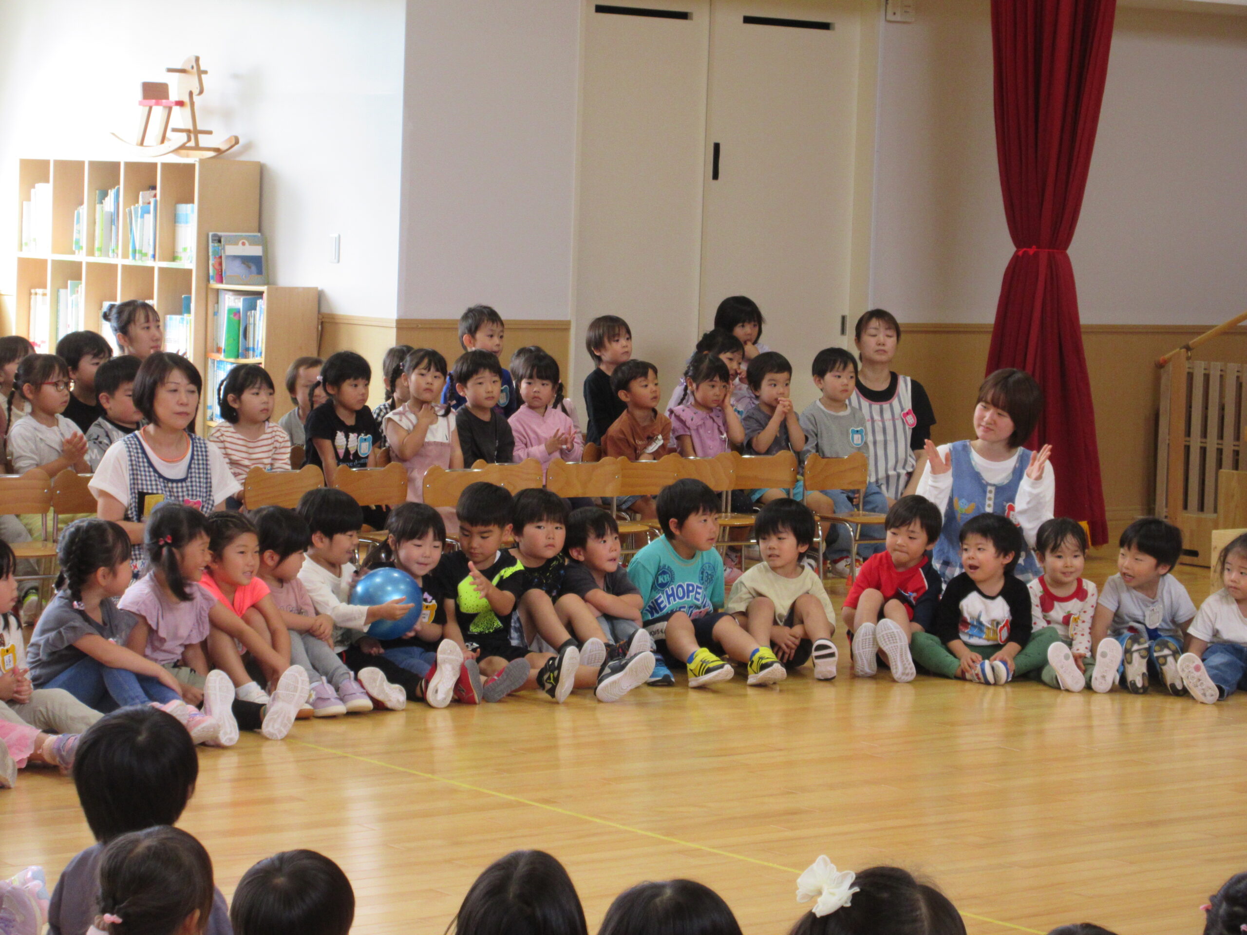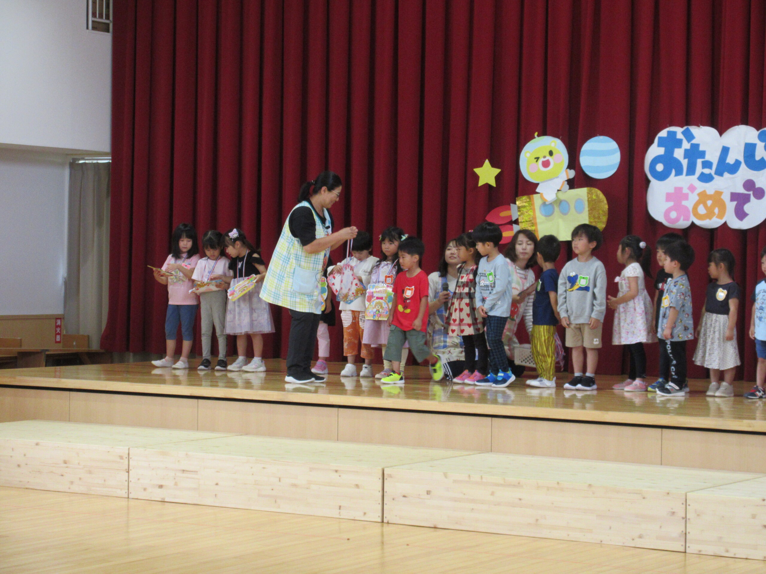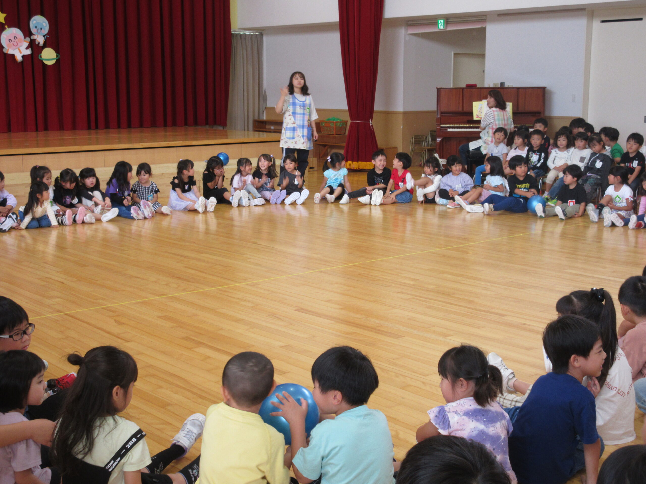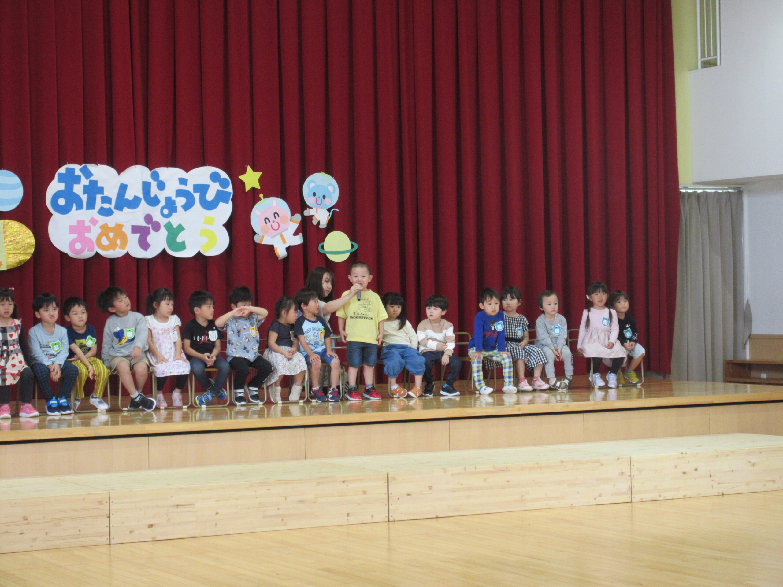 (78)令和6年度「9月誕生会」 2024年9月30日 園内ブログ 9月30日(月)は9月生まれ24名の誕生会を実施しました。人数が多い状況でしたが一列に並び元気良い自己紹介ができました。また、遊戯「ヘイ!タンブリン」は前後入れ替えをしながら「ヘイ!」と声をだしながらタンブリンをイメージしてリズムよく踊り可愛らしい姿が見られていました。誕生会後は全園児での爆弾ゲームをルールを守りながら意欲的に参加していました。 今日の病気欠席者は、鼻水1名、腹痛・下痢1名、胃腸炎1名、大事をとって1名です。 🍙今日の給食とケーキ🍰