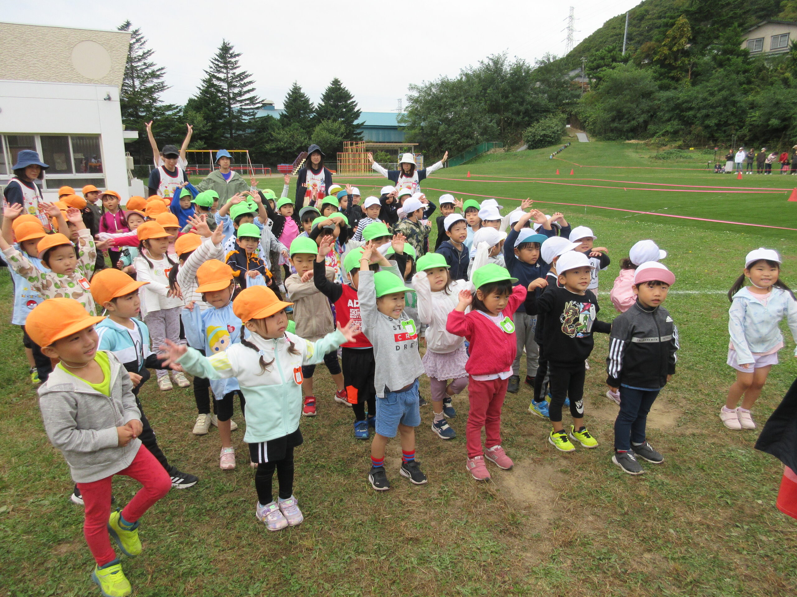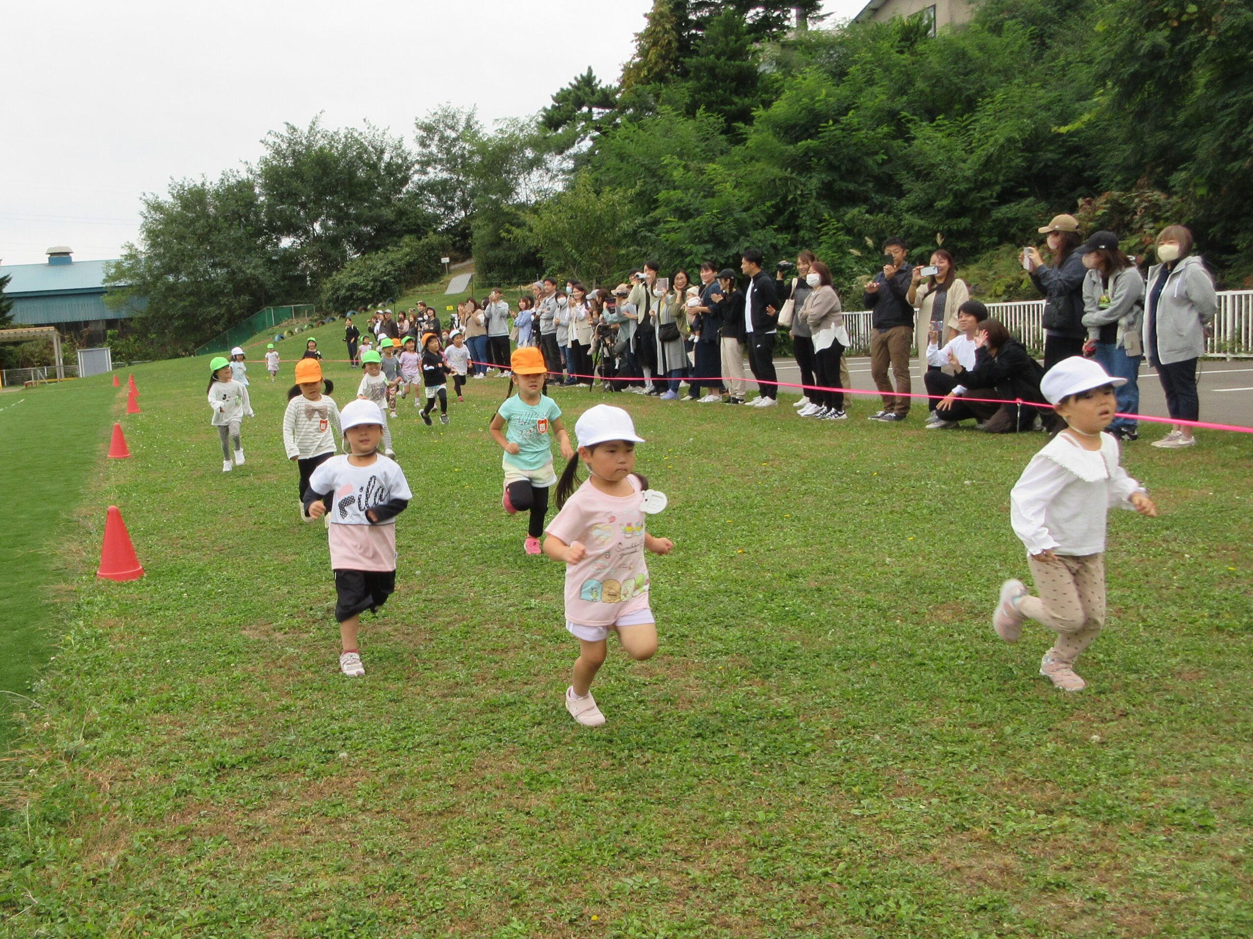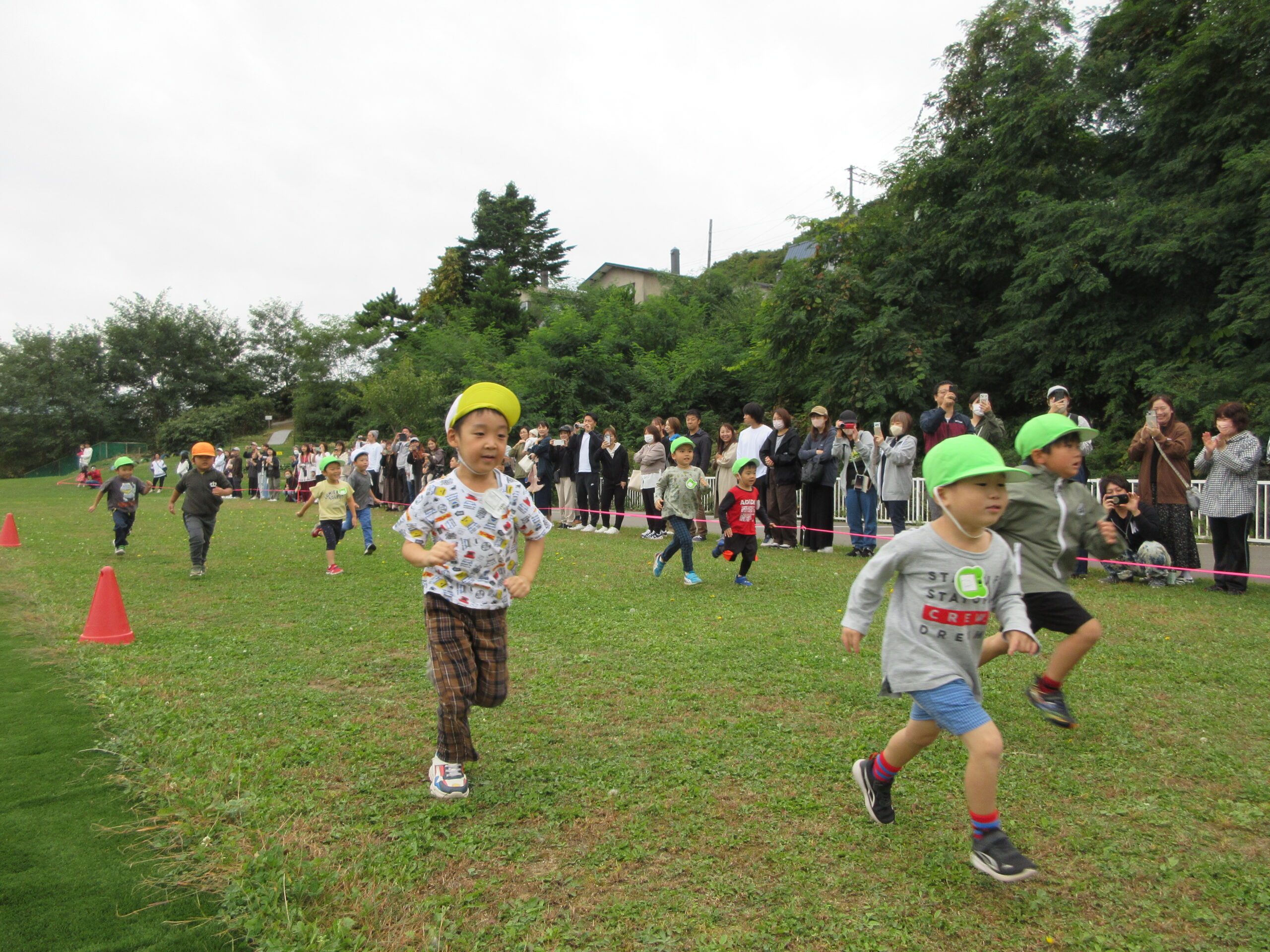 (80)令和6年度「年中学年 マラソン大会」 2024年10月3日 園内ブログ 本日10月3日(木)は年中学年のマラソン大会を実施しました。2学期に入り各学年毎にマラソン練習を開始していましたが、年中学年は年少での経験を活かし取り組むことができたのではないでしょうか。距離が長くなったことで辛い気持ちになる子もいましたが、それぞれのペースでゴール目指して最後まで一生懸命走り切ることができました。みんなよく頑張りましたね!応援にお越しの保護者の皆様、有難うございました。 今日の病気欠席者は発熱2名、鼻水1名、腹痛・下痢1名です。 🍙今日の給食🍙