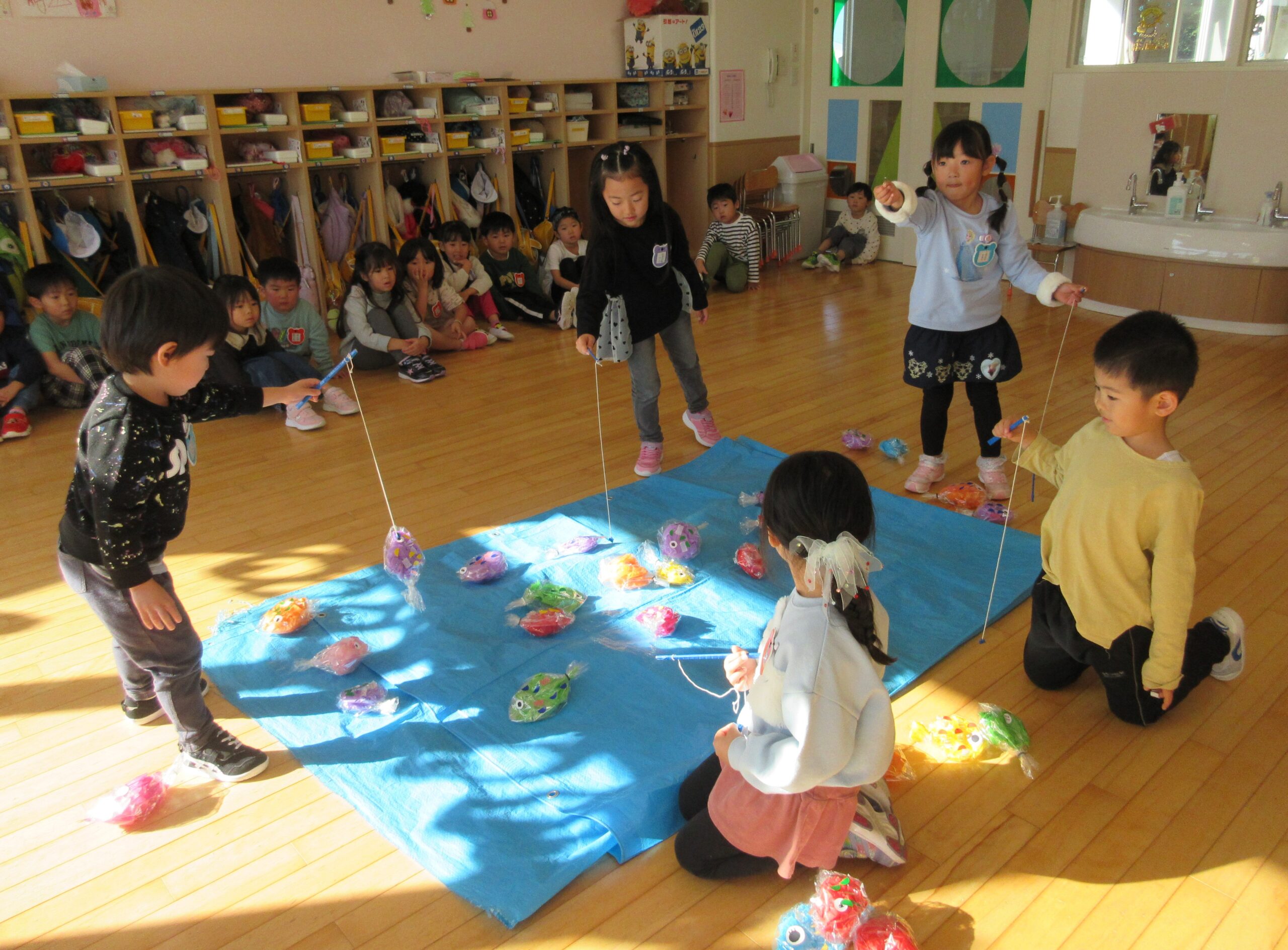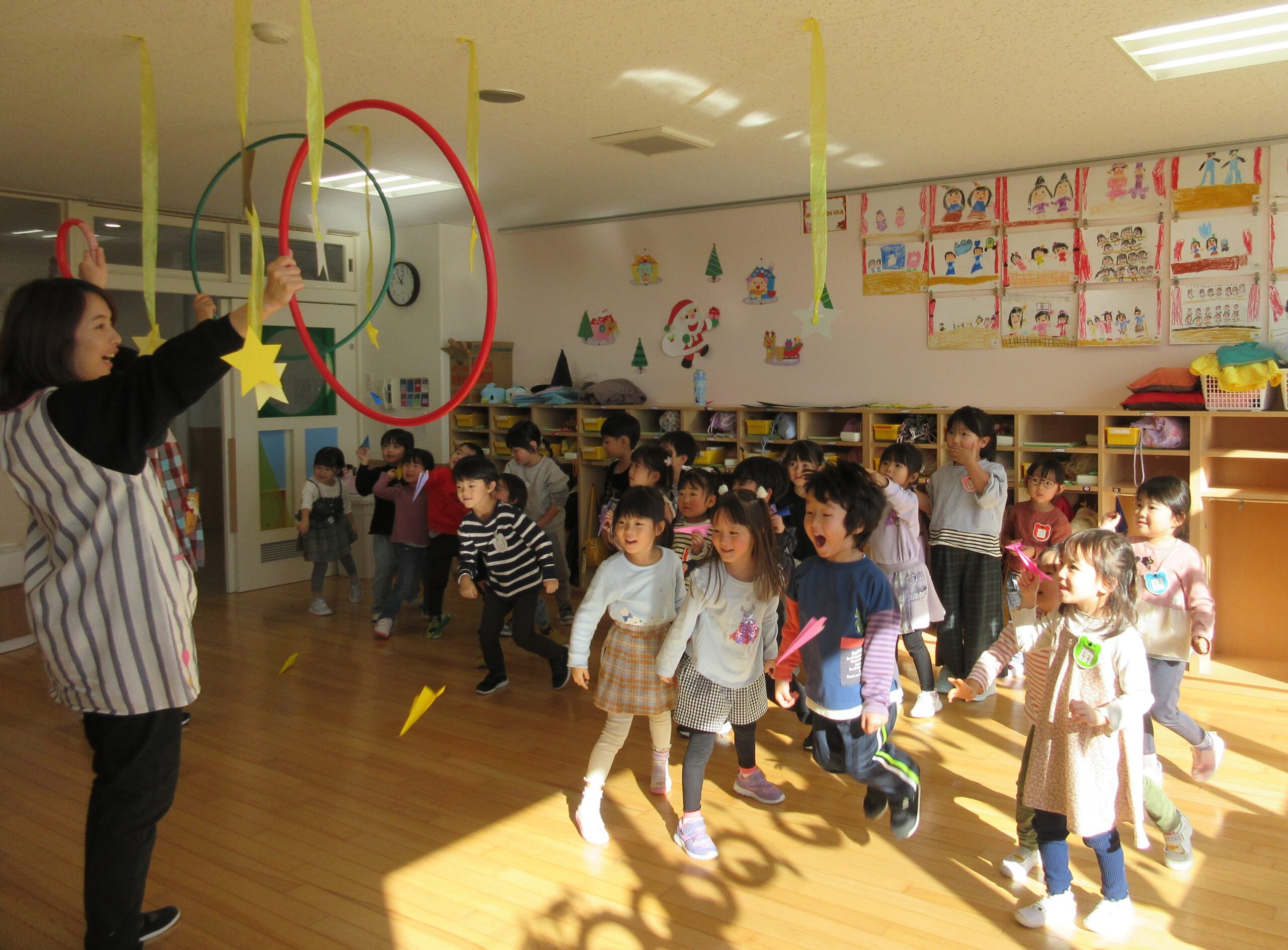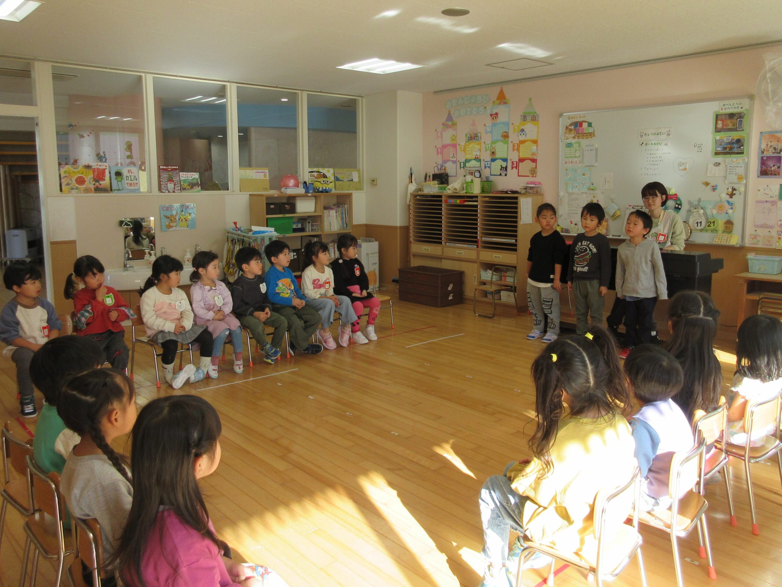 11月20・21日の2日間で縦割り保育を実施しました。20日(水)は初日であることから不安を抱く子が多く、特に年少学年は少々不安定になっていた様子の子もみられました。年少から年長まで混合の9クラスとなり、お部屋移動しながら活動に取り組んでいます。朝の会のお当番活動から始まり年長さんの頼もしい姿に刺激を受けた年少、年中さんでした。また、2日目は昨日の経験から慣れた様子も伺われ、クラス移動する子ども達の足取りも軽く、移動する楽しみや交流する楽しみと、各クラス活動で胸が弾んでいたようです。それぞれの立場で充実した2日間を過ごしました。