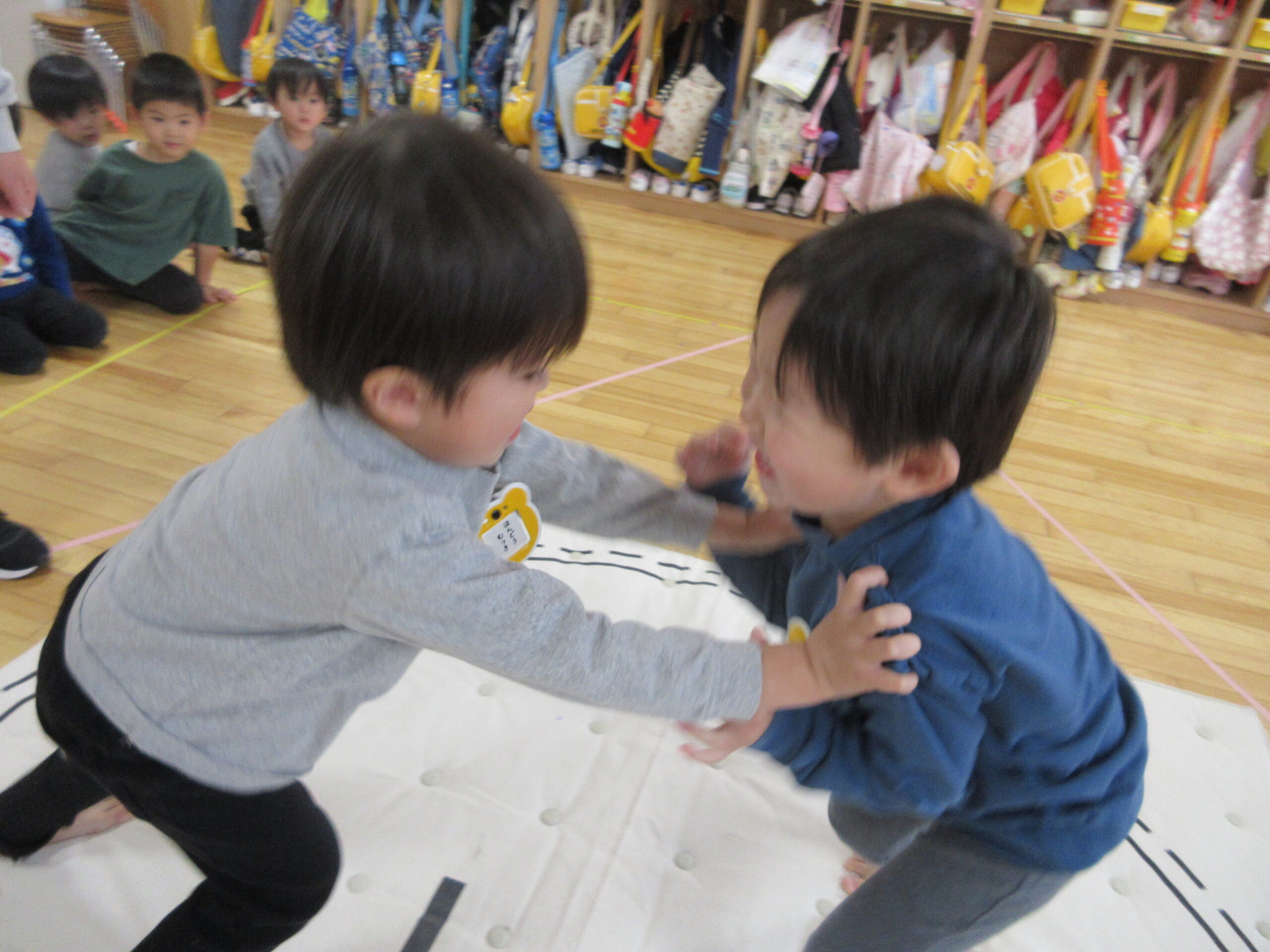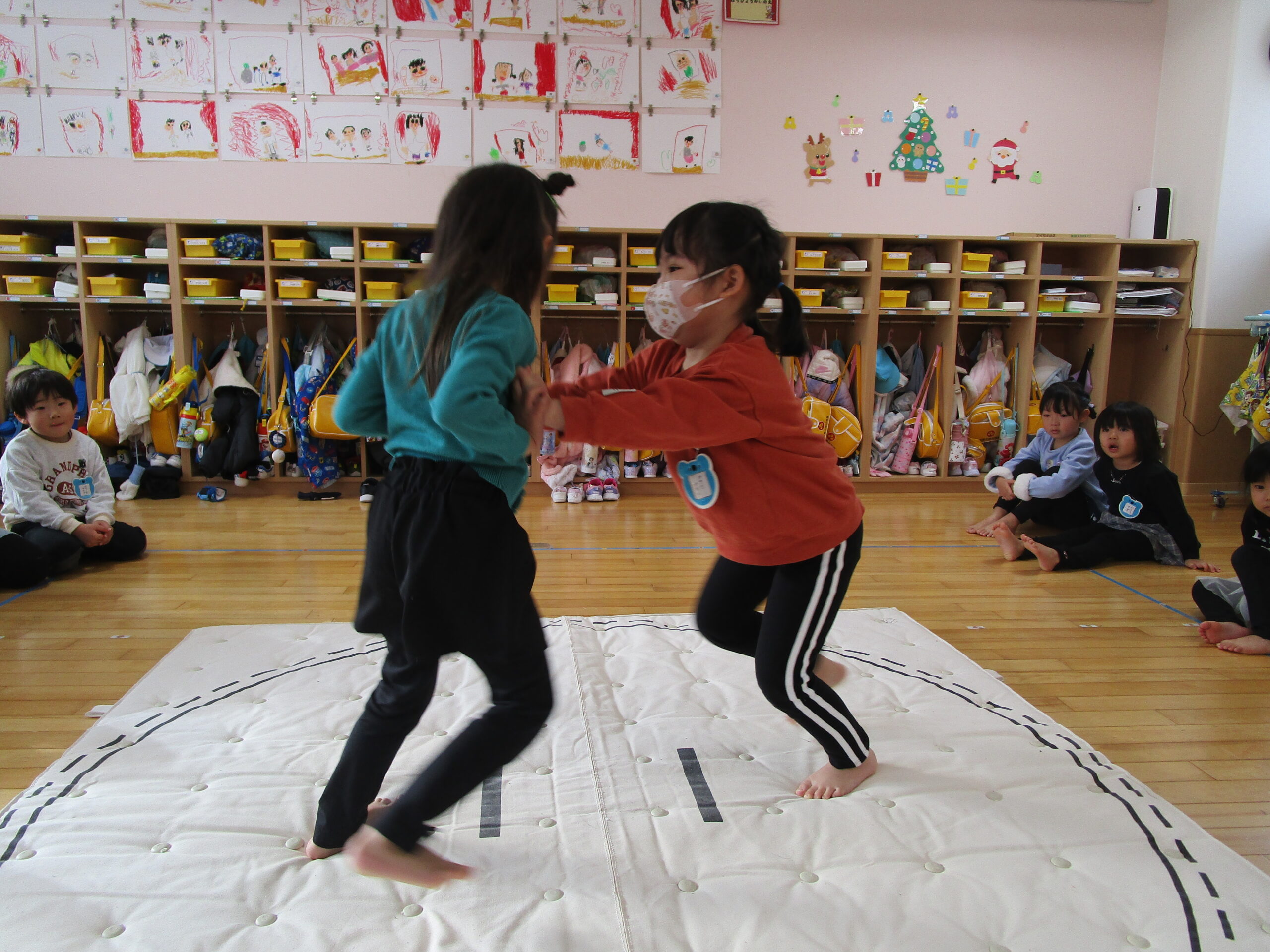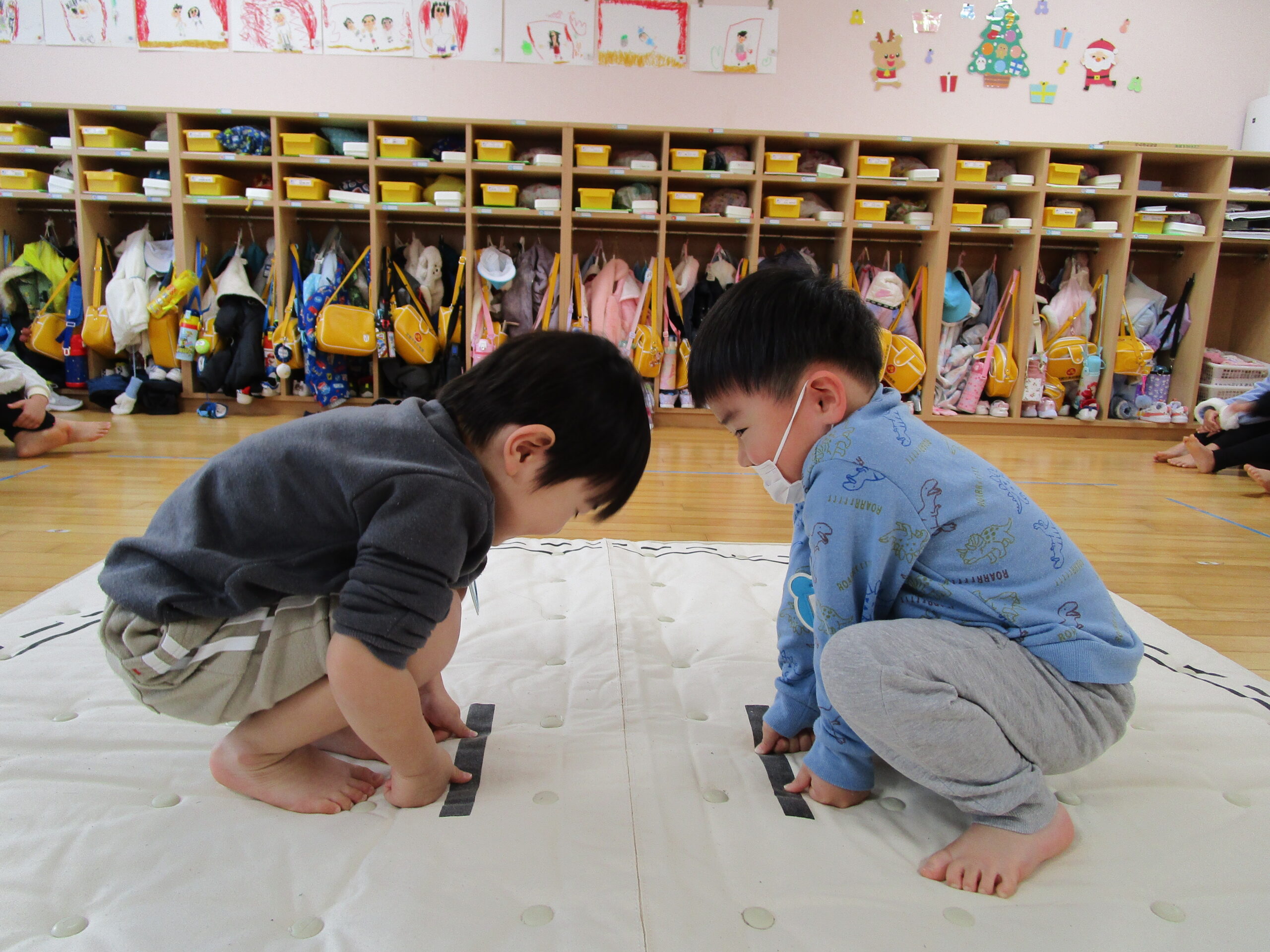 本日は年少学年2回目のお相撲大会でした。朝から「お家で練習してきたよ!」「今日は負けないぞ」と気合十分なお友達がたくさんいました。試合が始まるとルールを思い出しながら、土俵から出ないように意識して取り組む姿も見られていました。毎日楽しみながらたくさん体力を付けてきた年少さん。前回よりも力が付いてきたお友達が多く接戦を繰り広げていました。3学期は全クラス合同でホールにて行います。他のクラスのお友達と戦うのは初めてで緊張すると思い、楽しんで取り組みたいです♪