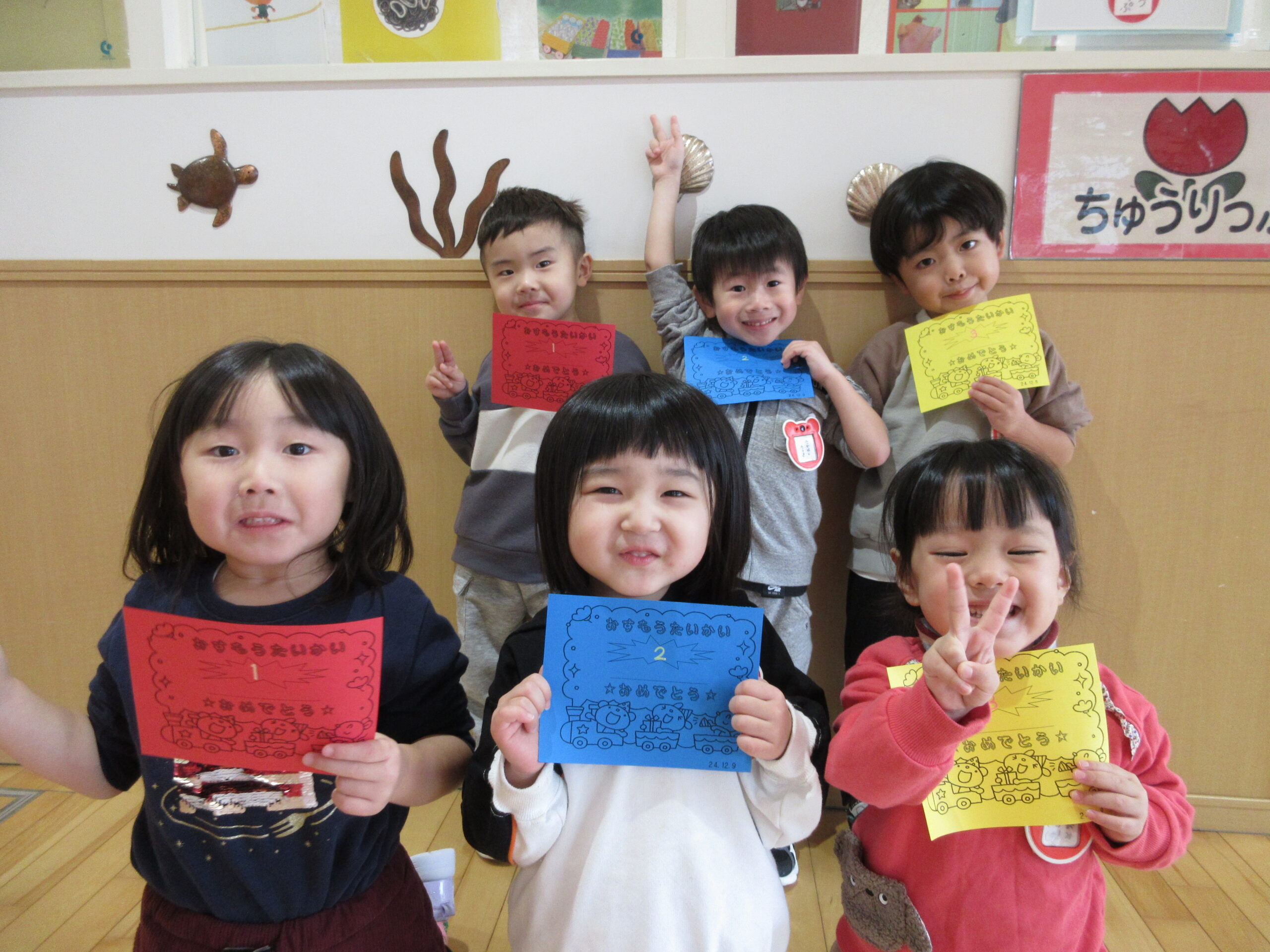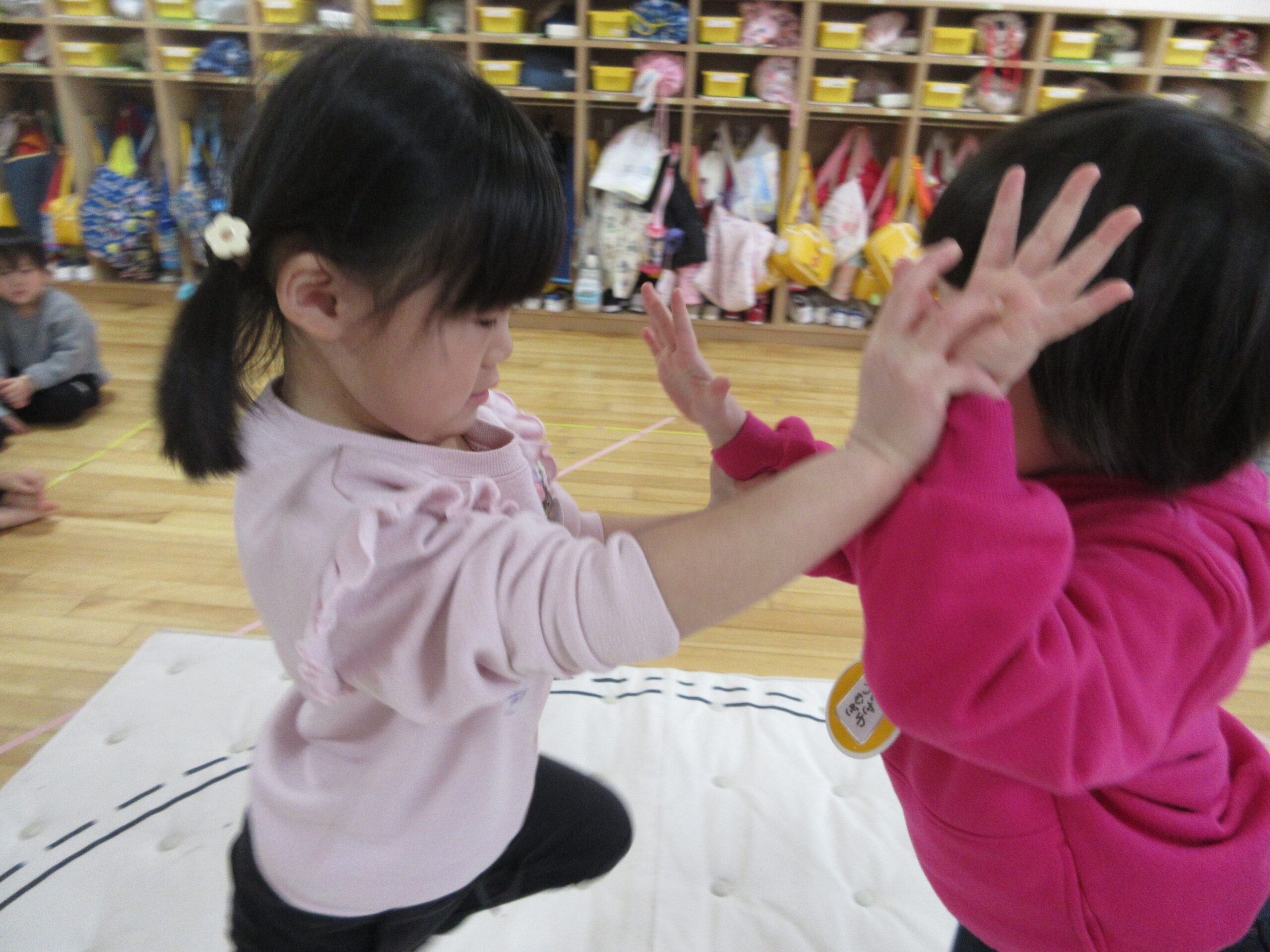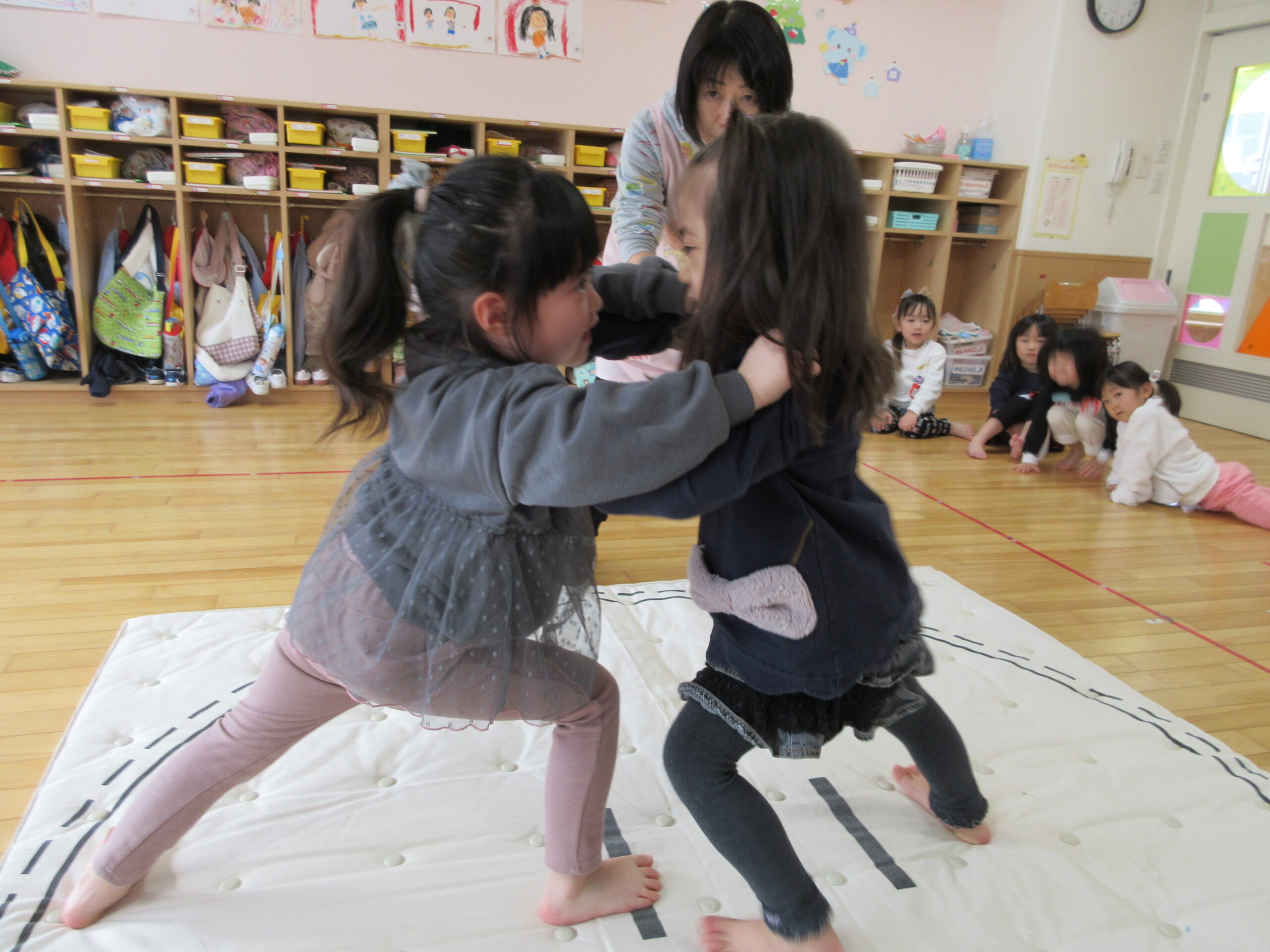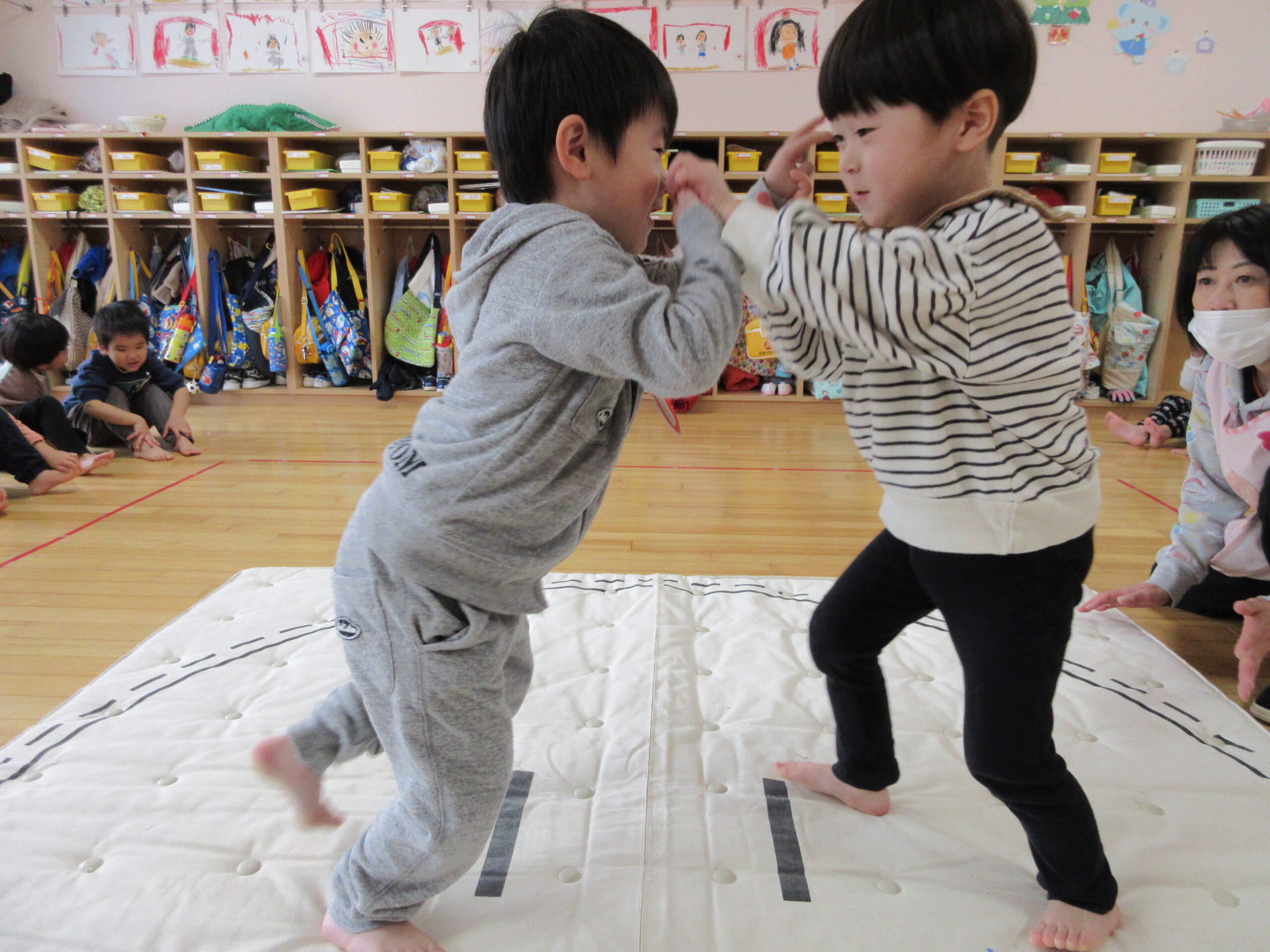 本日は年少学年2回目のお相撲大会でした。朝から「お家で練習してきたよ!」「今日は負けないぞ」と気合十分なお友達がたくさんいました。試合が始まるとルールを思い出しながら、土俵から出ないように意識して取り組む姿も見られていました。毎日楽しみながらたくさん体力を付けてきた年少さん。前回よりも力が付いてきたお友達が多く接戦を繰り広げていました。3学期は全クラス合同でホールにて行います。他のクラスのお友達と戦うのは初めてで緊張すると思い、楽しんで取り組みたいです♪