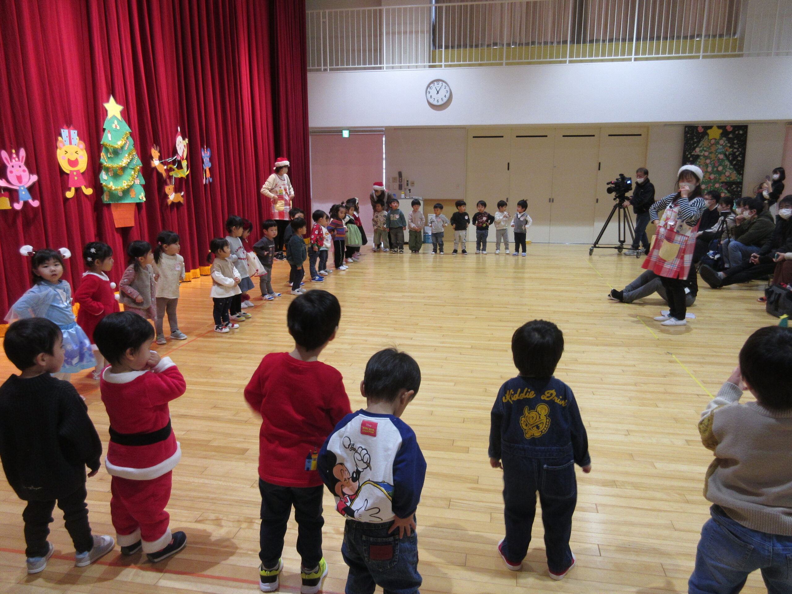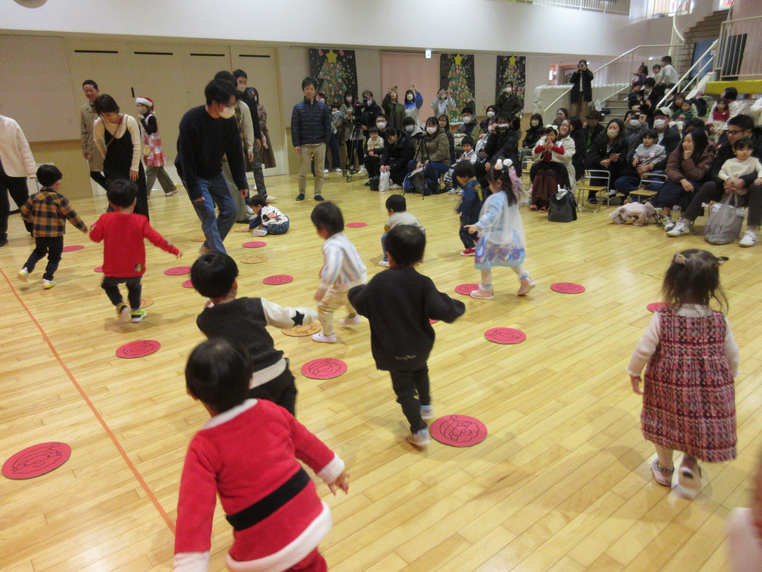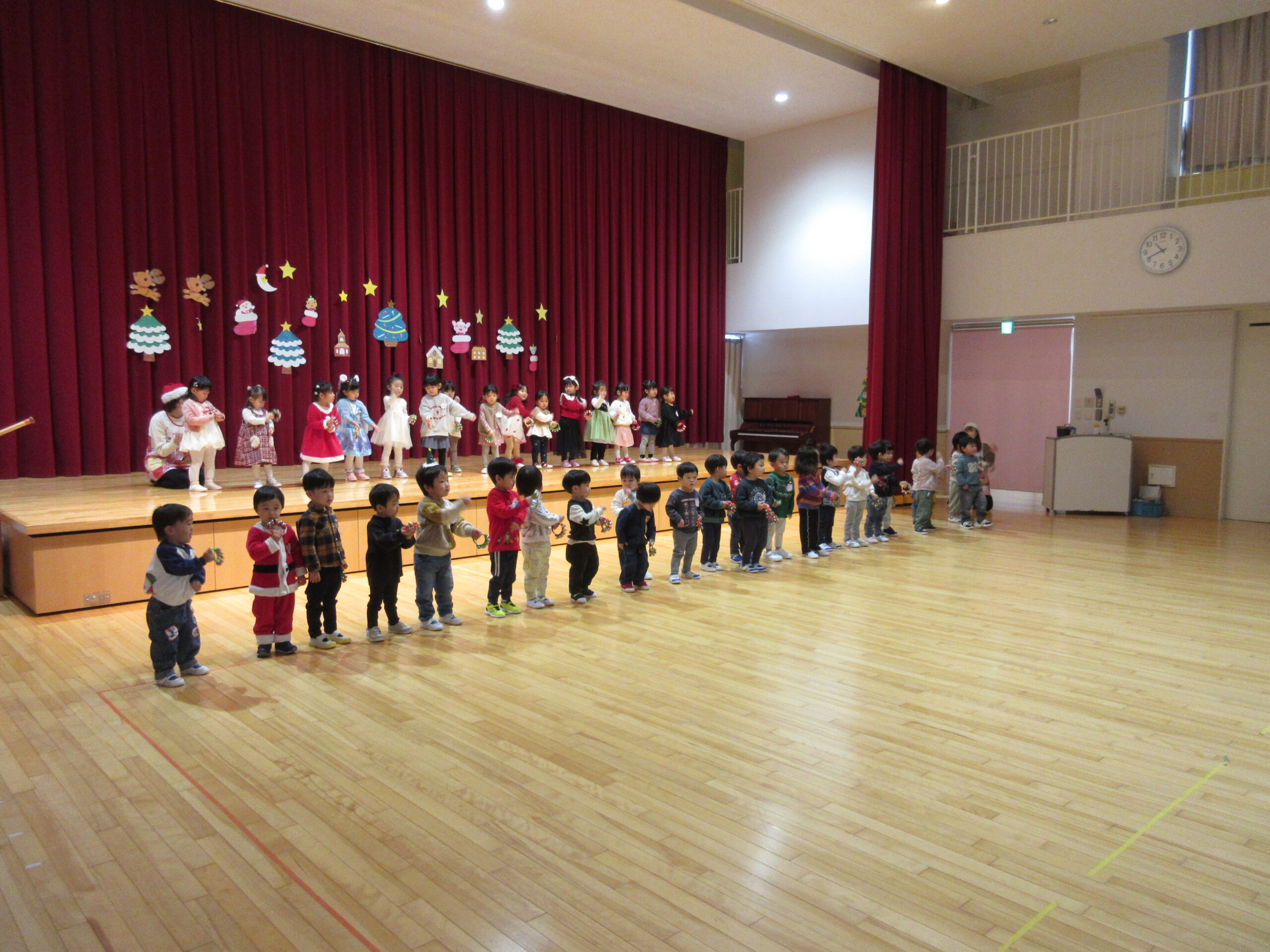 本日12月17日(火)プレスクールのクリスマス会をホールにて3クラス合同で実施いたしました。短い時間ではありましたが、手話歌や器楽を披露し、サンタさんとの交流や親子対抗オセロゲームを楽しむことができました🎅